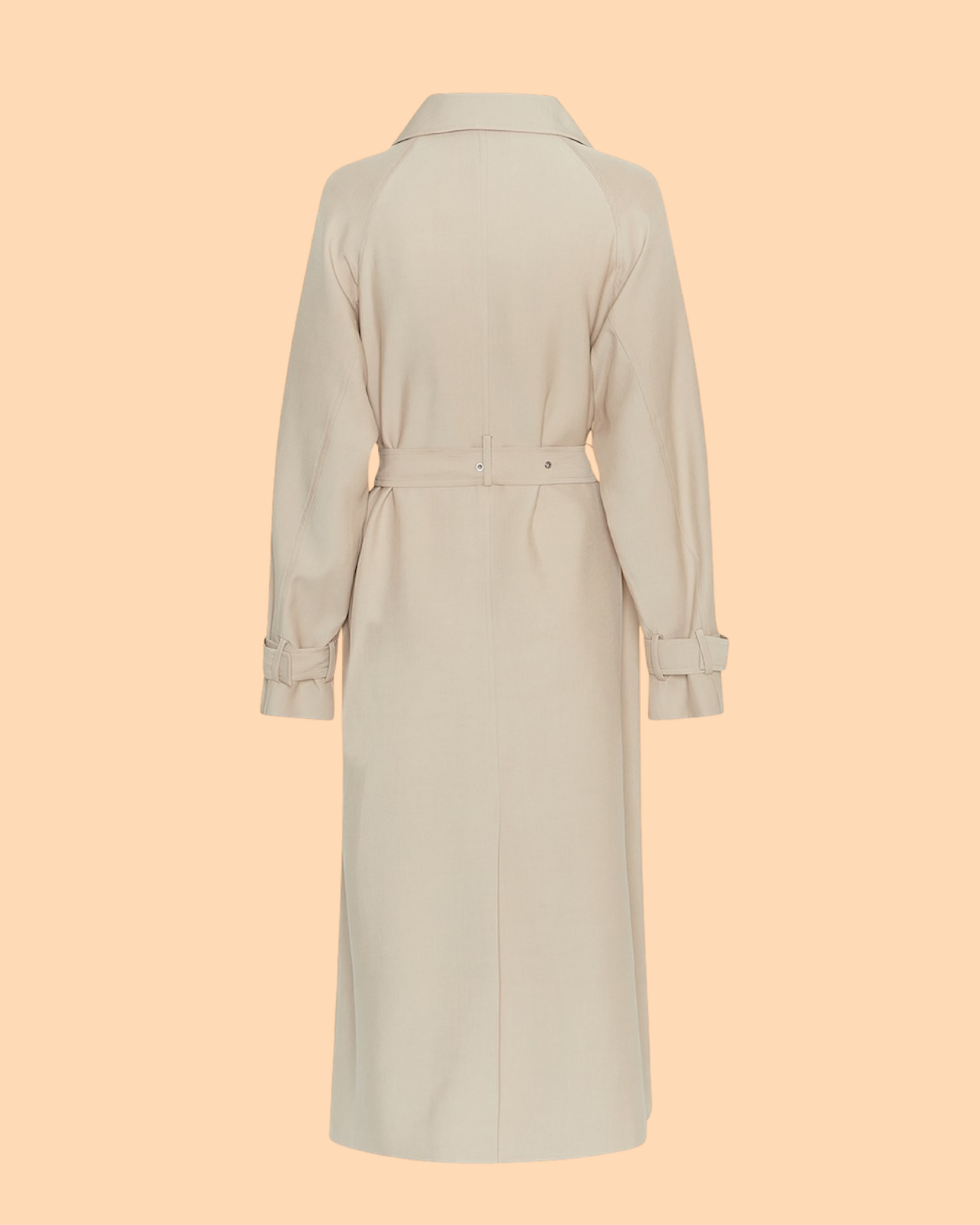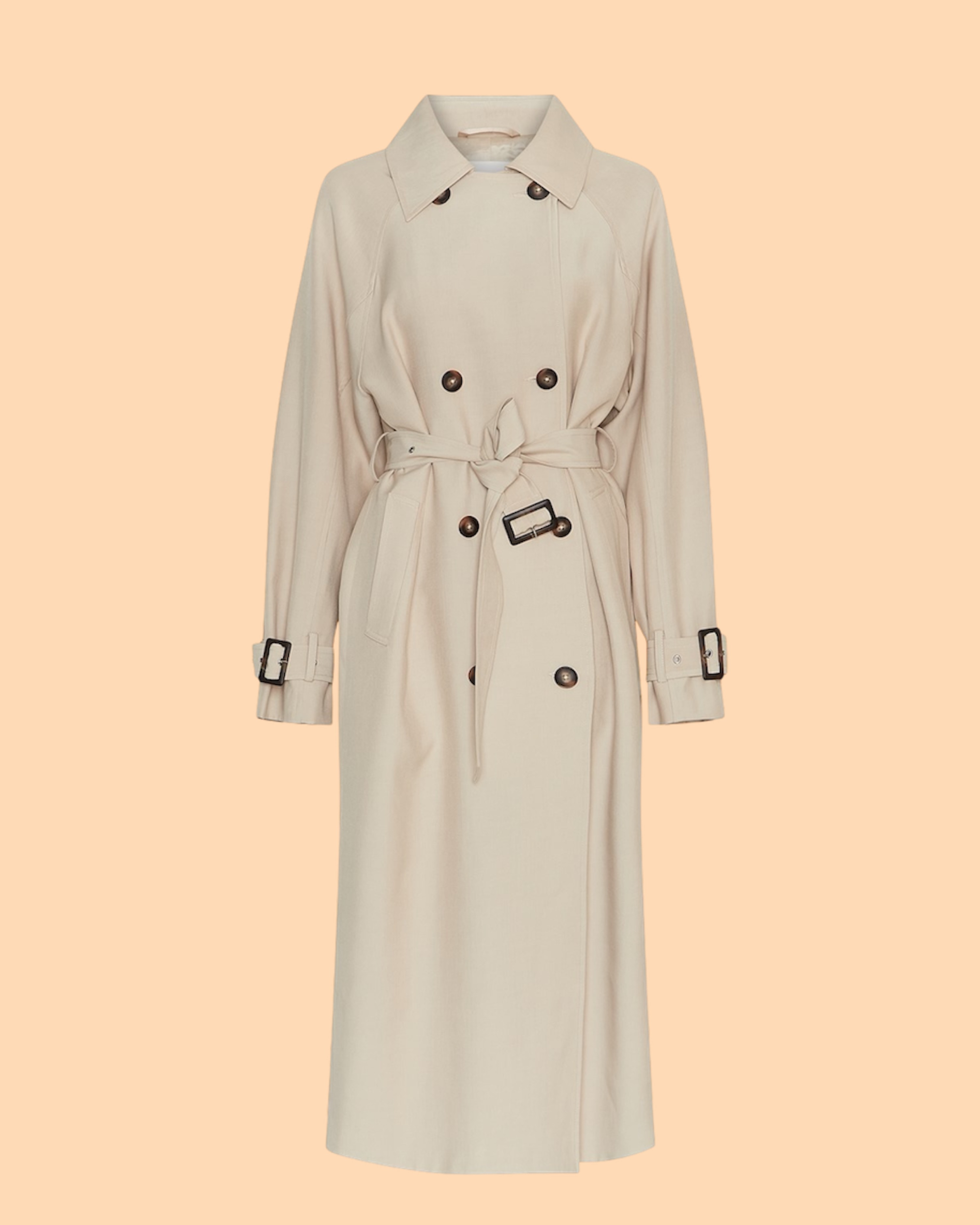 Der Antonella Trench Coat Safari von MSCH COPENHAGEN ist ein klassischer Trenchcoat in beige mit Raglanärmeln, Gürtel und aufgesetzten Leistentaschen.
