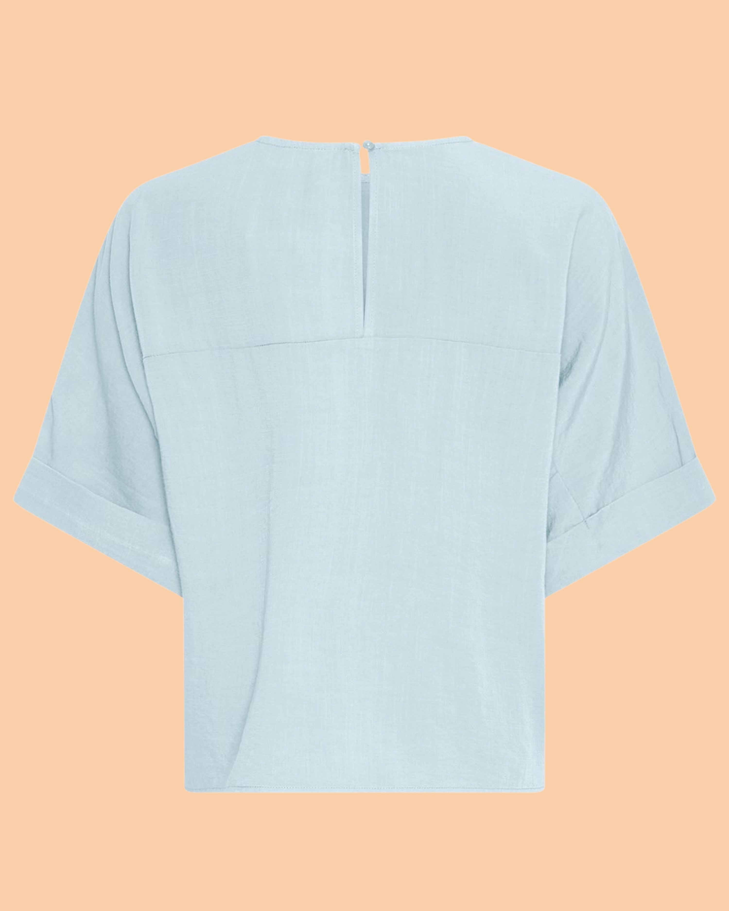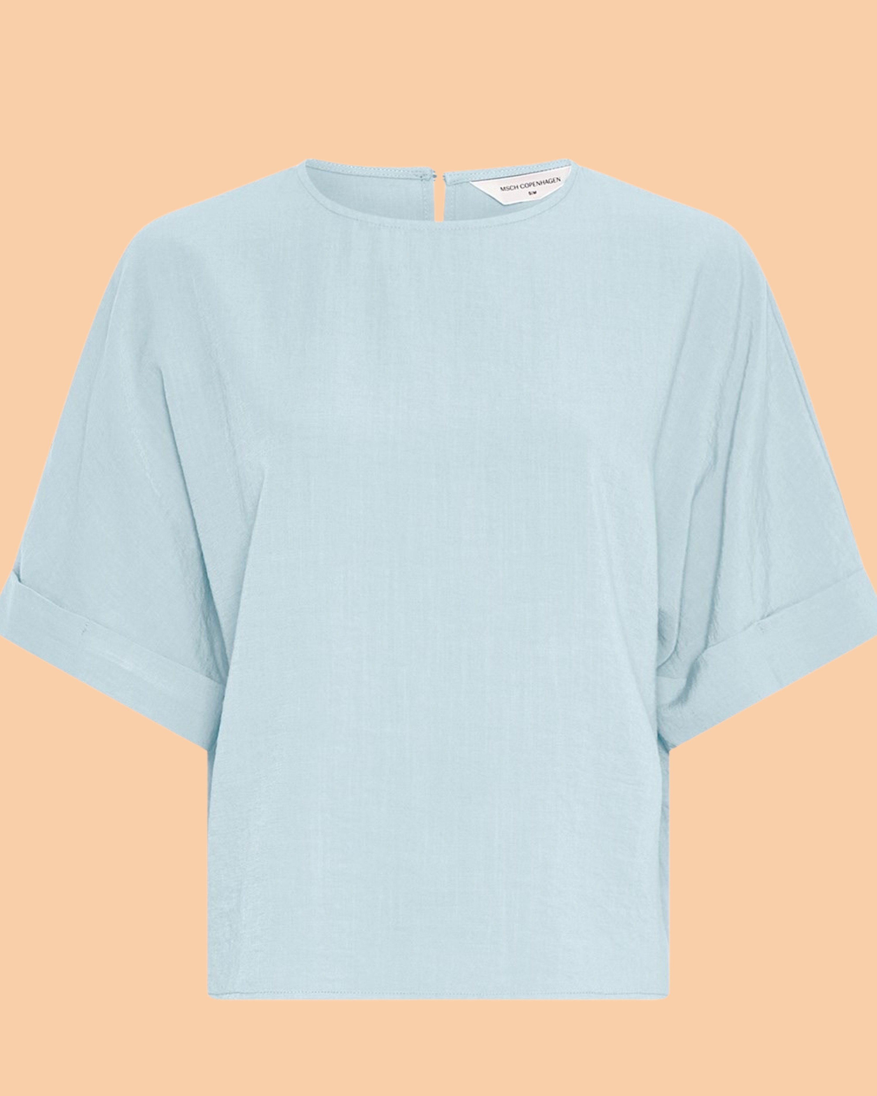Das Daria 2/4 Top Summer Song Melange von MSCH COPENHAGEN ist ein kurzärmliges Top in leichter Webqualität mit Rundhalsausschnitt, Knopfverschluss im Nacken, leiner ockeren Silhouette mit breiten Ärmeln und umgeschlagenen Kanten.