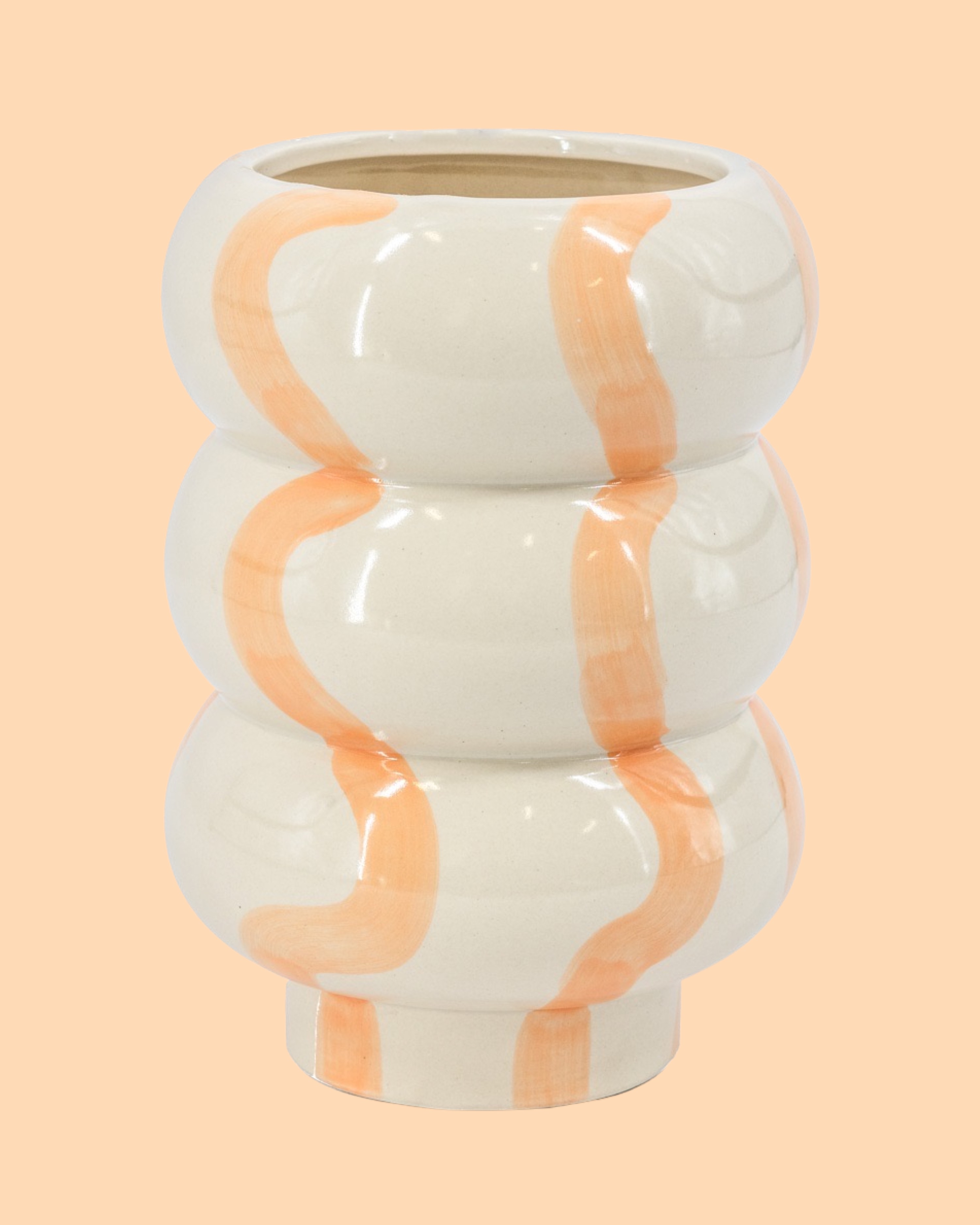 Die Dekovase Lines peach groß fügt sich besonders schön in alle Vanilla Homes ein. Das pastellige Peach harmoniert supergut mit Creme Tönen und Holz.