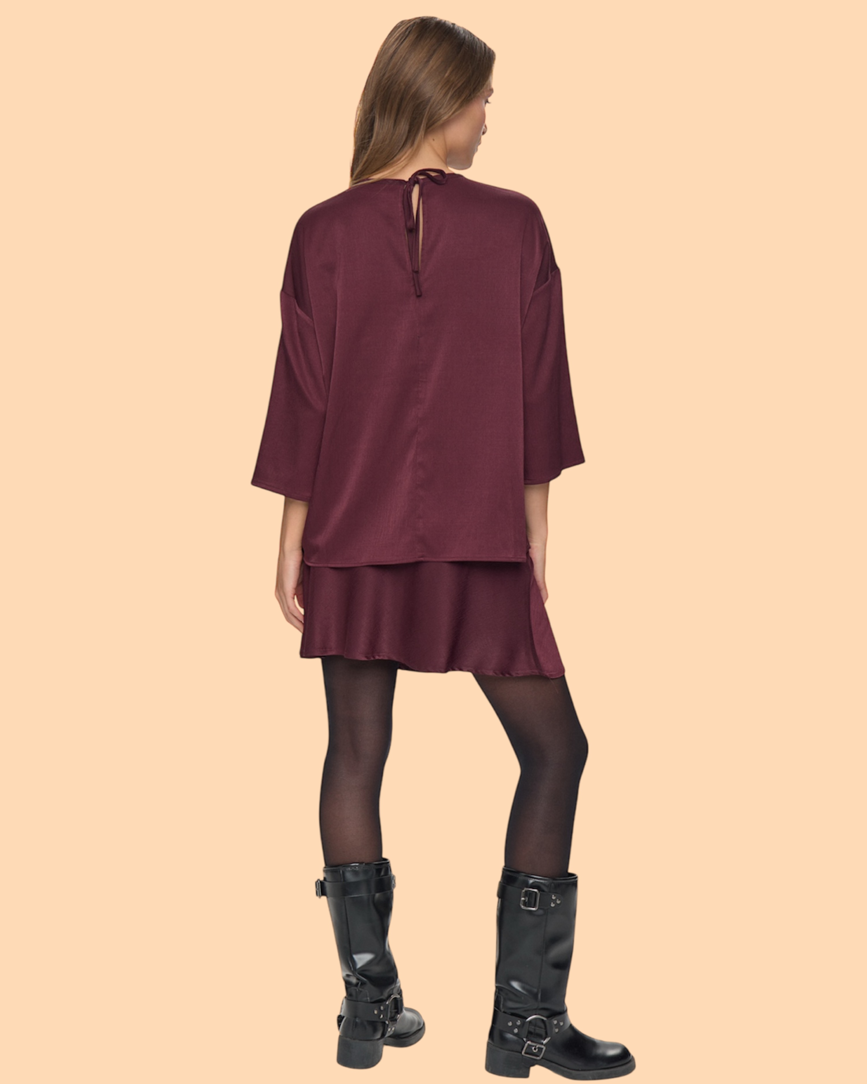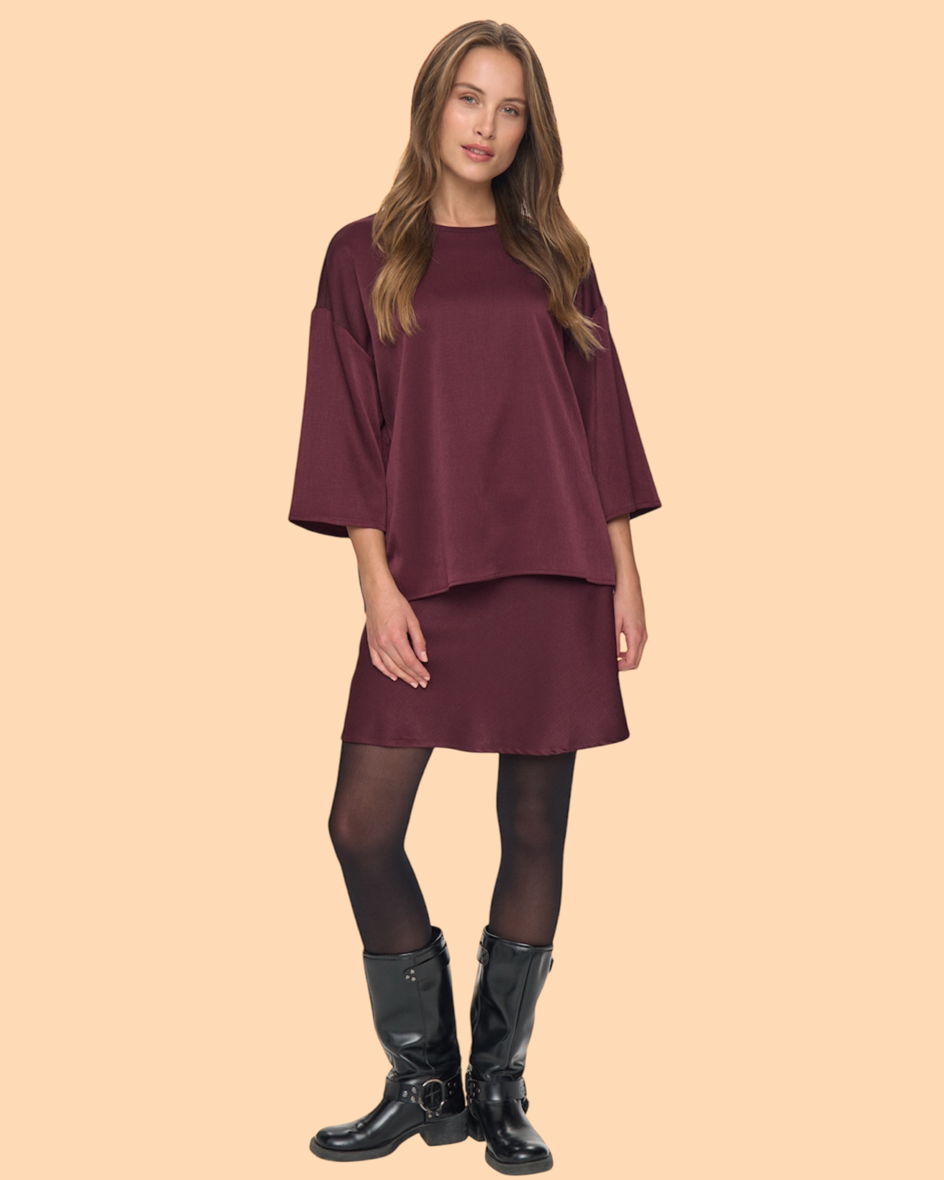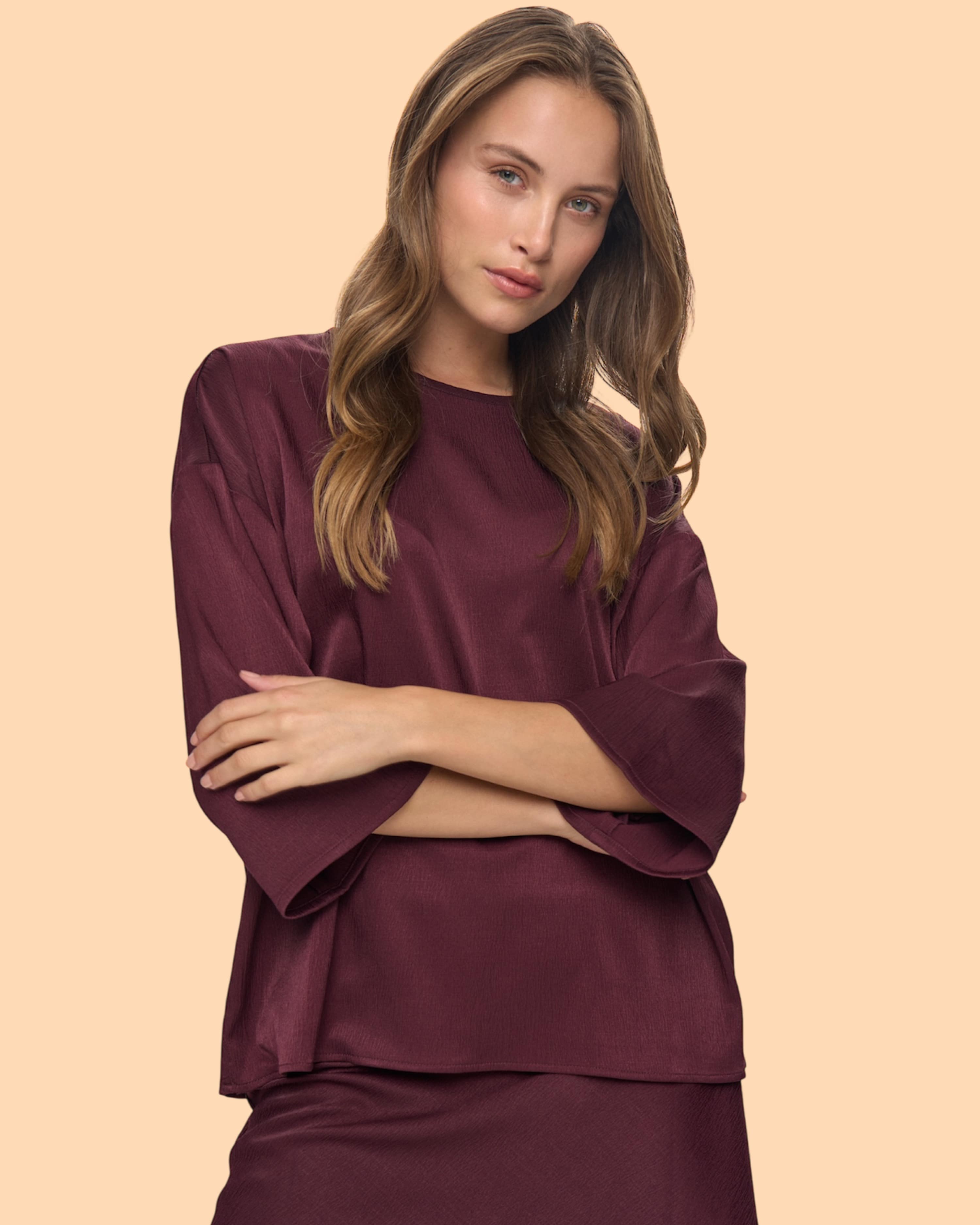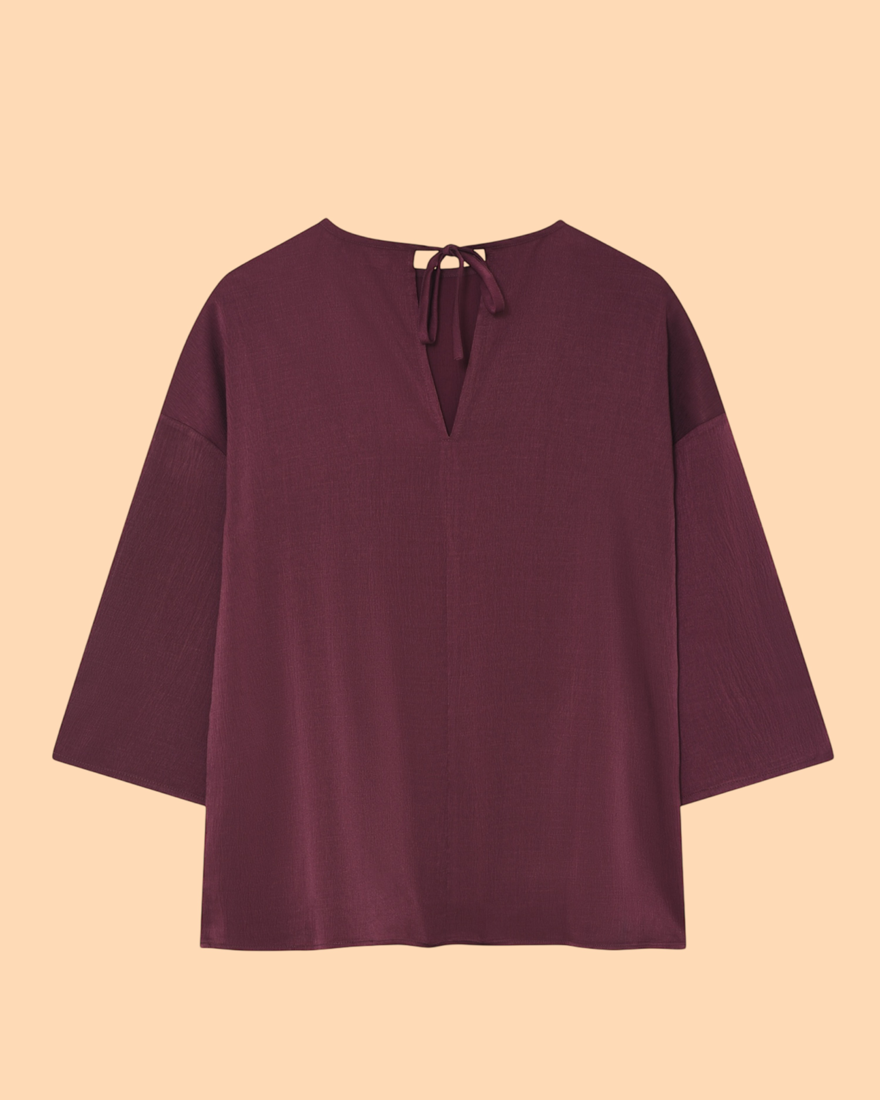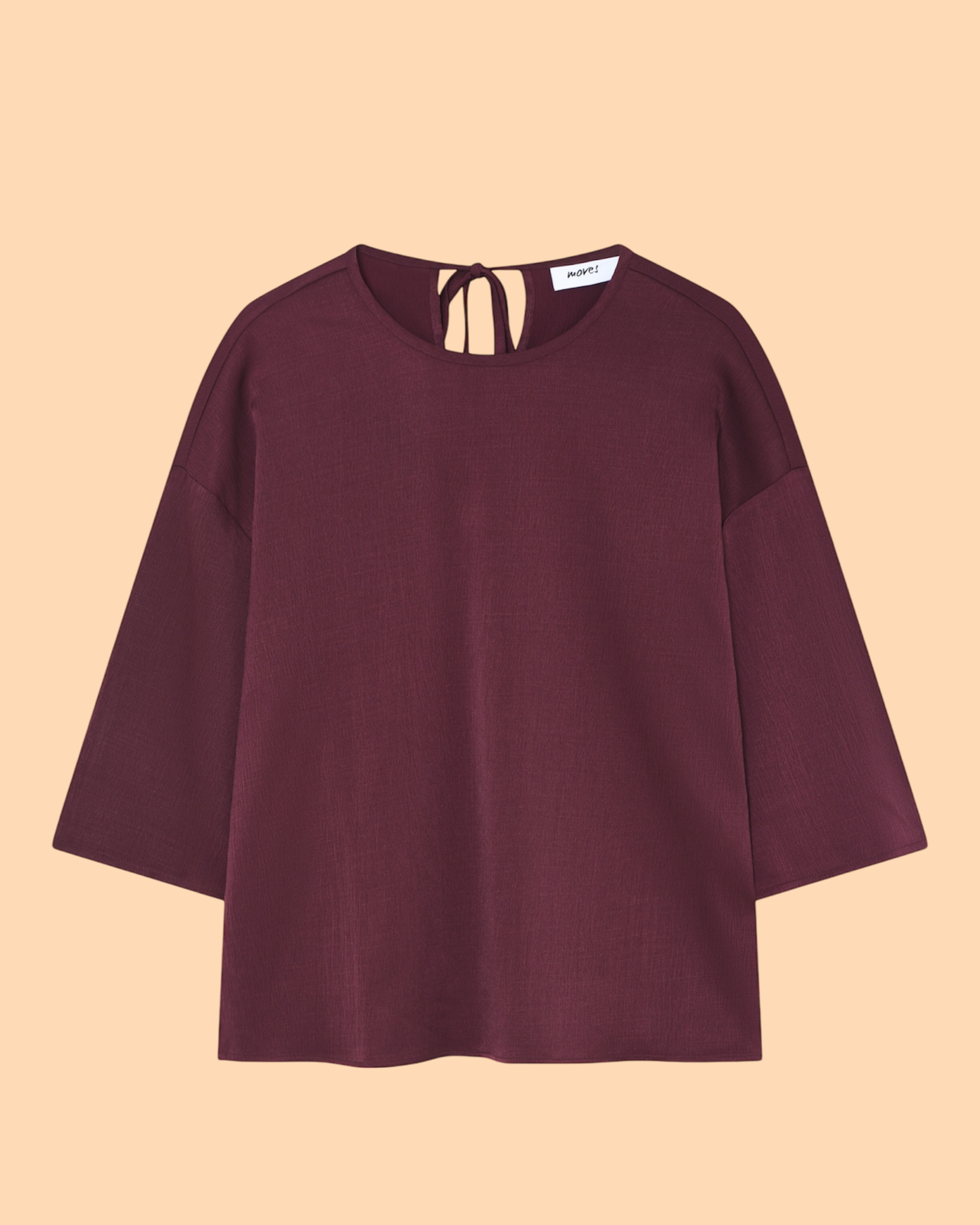 Die Eyla Blouse Fig von moves ist ein Shirt mit einer lockeren Passform, einem leichten, strukturierten Stoff, überschnittenen Schultern, weiten 3/4 Ärmeln und einem Rundhalsausschnitt mit einem schönen Cut Out am Rücken.