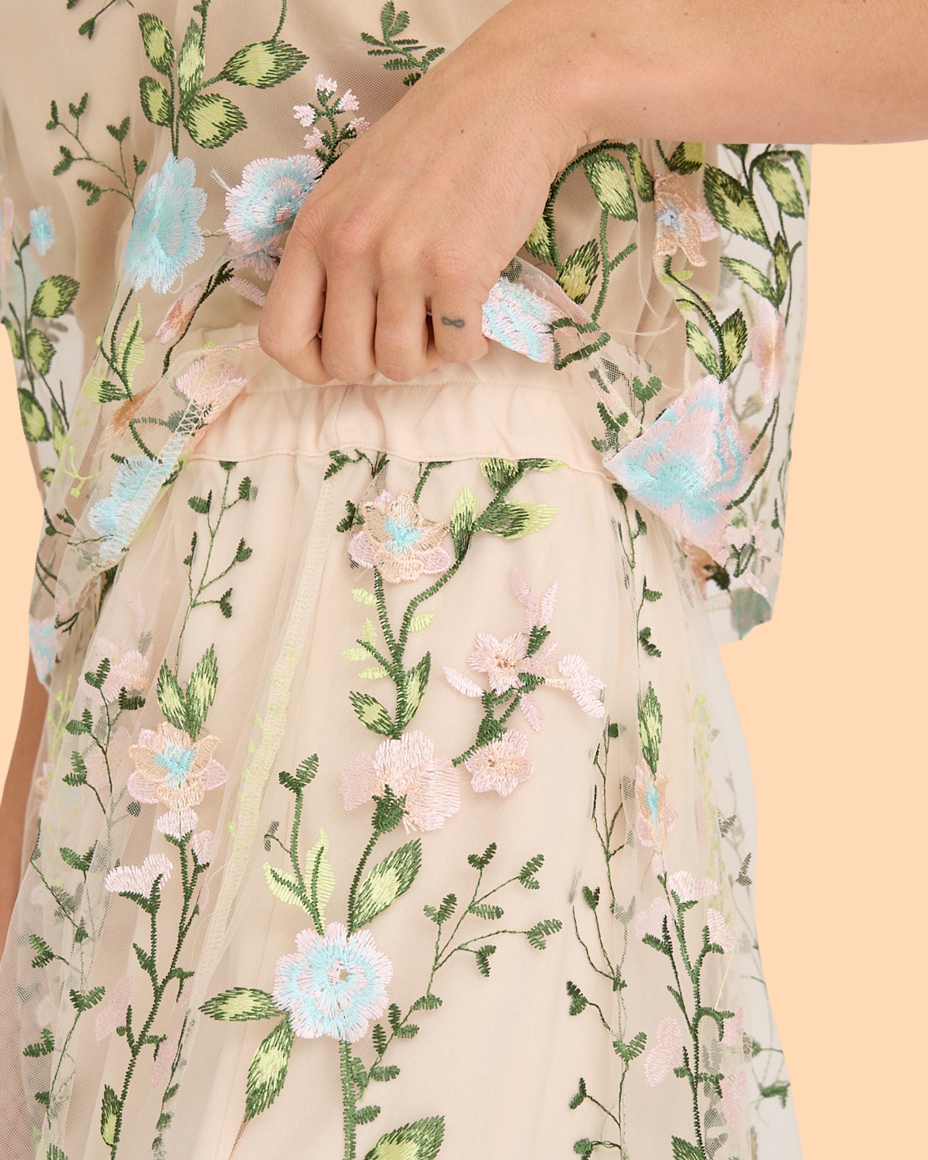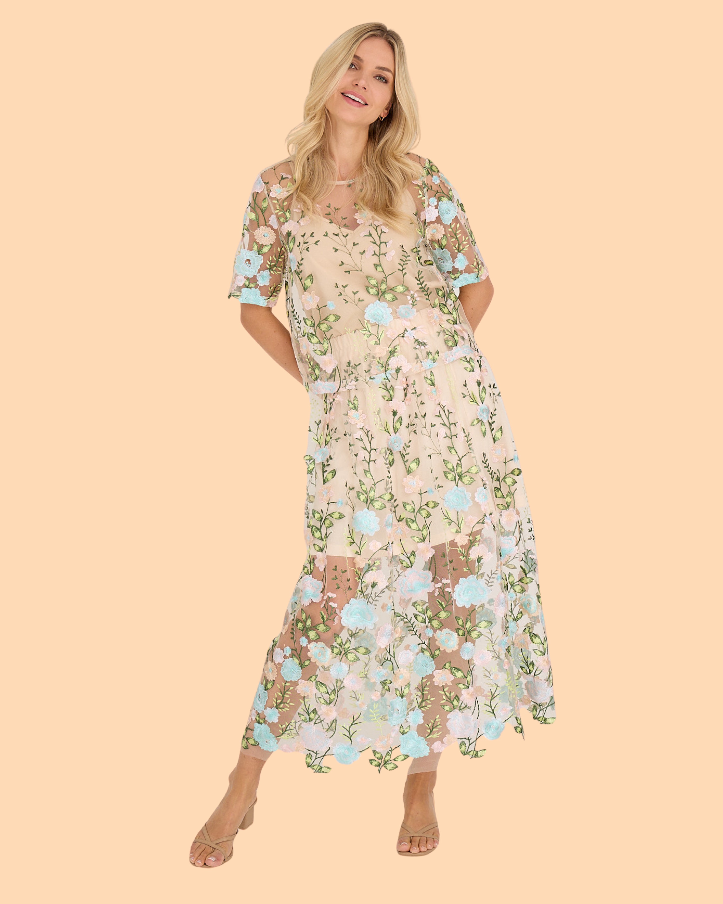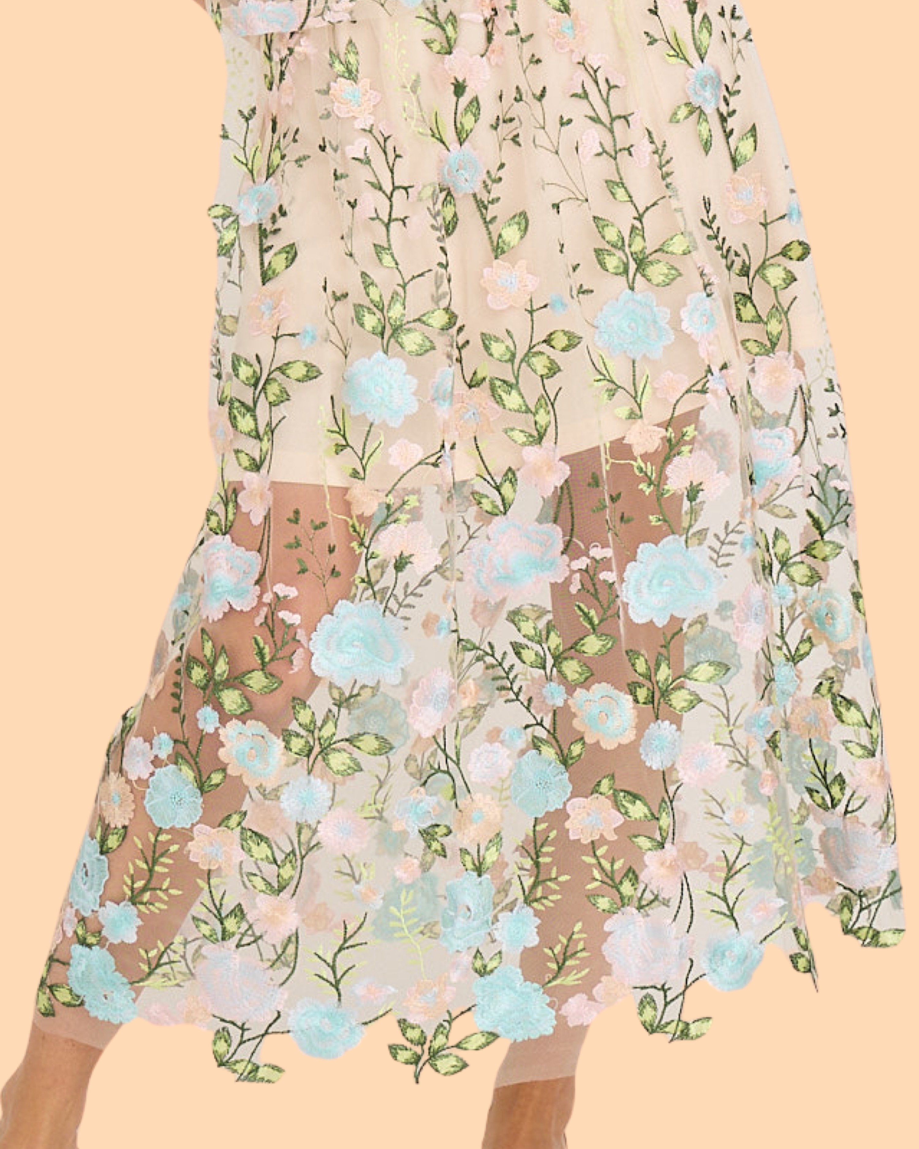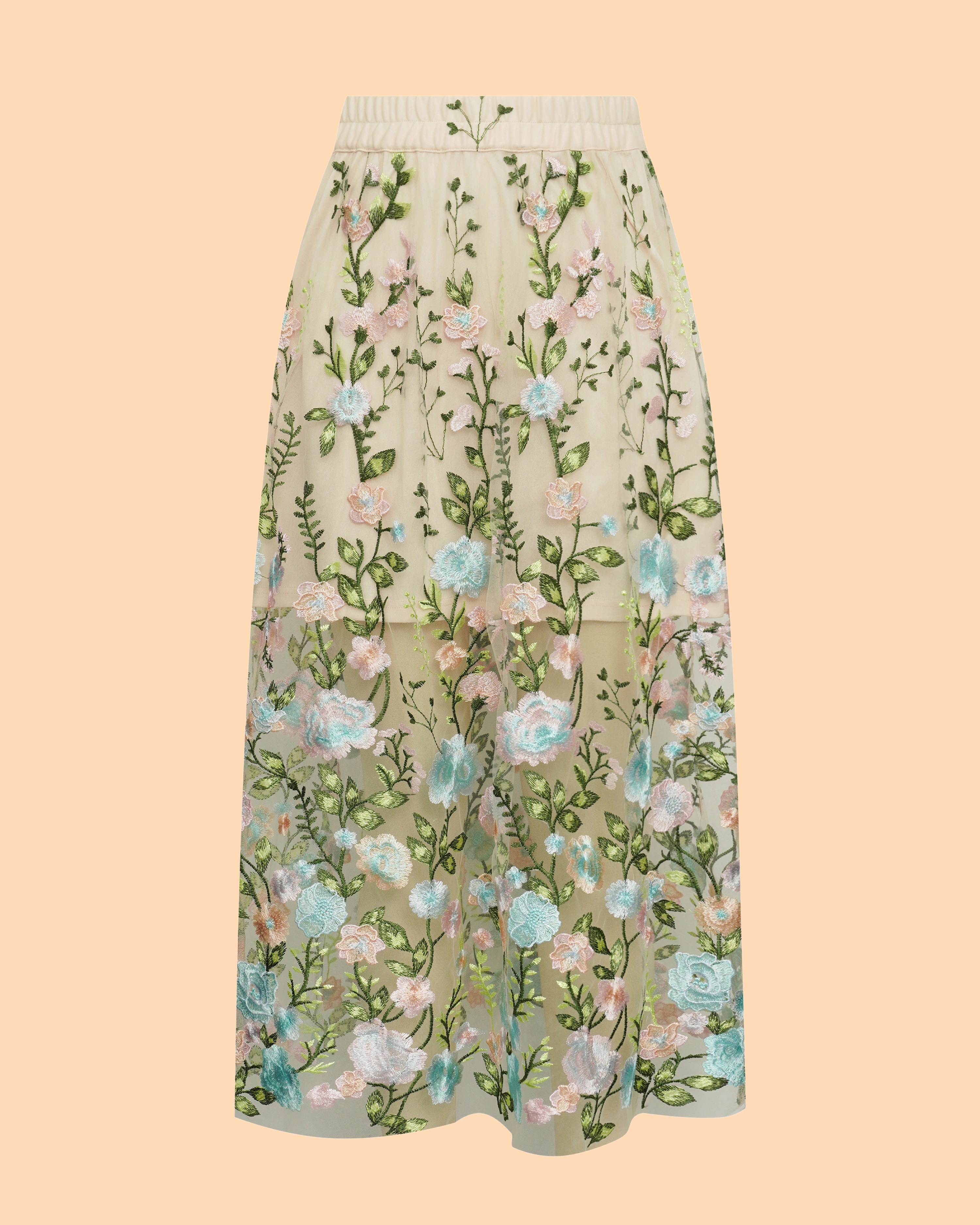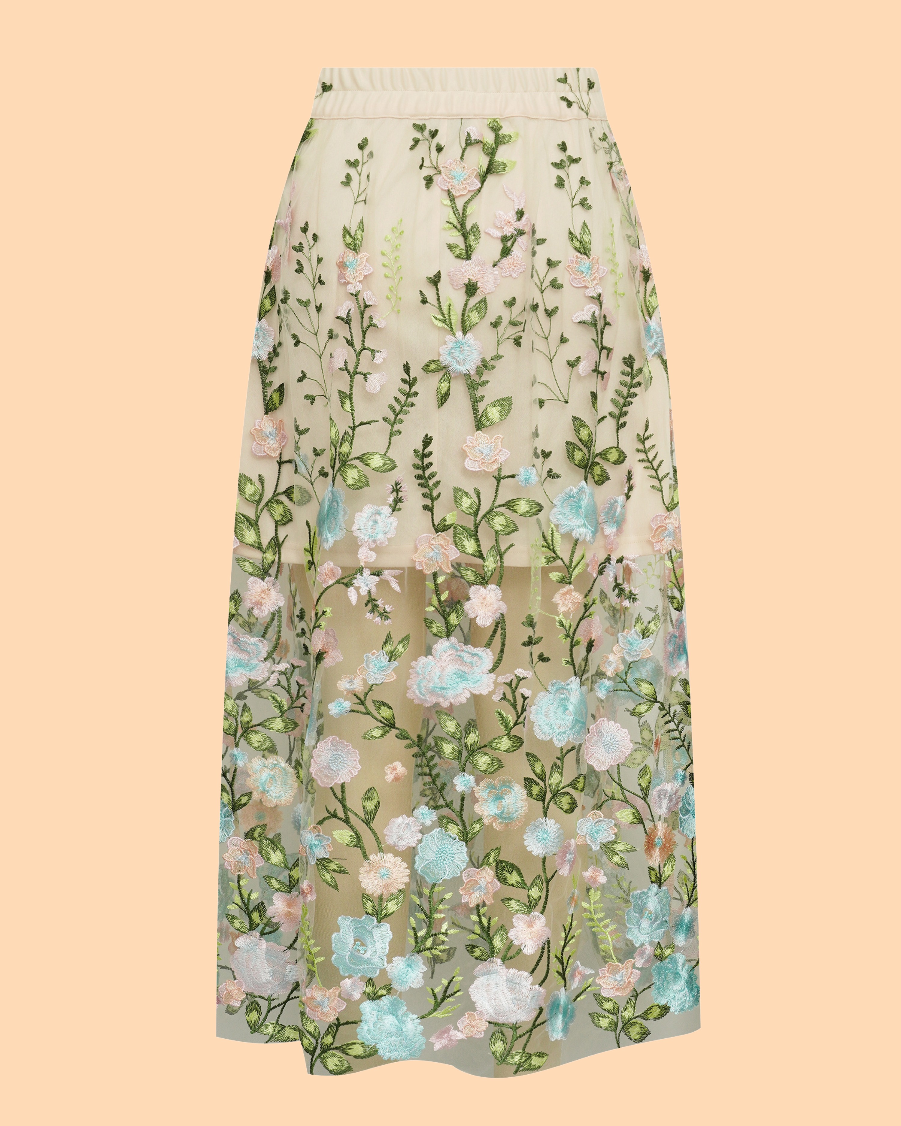 Der Fuschia Skirt von A-View ist ein langer Rock aus transparentem Netzstoff mit Stickereien. Er hat einen elastischen Bund und einen passenden, kürzeren Unterrock. Der Rock fällt normal aus.