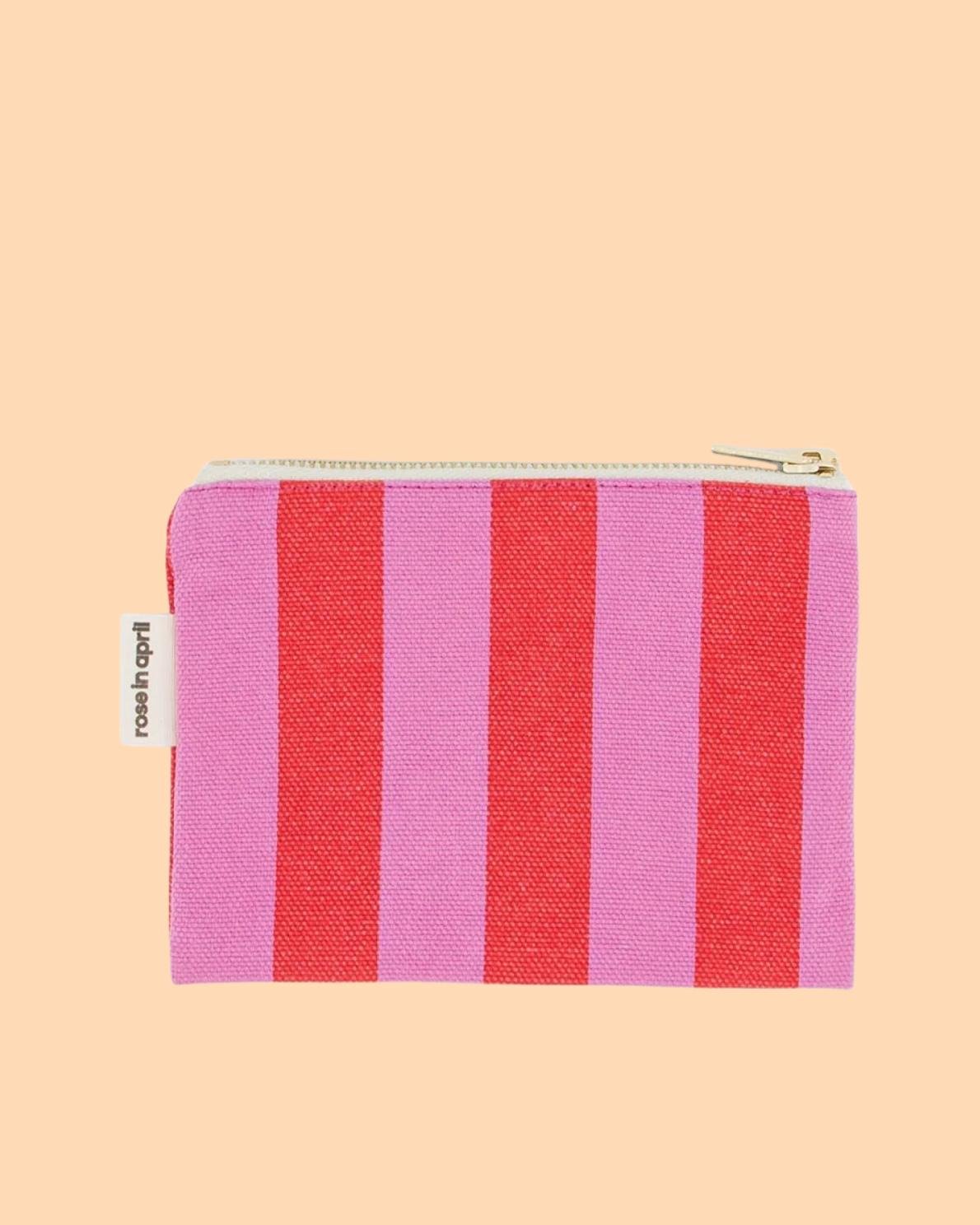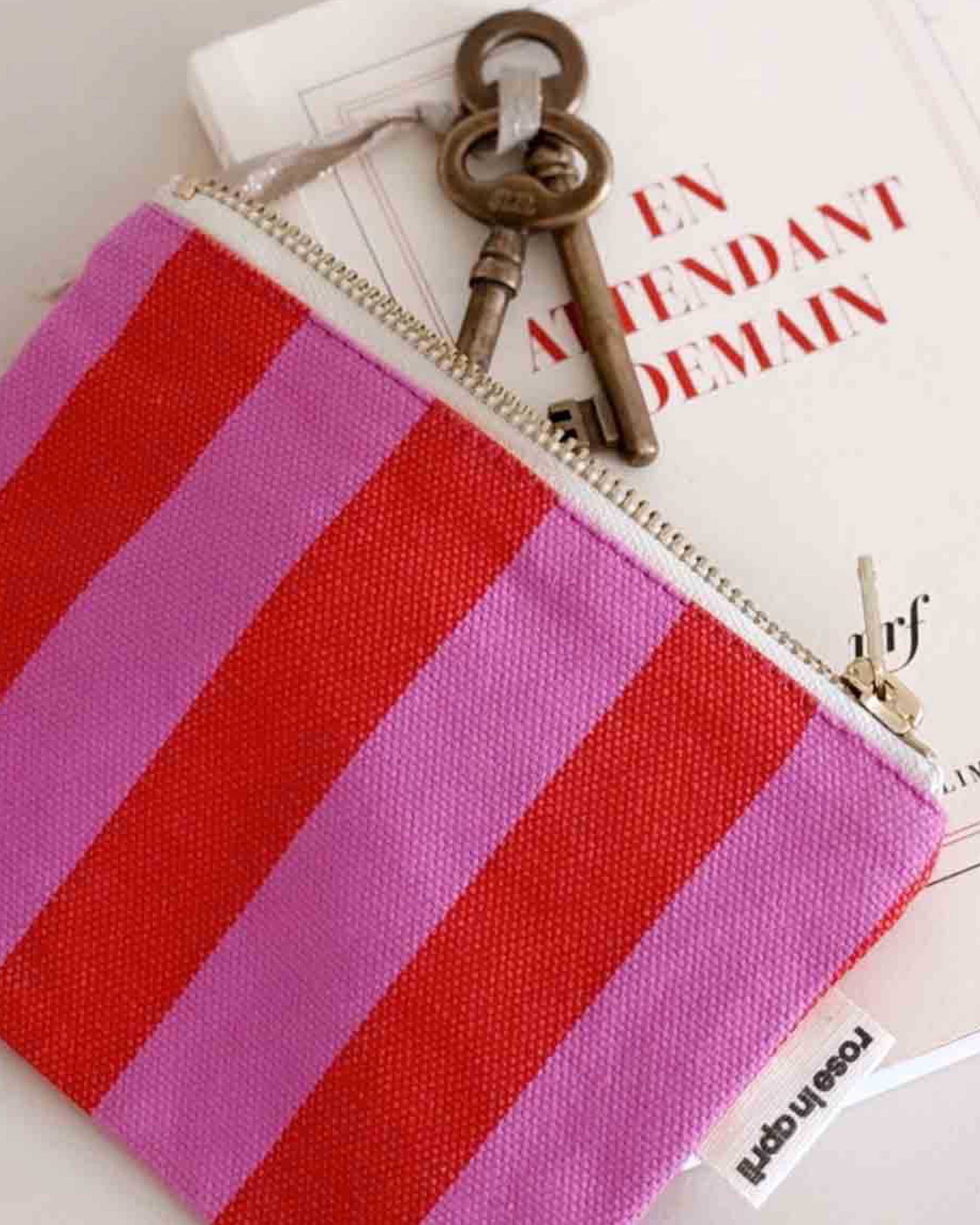 Der Geldbeutel Marie Stripes Orchid/Red von rose in april ist aus ÖKO-TEX-Baumwolle und wurde in Portugal hergestellt. Der gepunktete Baumwollstoff im Inneren ist wasserabweisend beschichtet.