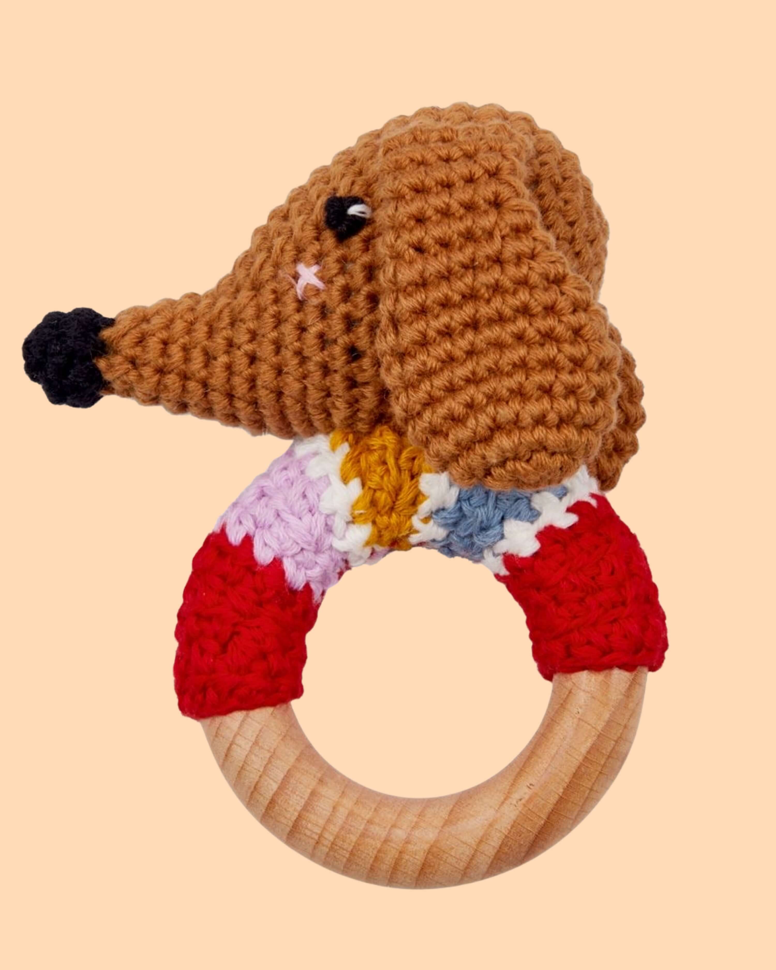 Diese handgemachte Häkel-Rassel mit Holzring darf in keinem Kinderzimmer fehlen. Das sanfte Rasseln des kleinen Dackels weckt Babys Neugier und fördert ganz nebenbei erste Greifversuche – ideal für kleine Hände.