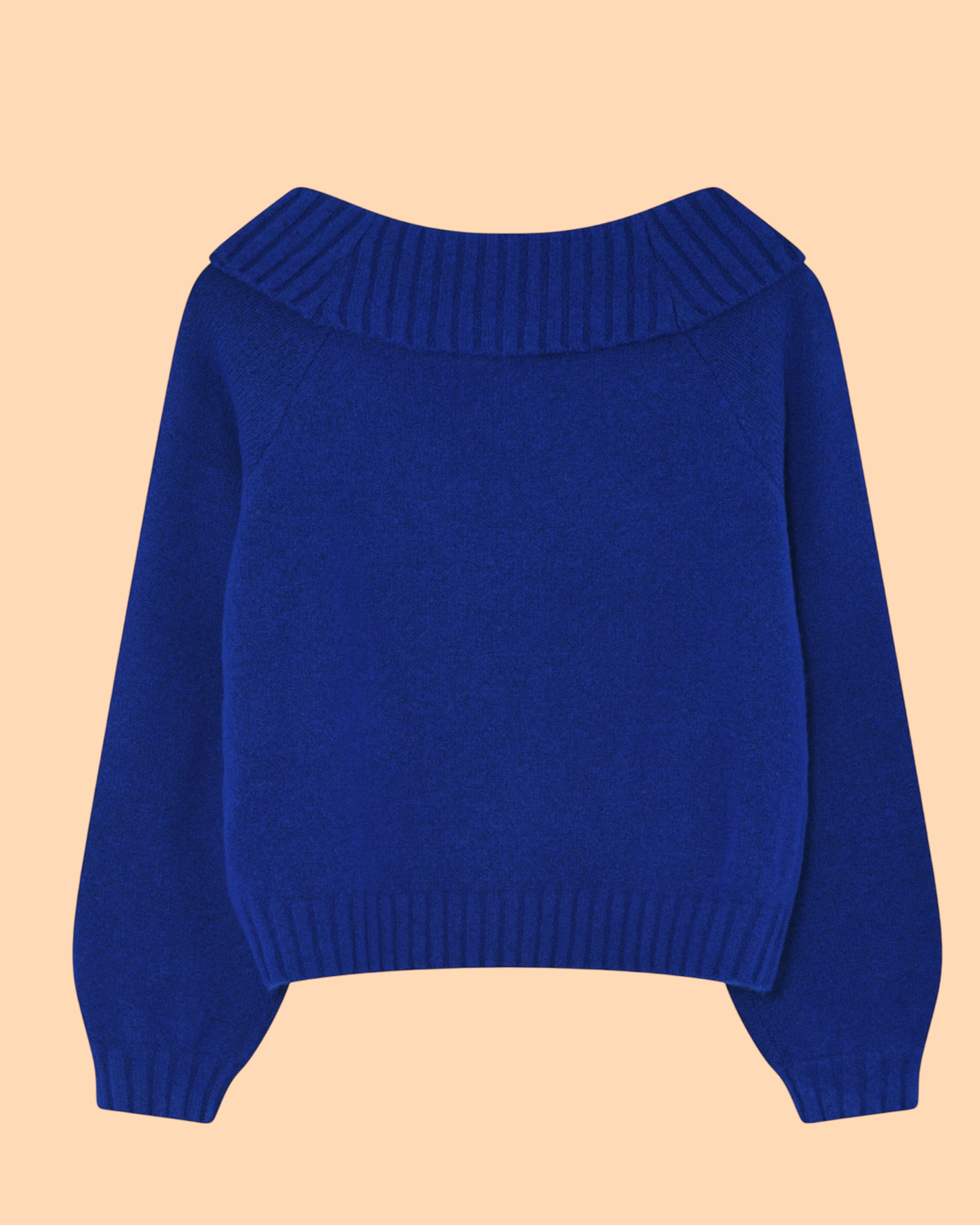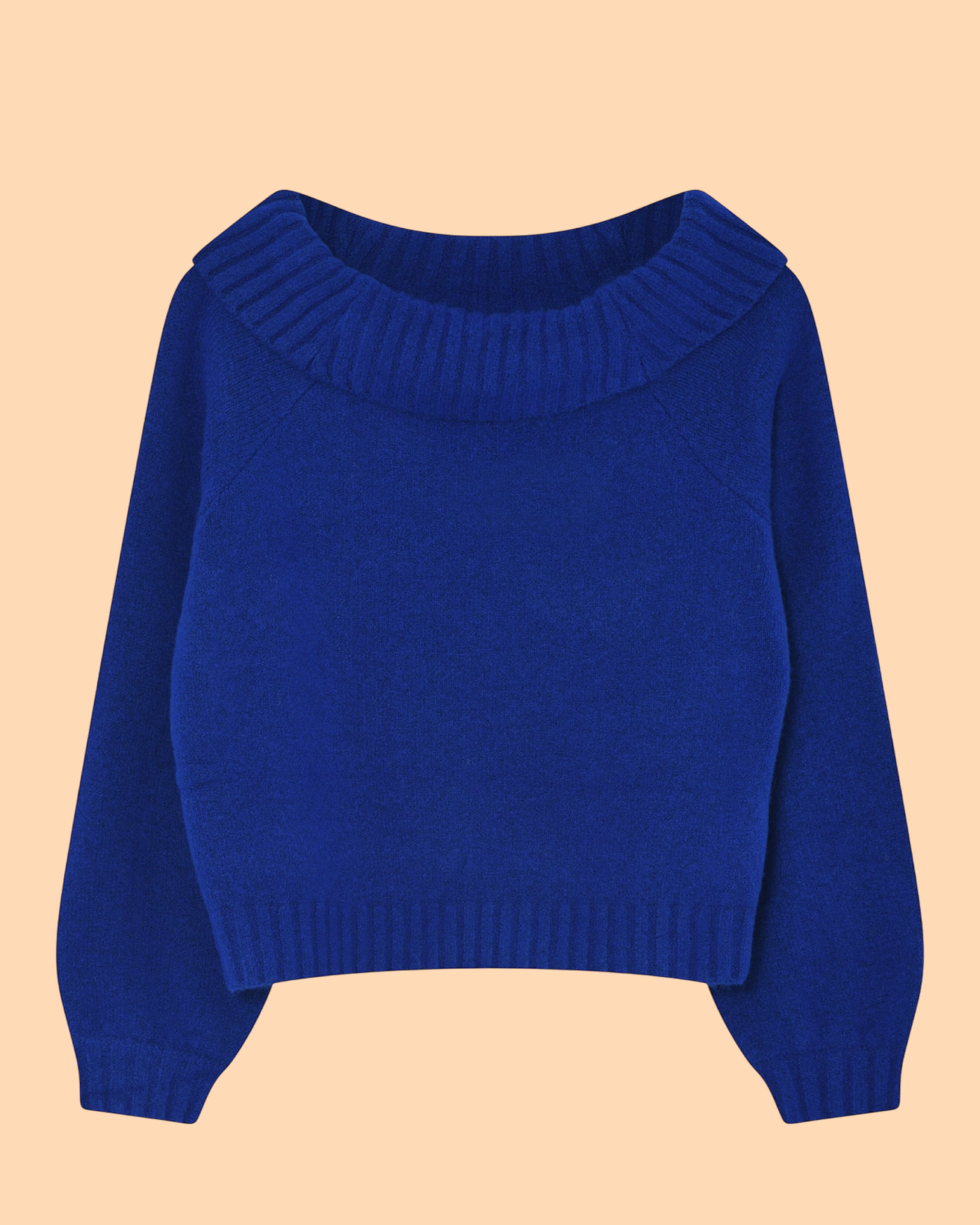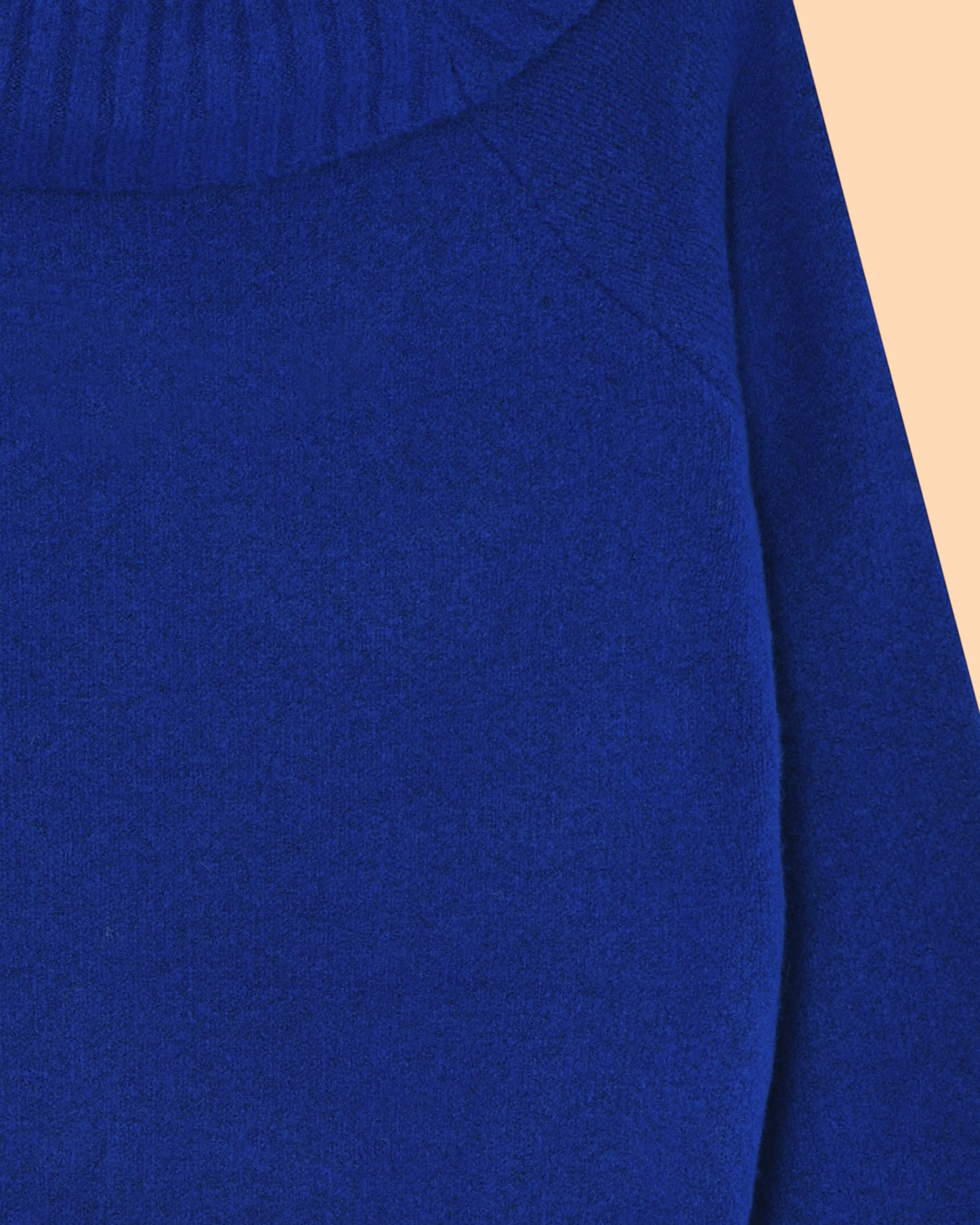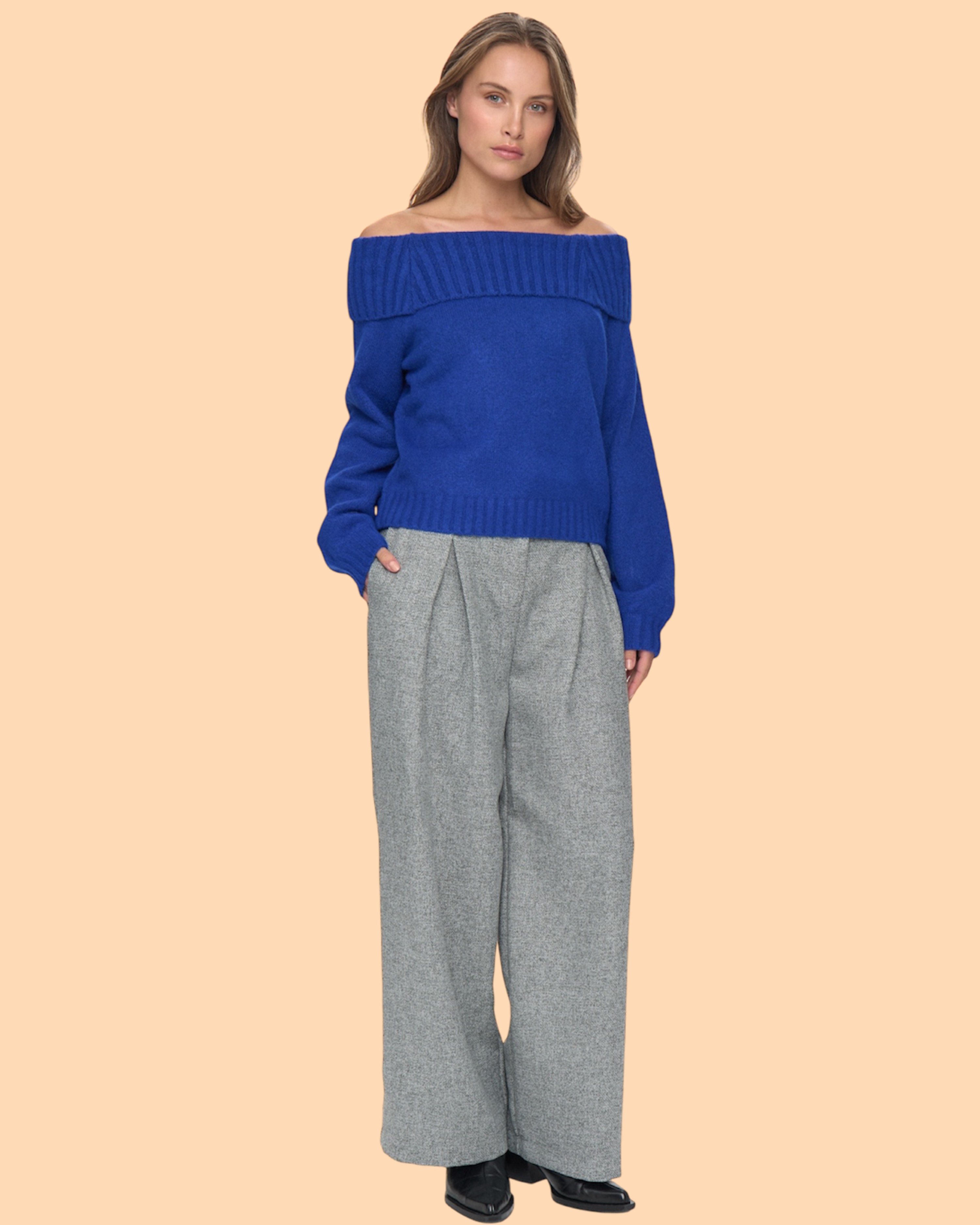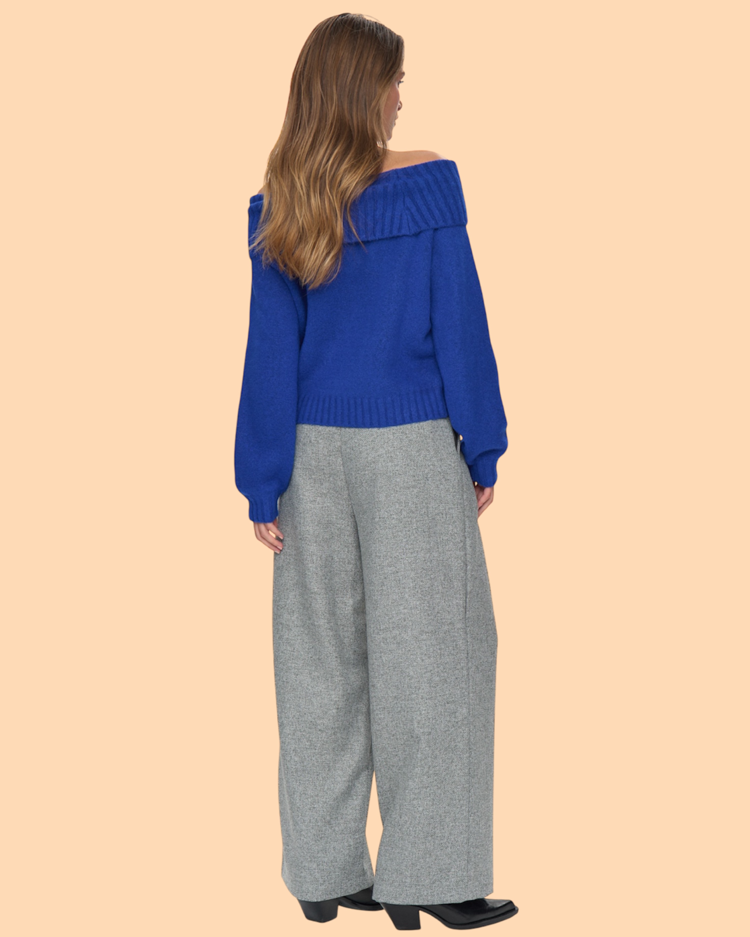 Der Janni Jumper Surf The Web von moves ist ein kuscheliger Off-Shoulder Strickpullover mit einer normalen Passform, einem breiten umgeschlagenen Kragen und Rippenbündchen am Saum und Ärmeln.