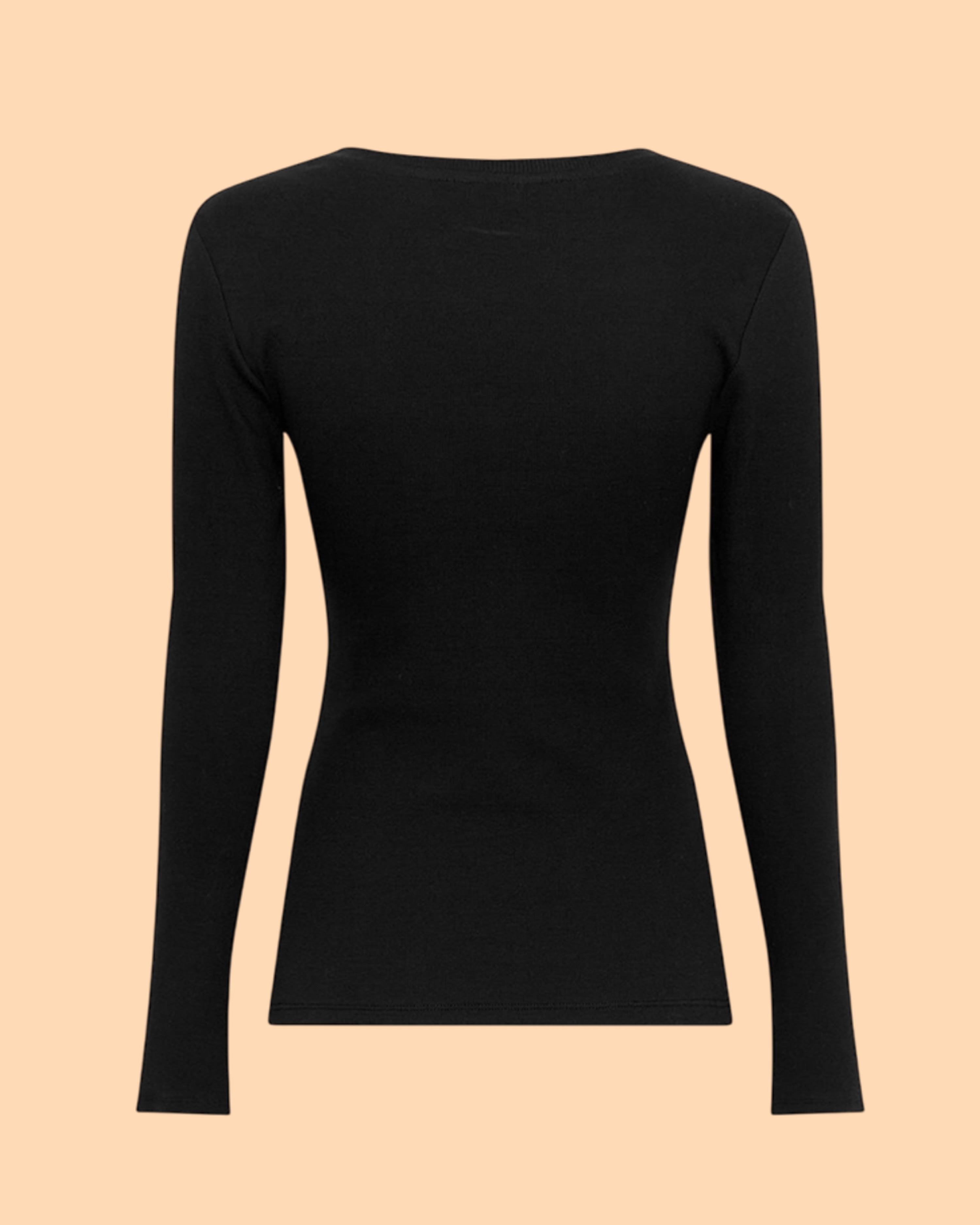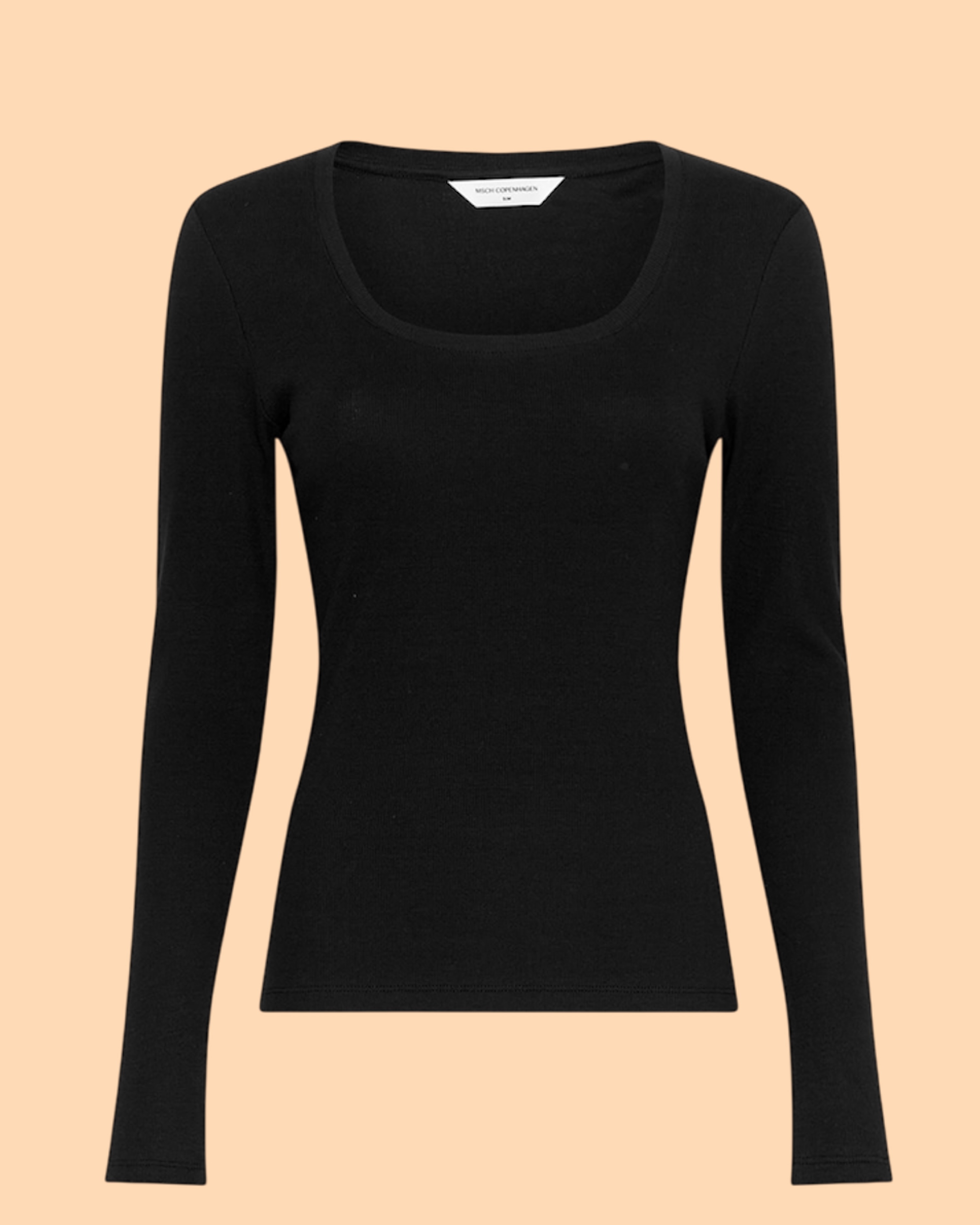 Das Jeanie Rasmia U Top Black von MSCH COPENHAGEN ist ein langärmliges Top aus weichem Jersey mit Rundhalsausschnitt und enganliegender Passform.
