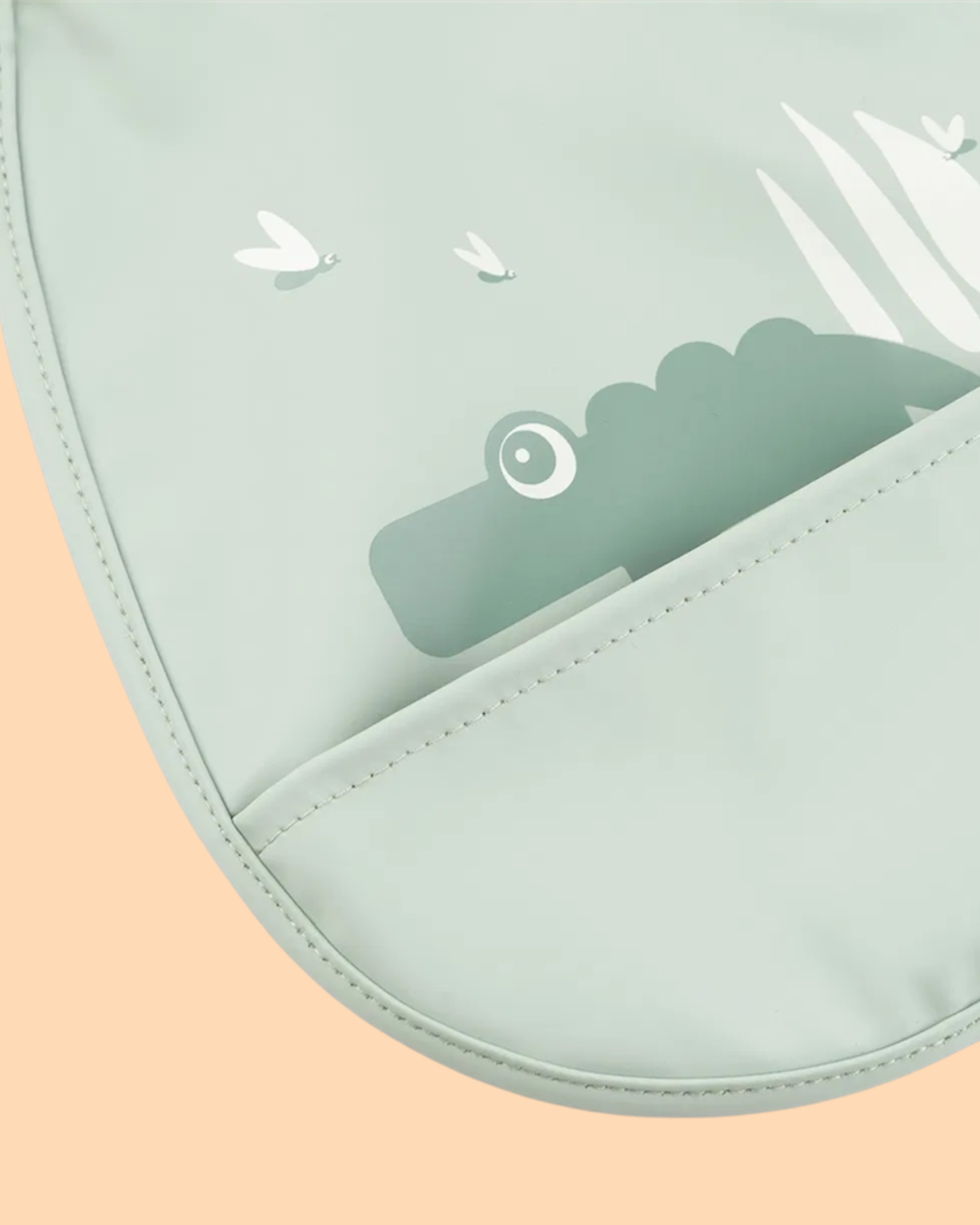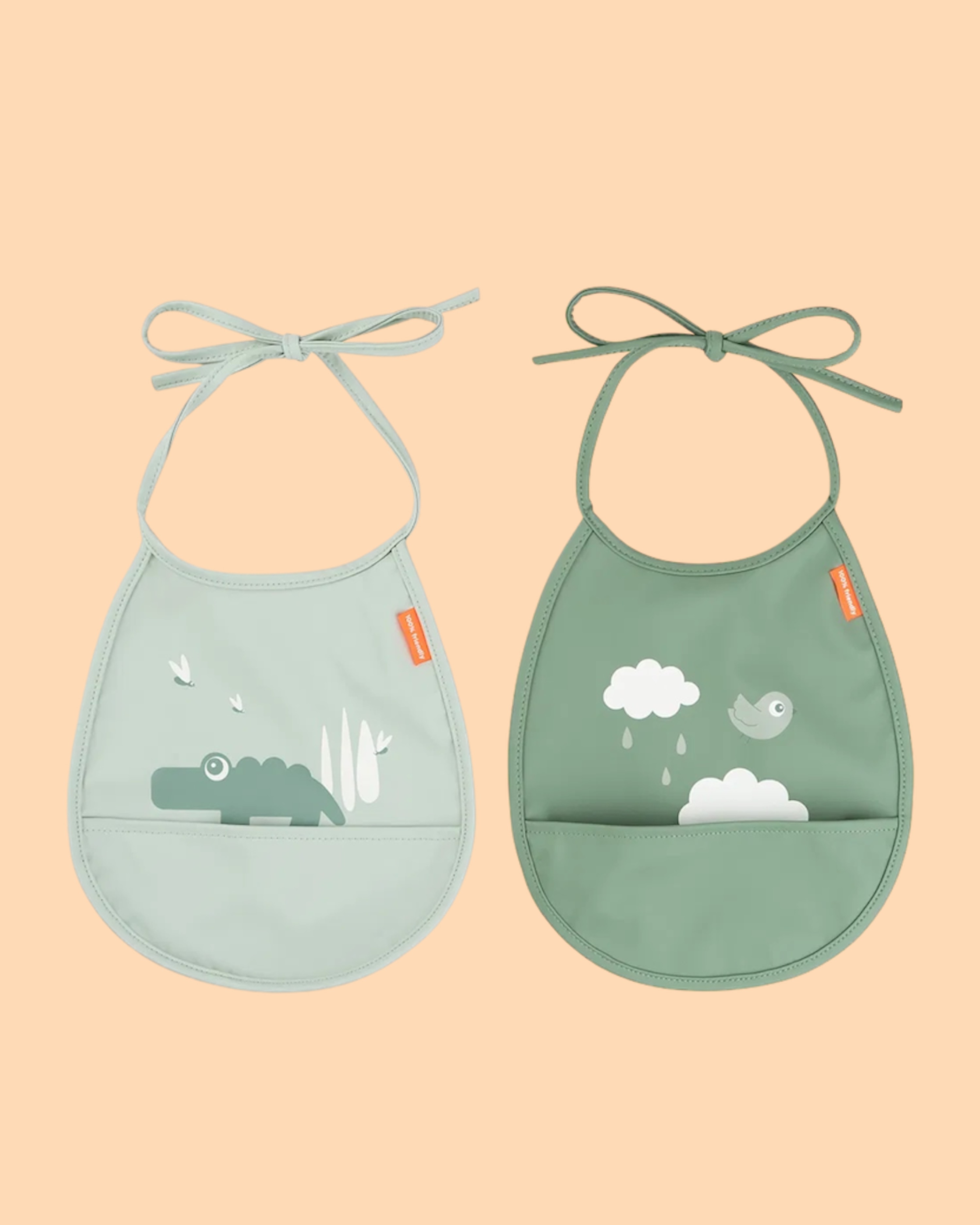 Das Kleine Lätzchen Croco Green 2erSet von Done by Deer hat eine praktische Auffangtasche, eine wasserabweisende Oberfläche, ein Schnürband und süße Motive mit Croco und Birdee.