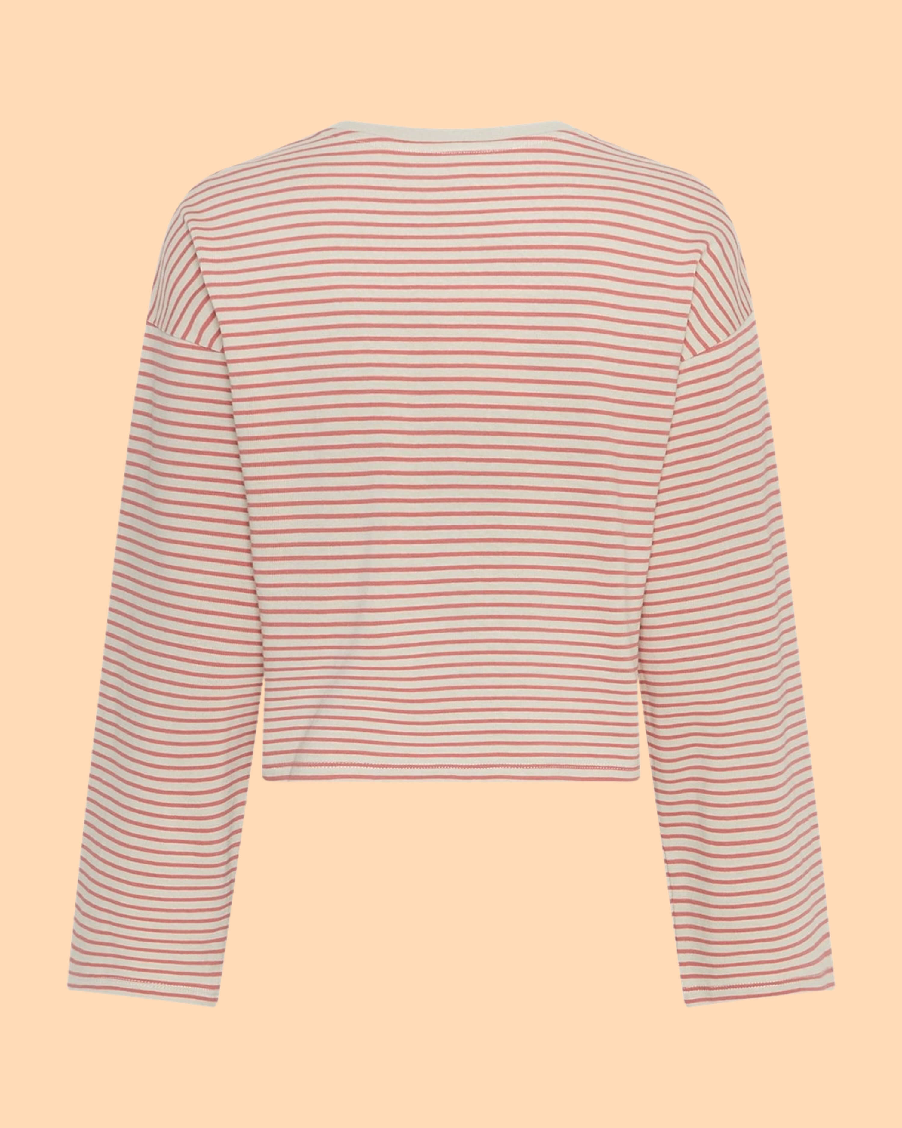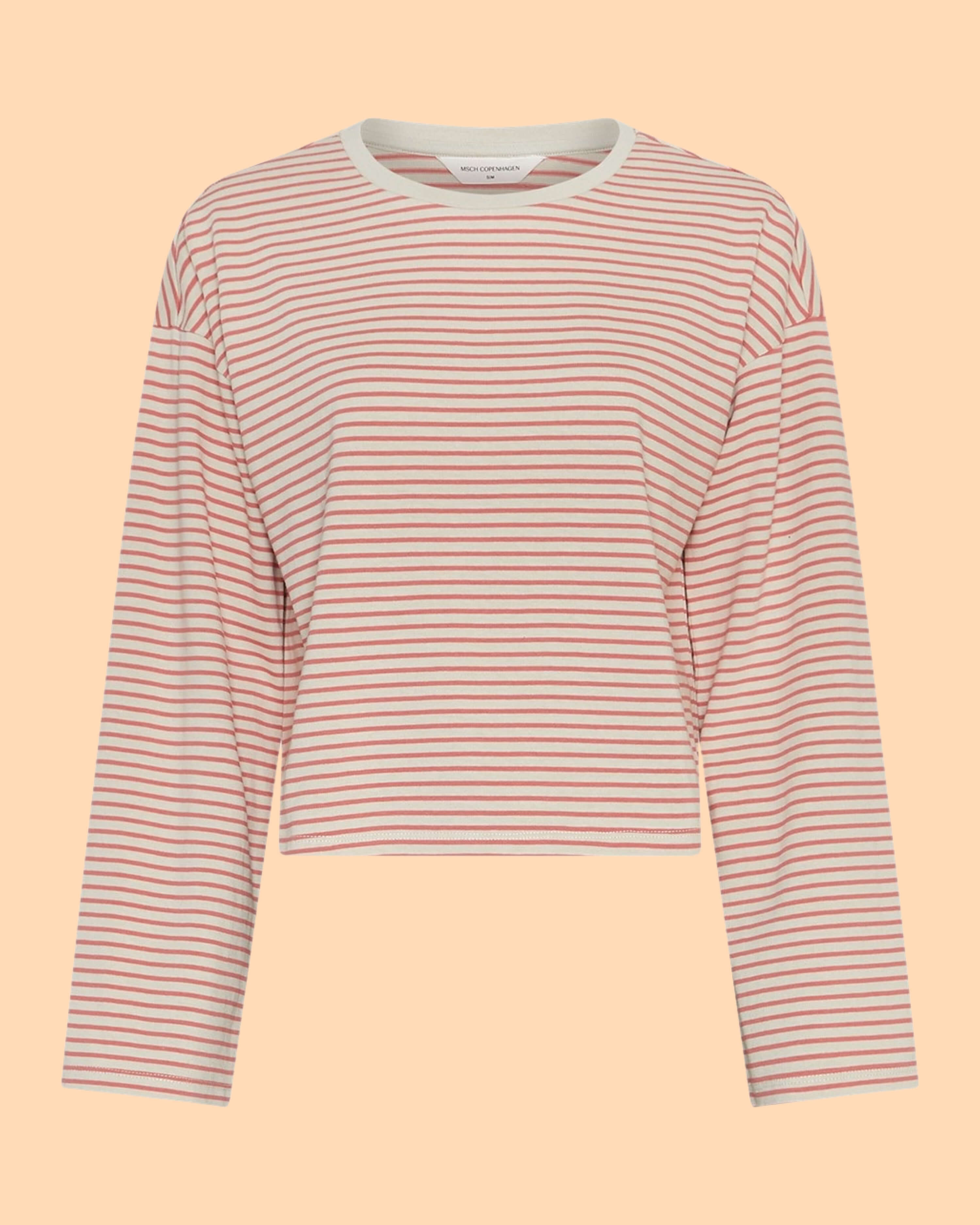 Der Krestiane Pullover Oatmeal/Rose von MSCH COPENHAGEN ist ein gestreiftes Top mit lockerer Passform, überschnittenen Schultern und langen Ärmeln. Mit klassischem Streifenmuster und moderner Silhouette. Das Model ist 177 cm groß und trägt Größe S/M.