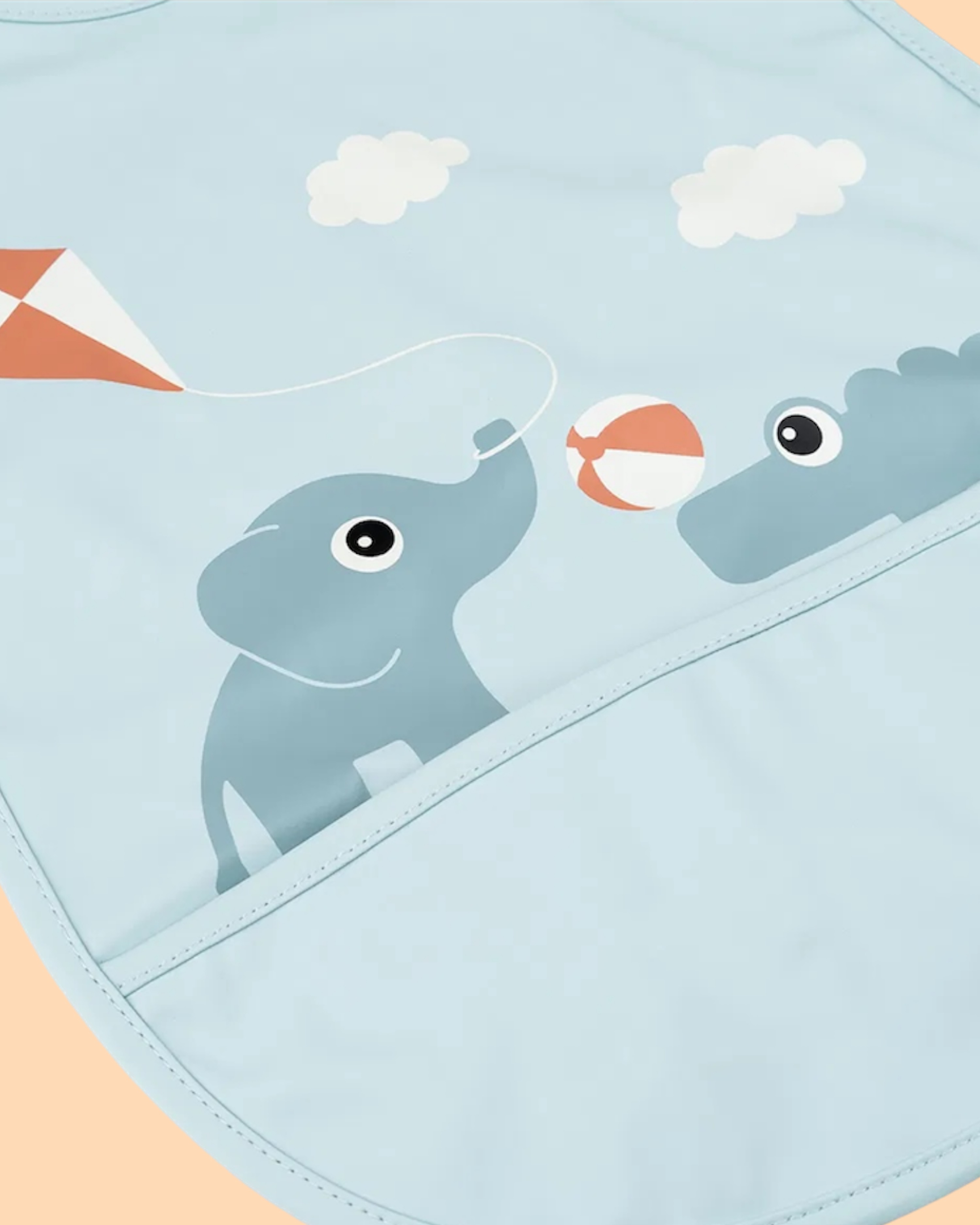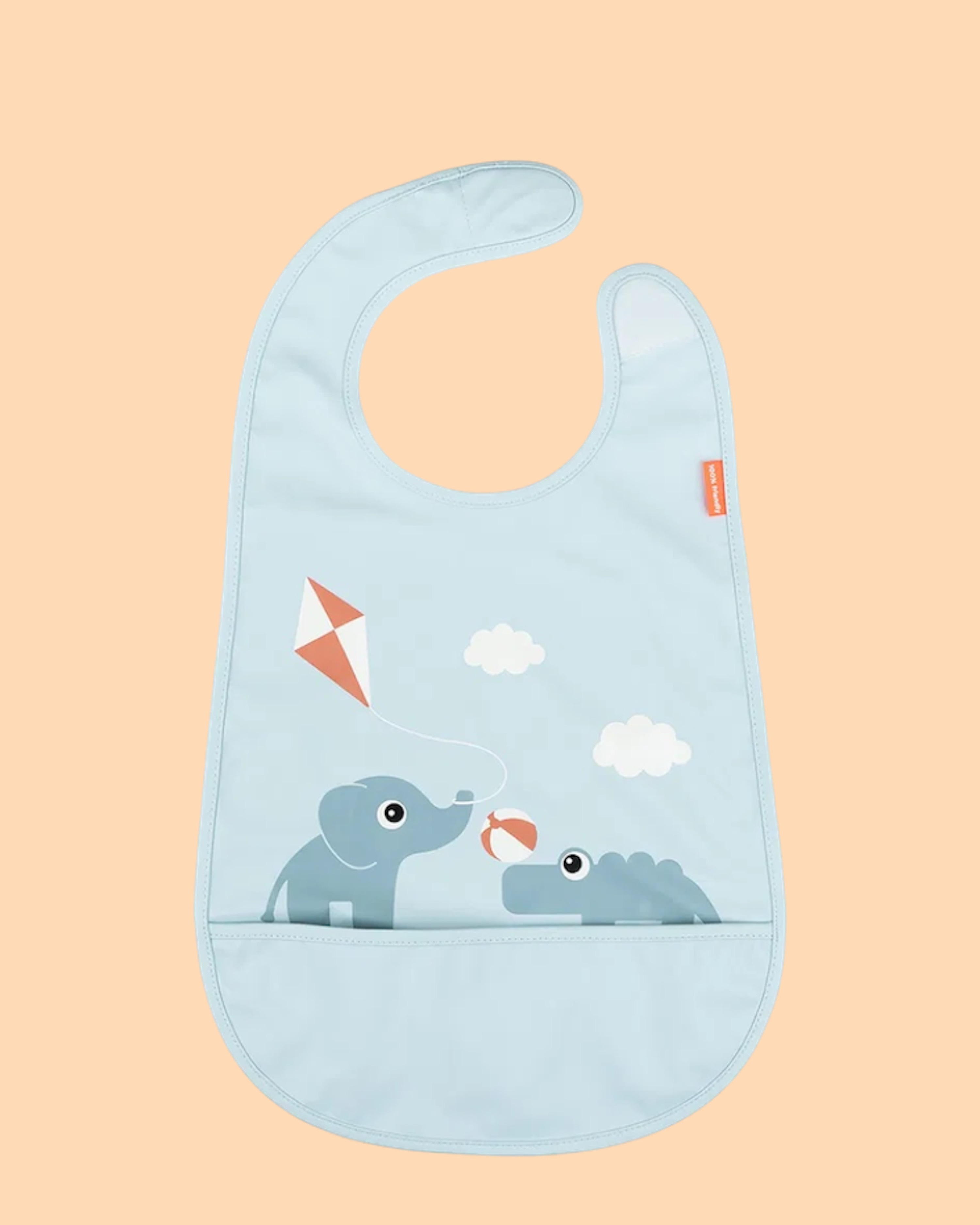 Das Lätzchen mit Klettverschluss Playground Blue von Done by Deer hat eine praktische Auffangtasche, eine wasserabweisende Oberfläche und ein süßes Motiv mit Elphee und Croco.