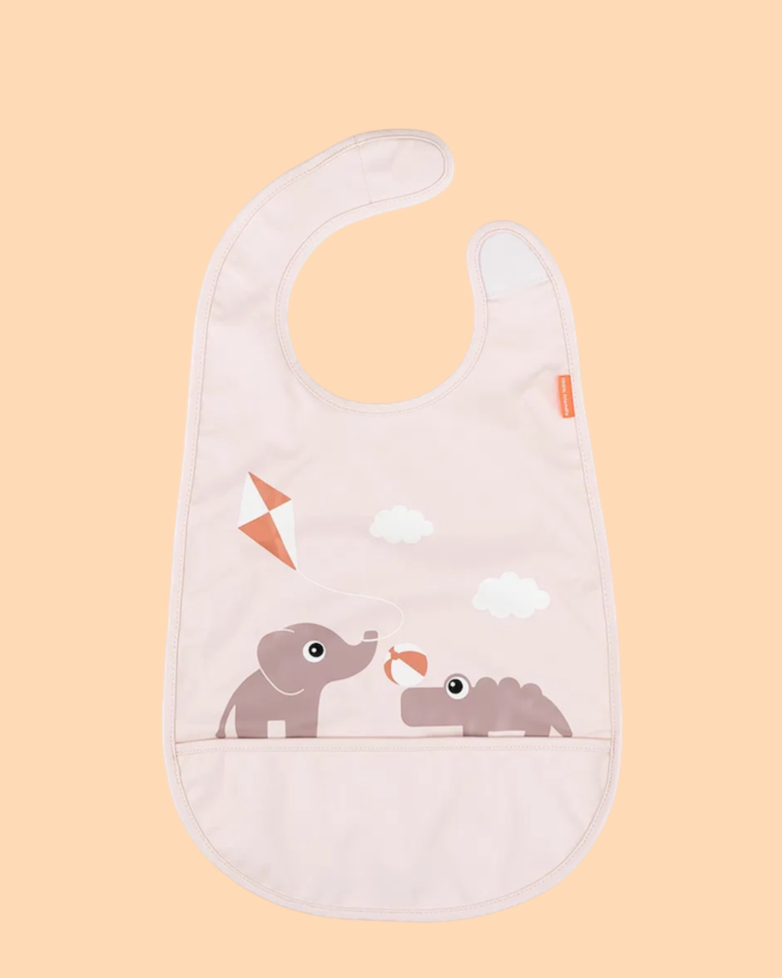 Das Lätzchen mit Klettverschluss Playground Powder von Done by Deer hat eine praktische Auffangtasche, eine wasserabweisende Oberfläche und ein süßes Motiv mit Elphee und Croco.