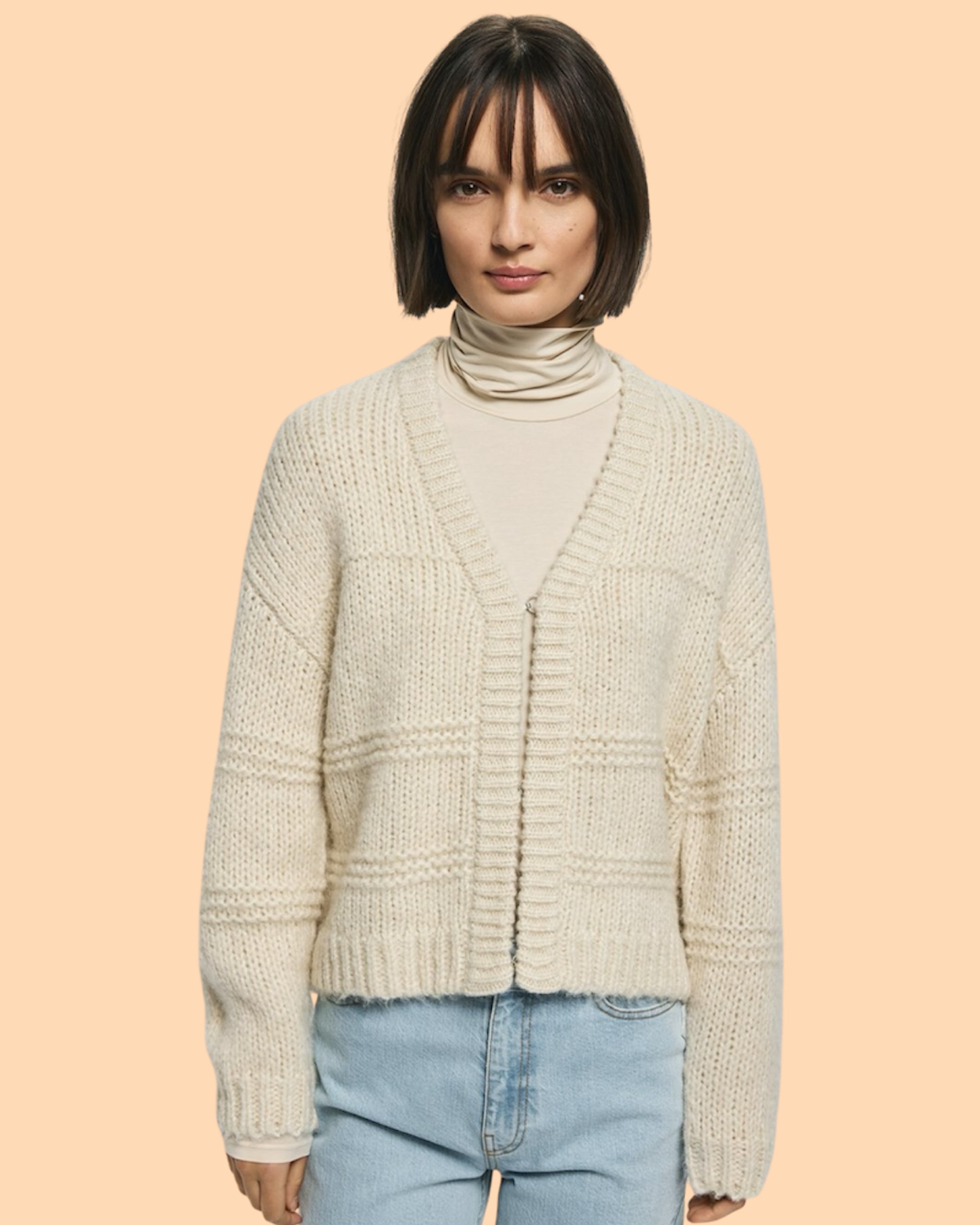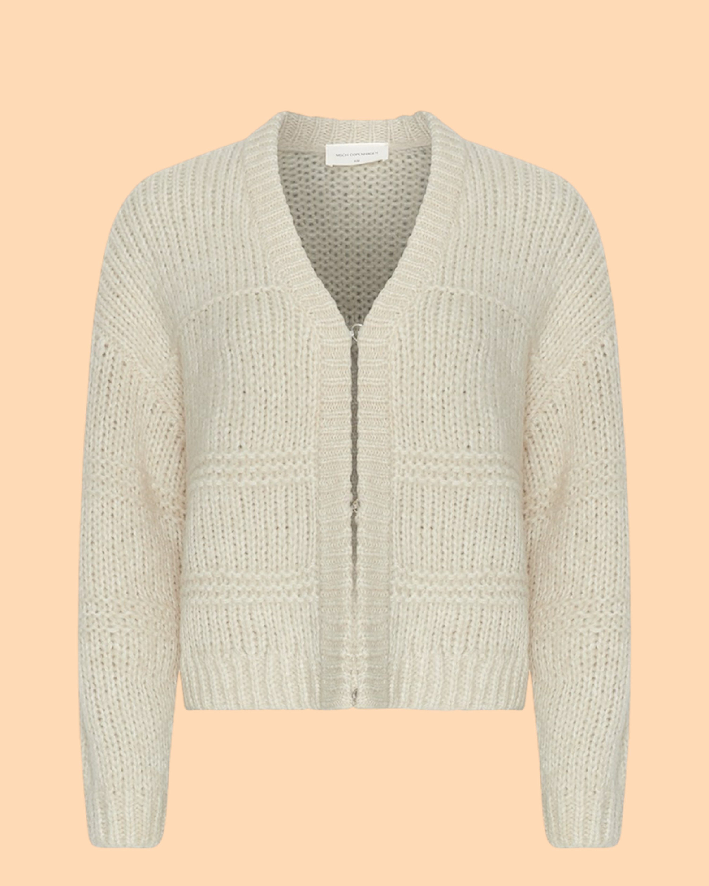 Der Leilani Heidi Cardigan Oatmeal Melange von MSCH COPENHAGEN hat eine weiche, strukturierte Qualität, eine lockere Passform, einen V-Ausschnitt, lange Ärmel und Hakenverschlüsse. Das Model ist 1,77m groß und trägt Größe S/M.