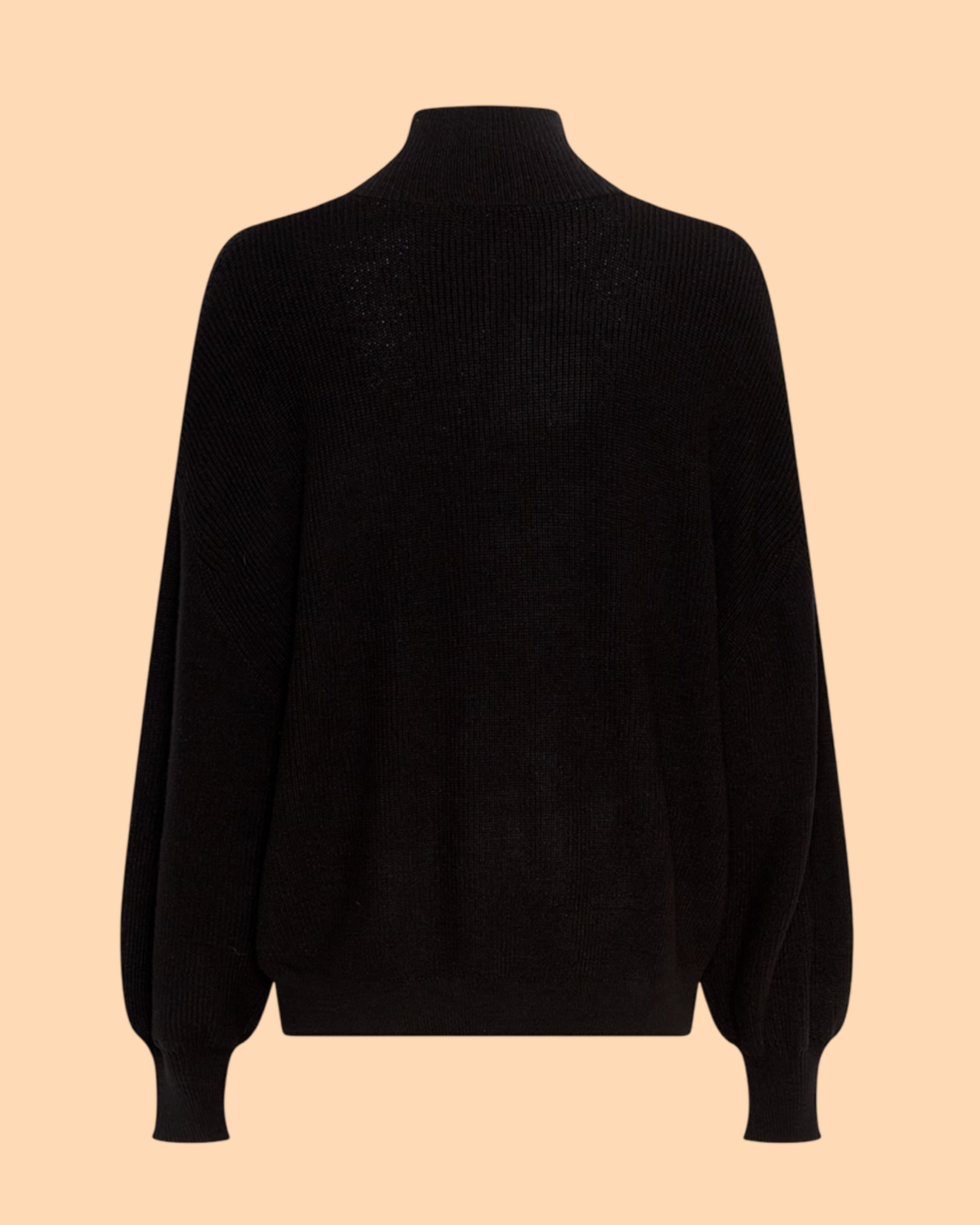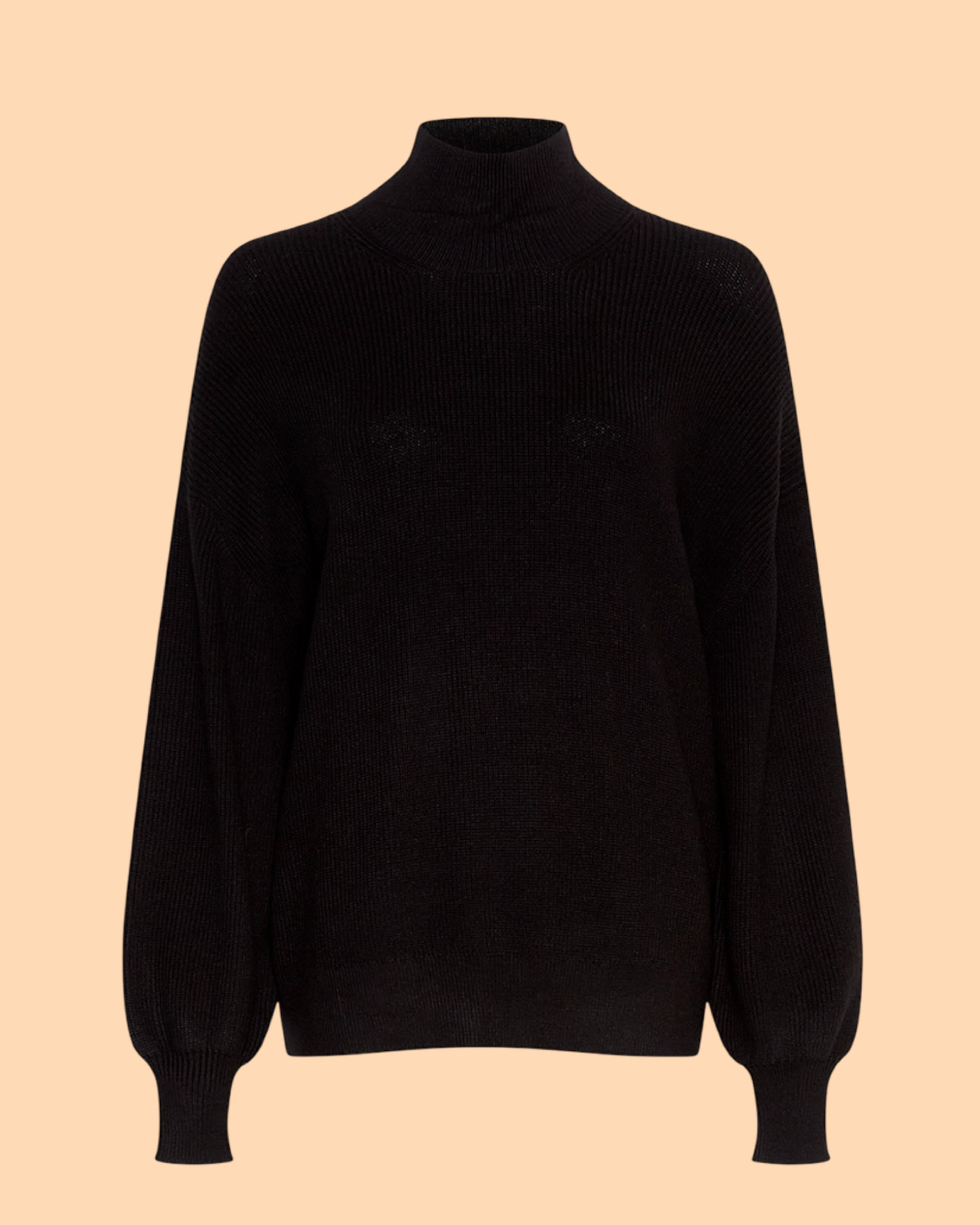 Der Magnea Rachelle M Pullover Black von Moss Copenhagen ist ein Rippenpullover mit einer Oversized-Passform, die ein wenig kastenförmig wirkt, sich aber an den hohen Rippbündchen eng an die Haut schmiegt. Er hat überschnittene Schultern, locker geschnittene Ärmel und einen Turtleneck Kragen der nicht zu eng sitzt.