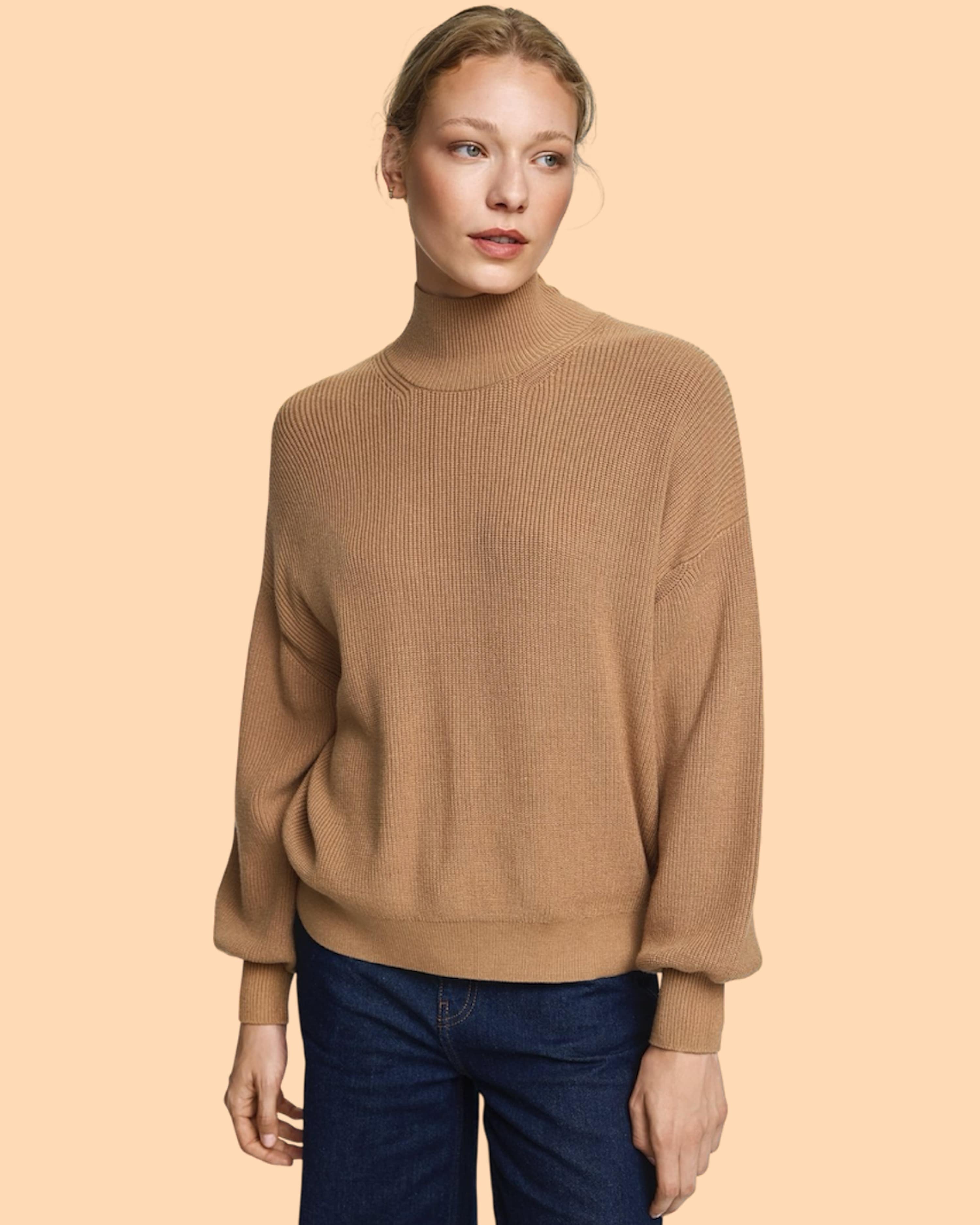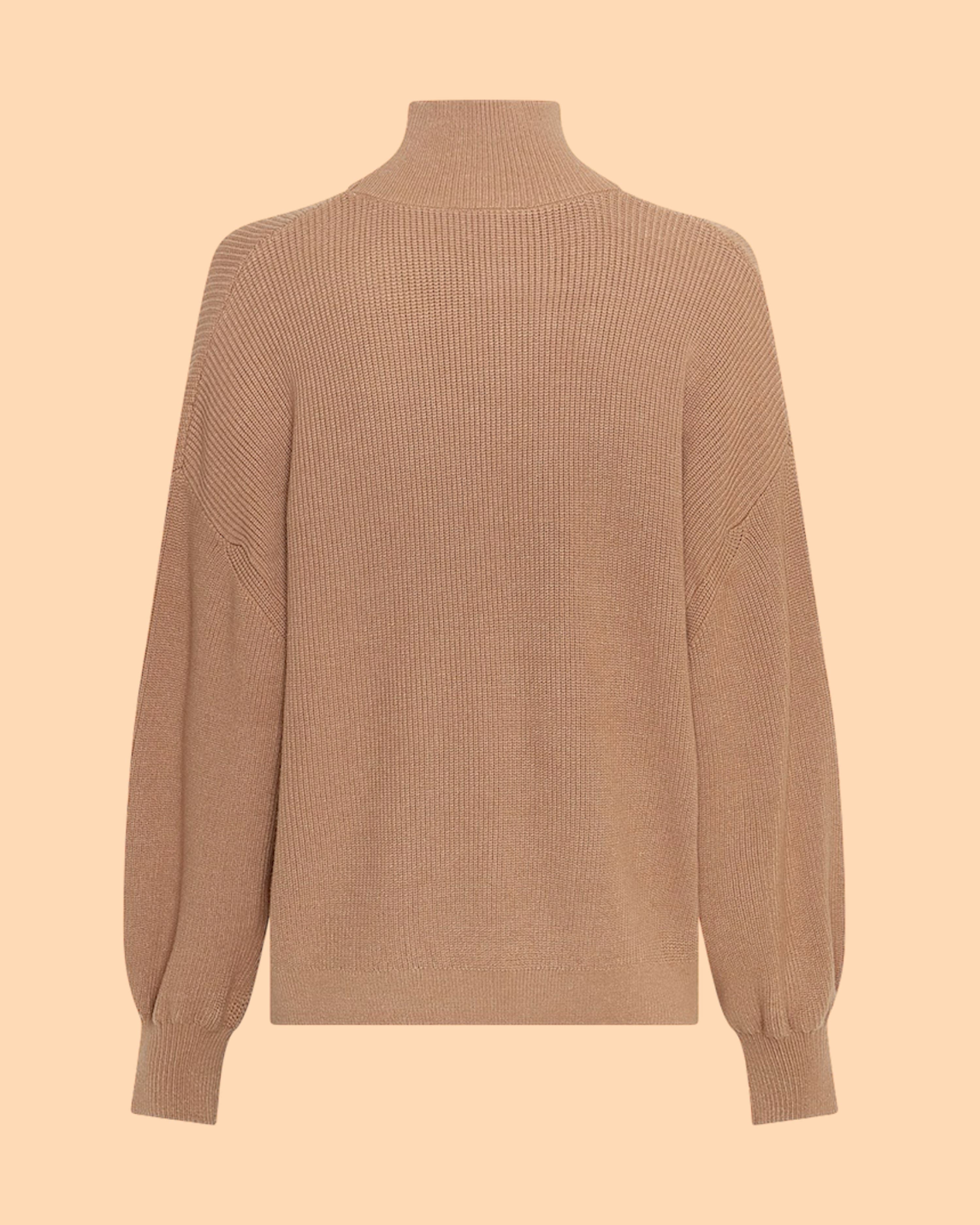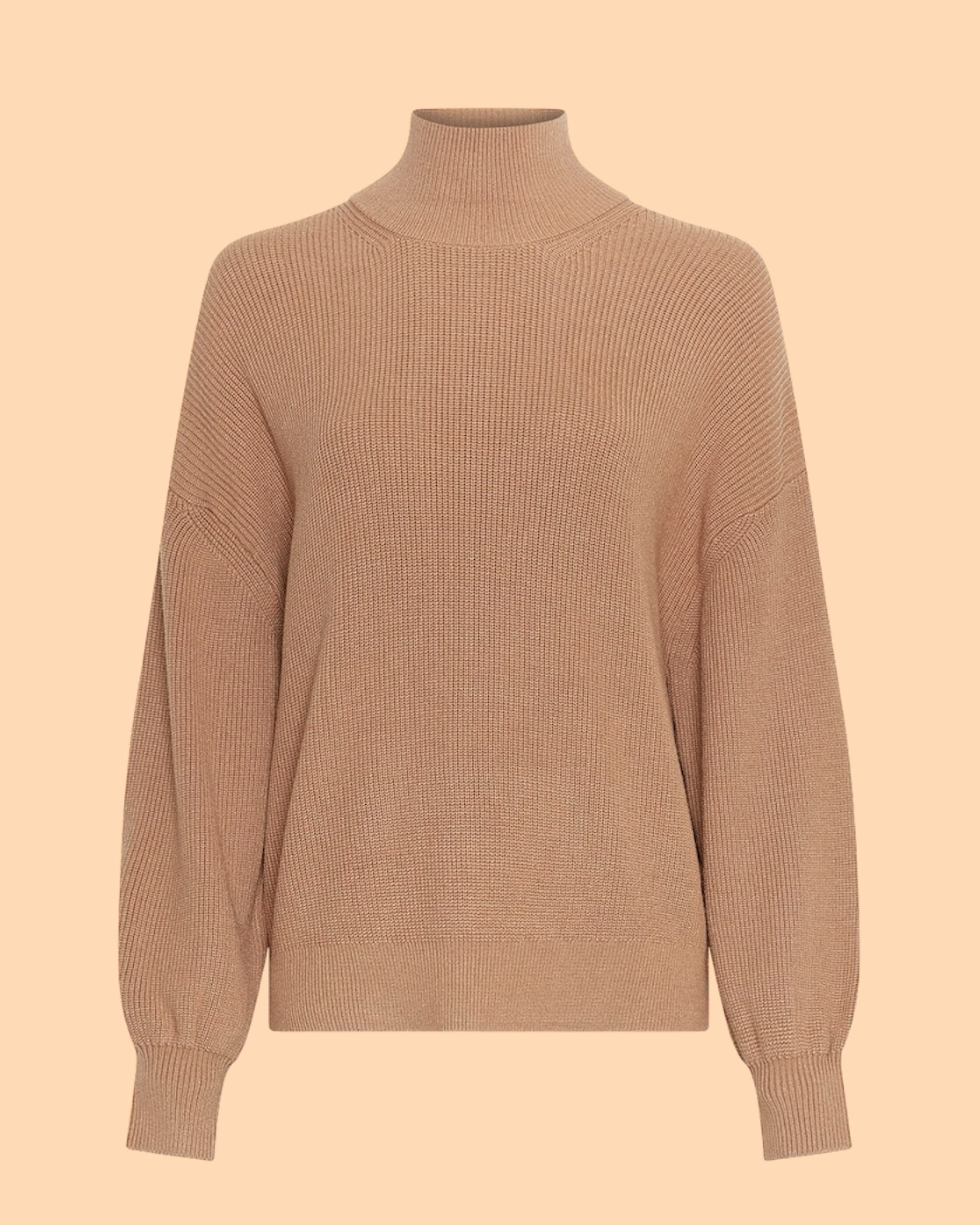 Der Magnea Rachelle M Pullover Cartouche Mel von Moss Copenhagen ist ein Rippenpullover mit einer Oversized-Passform, die ein wenig kastenförmig wirkt, sich aber an den hohen Rippbündchen eng an die Haut schmiegt. Er hat überschnittene Schultern, locker geschnittene Ärmel und einen Turtleneck Kragen der nicht zu eng sitzt.