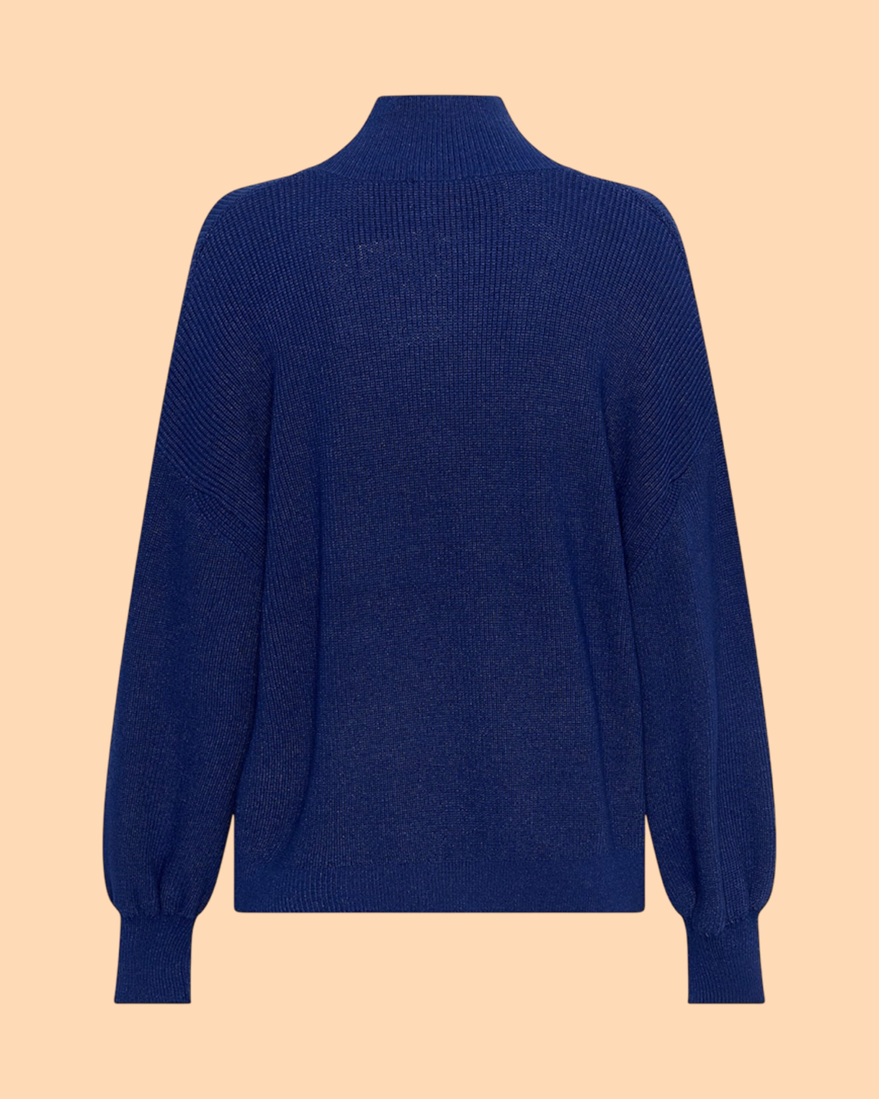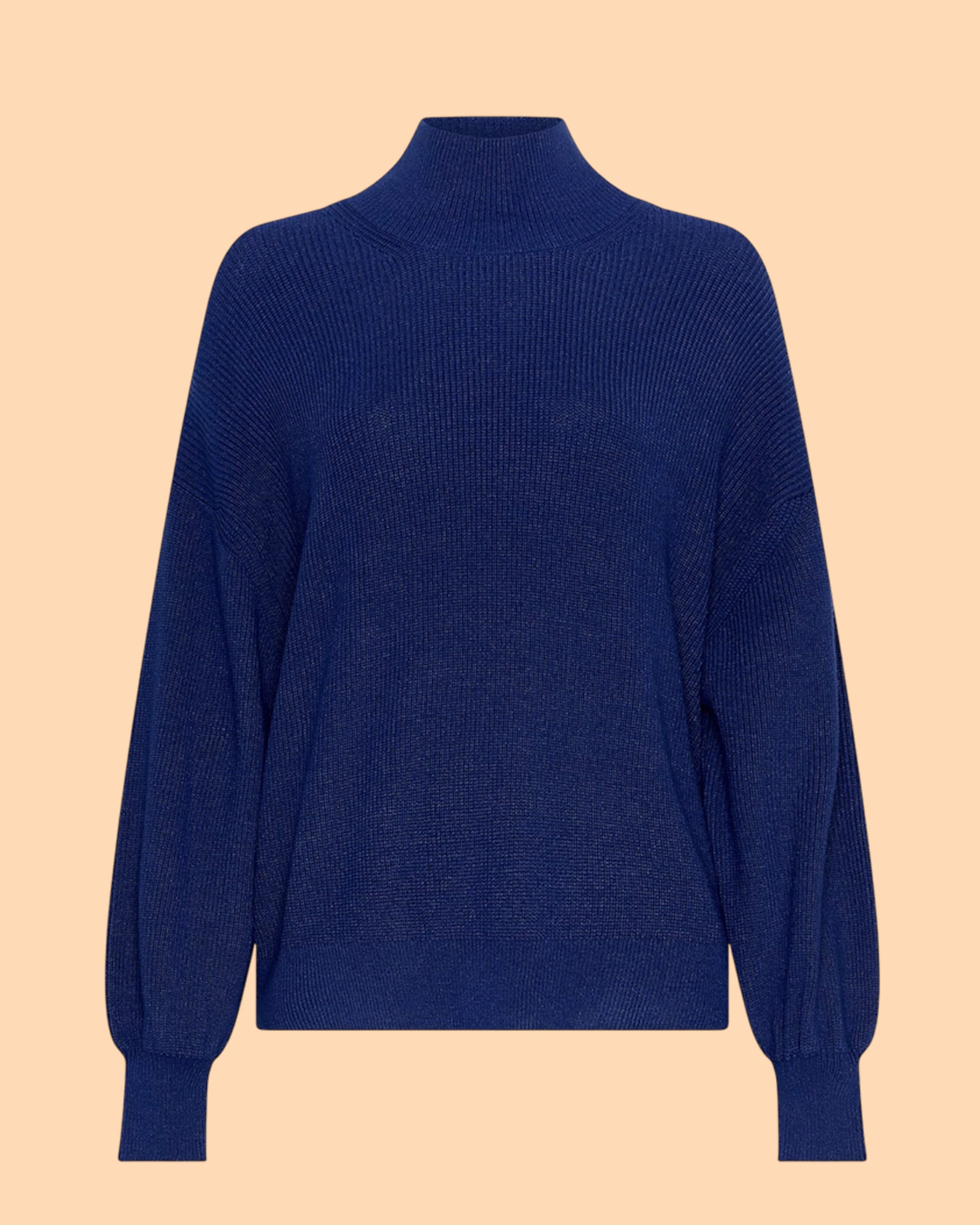 Der Magnea Rachelle M Pullover Sodalite Blue von Moss Copenhagen ist ein Rippenpullover mit einer Oversized-Passform, die ein wenig kastenförmig wirkt, sich aber an den hohen Rippbündchen eng an die Haut schmiegt. Er hat überschnittene Schultern, locker geschnittene Ärmel und einen Turtleneck Kragen der nicht zu eng sitzt.