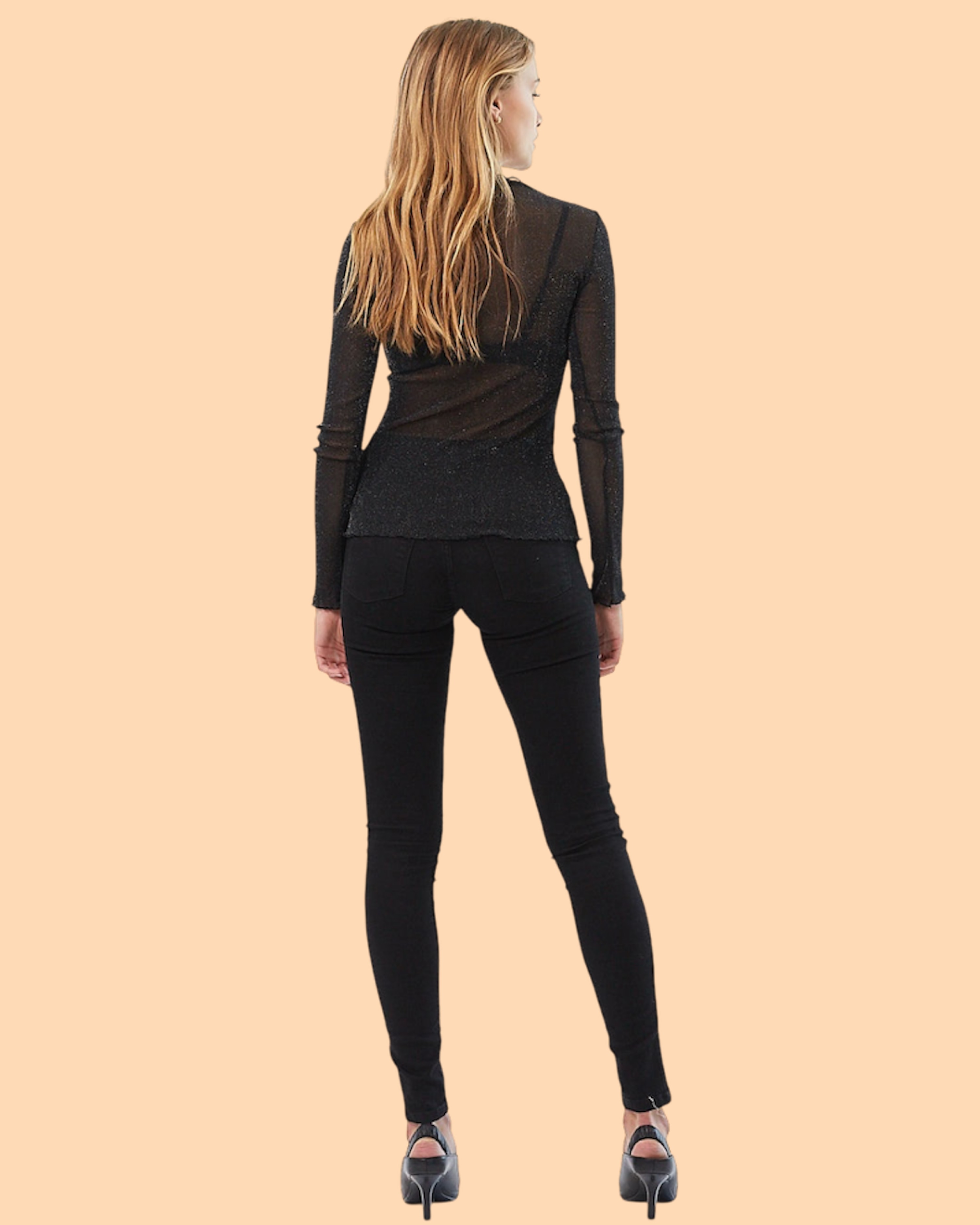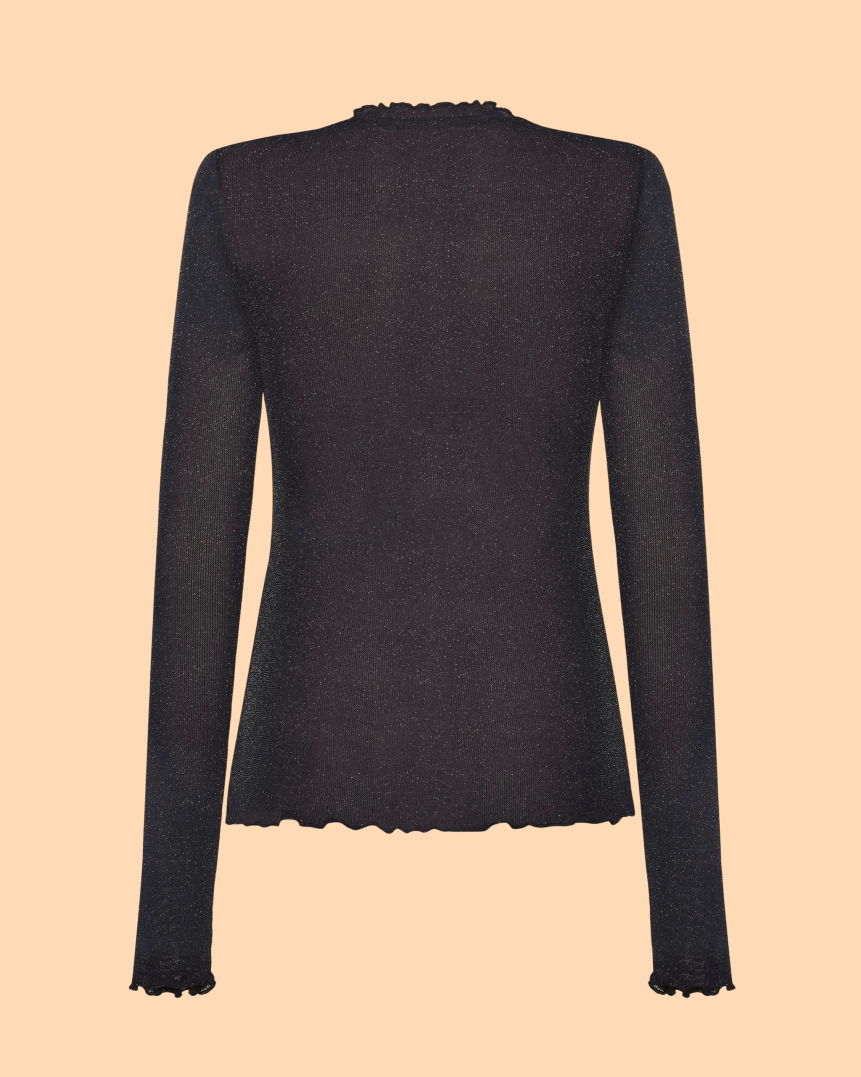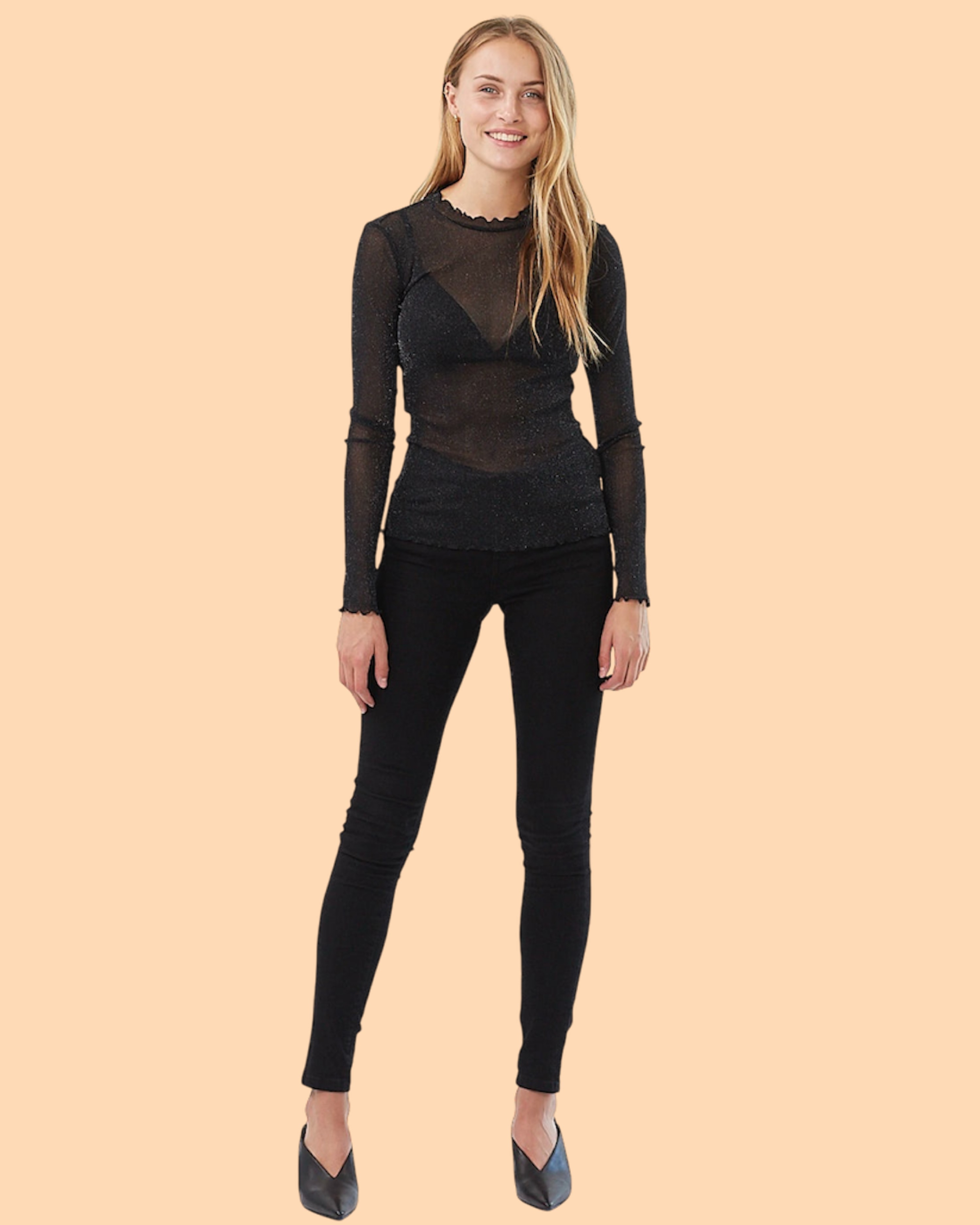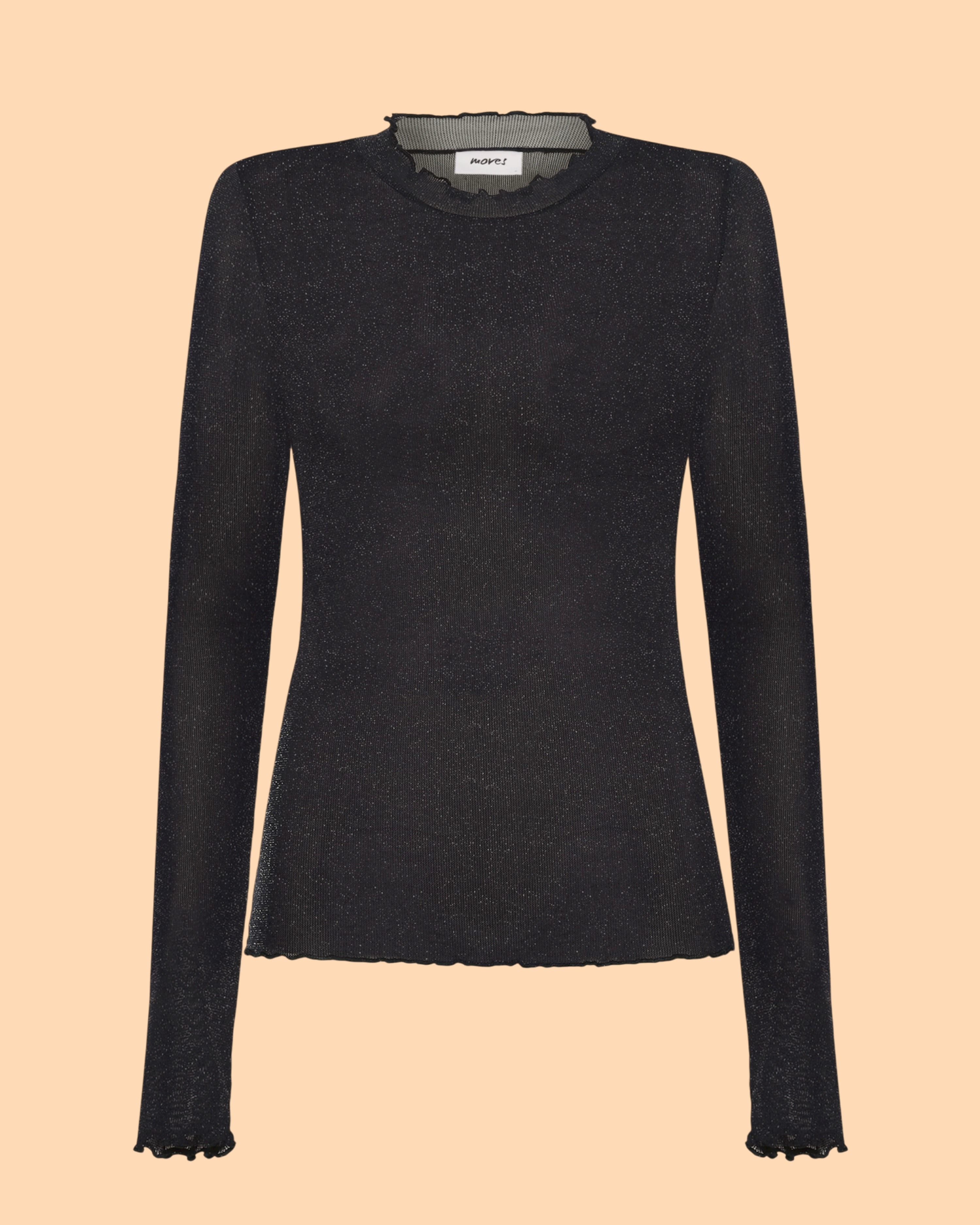 Das Markhild Long Sleeved T-Shirt Black von moves ist ein langärmeliges Mesh-Top mit glitzernden Tails. Es besteht aus 90% Polyamid, 5% Elastan und 5% Metallgarn für eine dehnbare und transparente Qualität.
