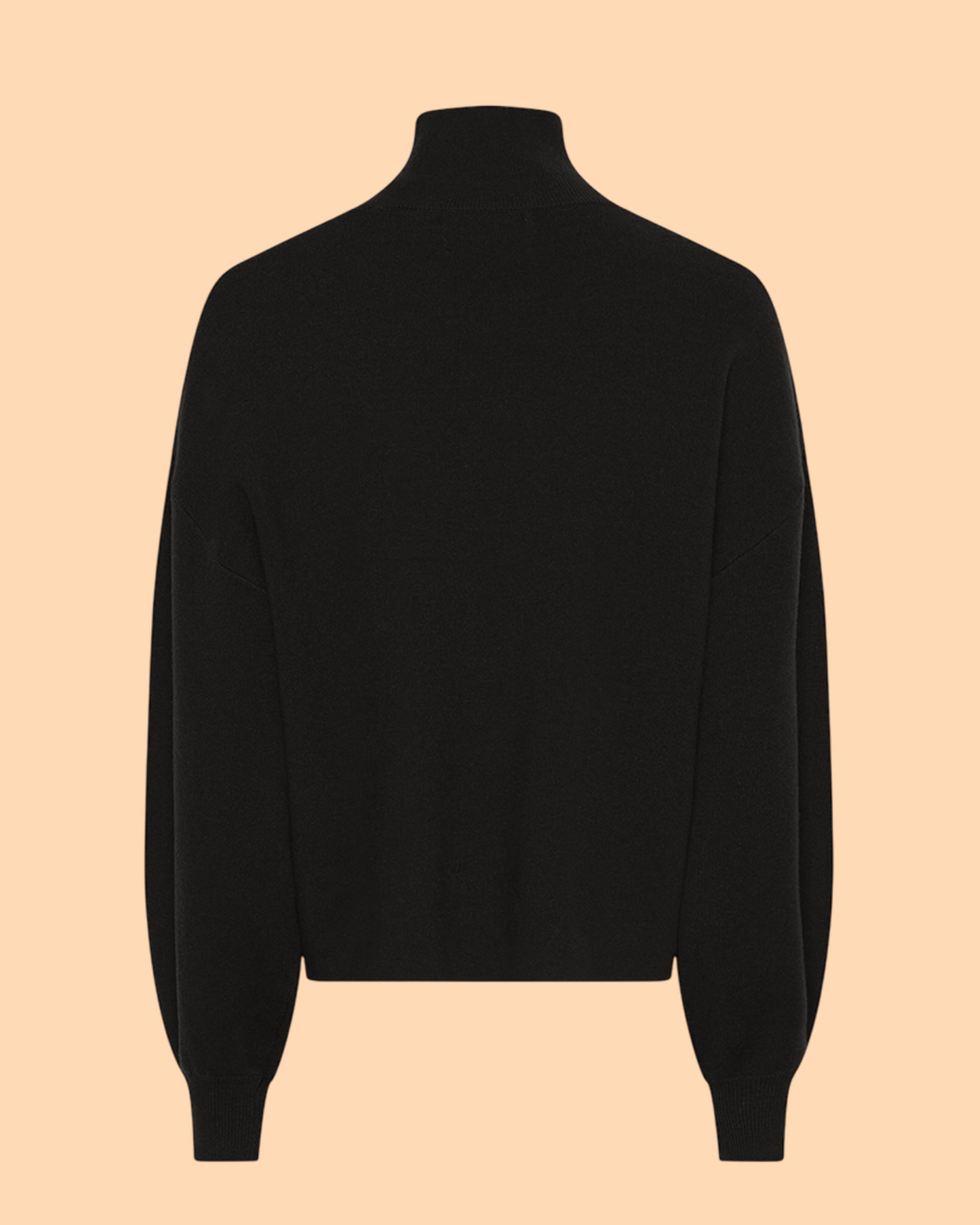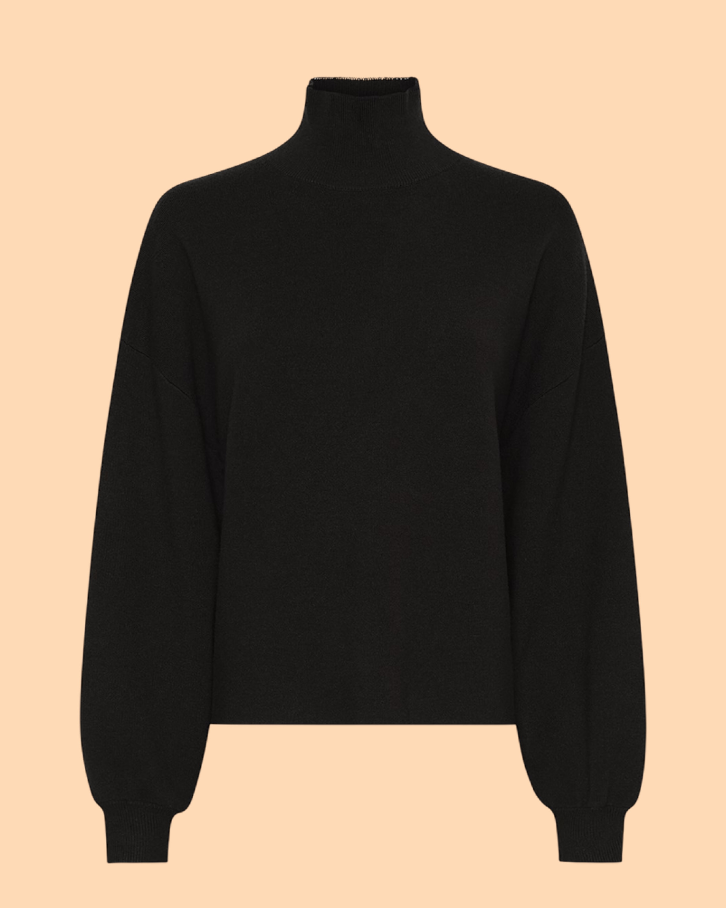 Der Mercy East M Pullover Black von MSCH COPENHAGEN ist aus weichem/ dickem Strick gefertigt. Er hat eine Boxy Fit-Passform, einen Turtleneck Kragen, überschnittene Schultern und locker geschnittene Ärmel mit hohen Rippbündchen.