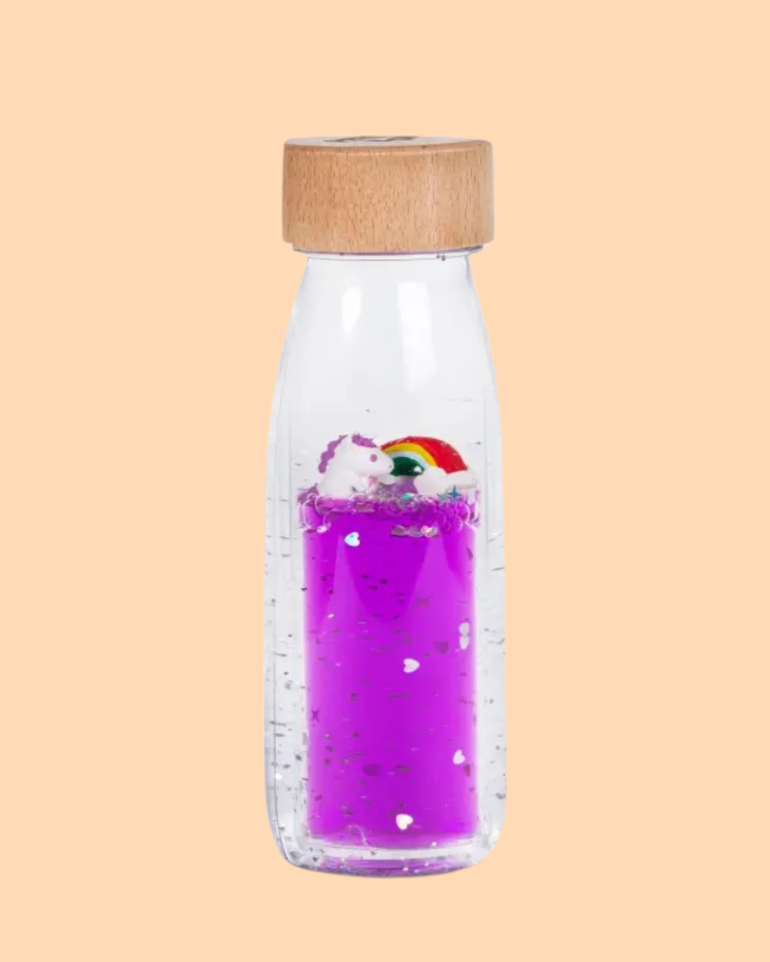 Die Move Bottle Magic Rainbow - lädt ein, in eine magische Welt voller Träume und Farben einzutauchen. Schüttel sie, zoome heran und entdecke , wohin dich der Regenbogen führt, den das legendäre Märchen-Einhorn an den Himmel gemalt hat. Träumereien vom Schweben. Wie wäre es wohl, einen Traum in einer Flasche einzufangen? Mit dieser Serie wollte Petit Boum es herausfinden. Jedes Mal, wenn man die Flasche schüttelt, beginnt die Reise! Planeten, Astronauten, Tiere beginnen mit der Veränderung der Dichte der Flüssigkeit zu schweben, in einem traumhaften Blasenmeer, das die Fantasie beflügelt und so dabei hilft, sich zu entspannen.