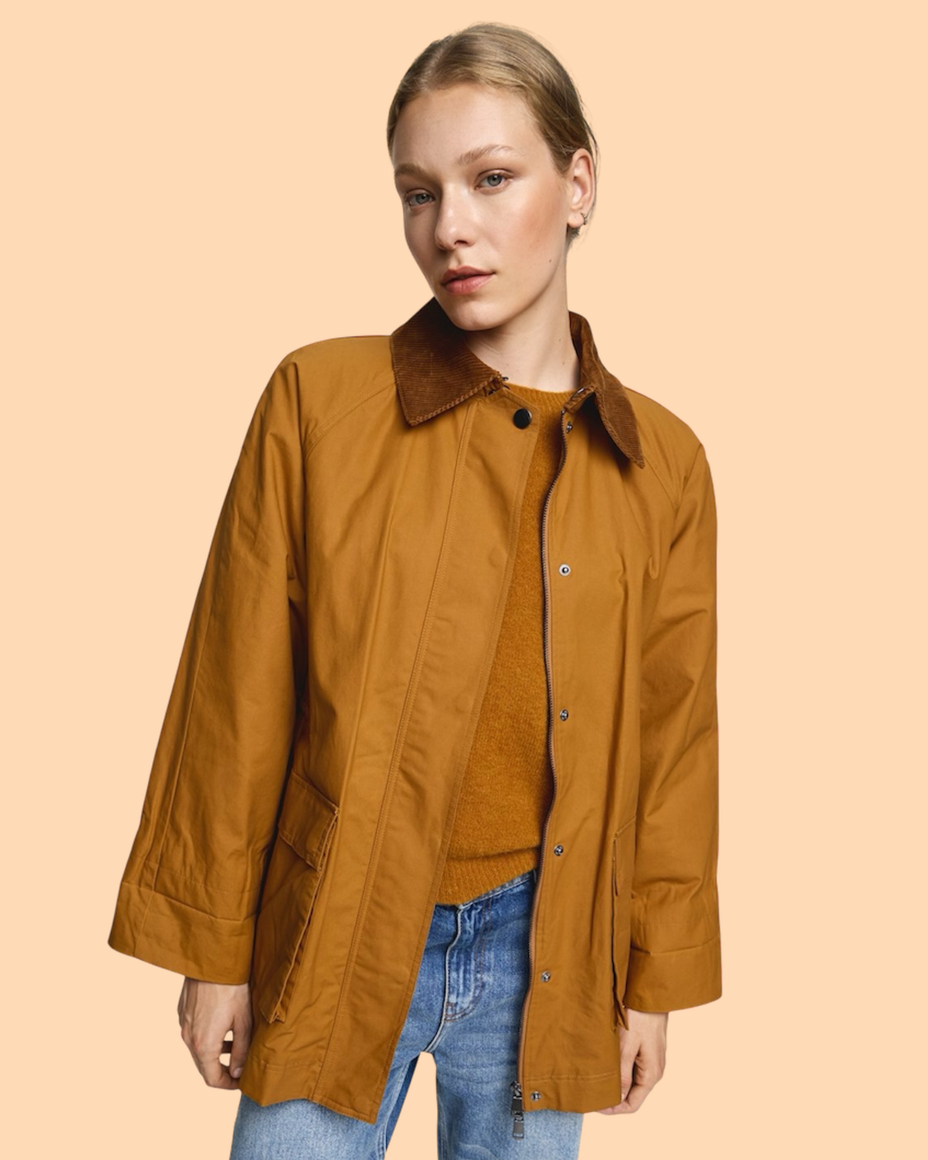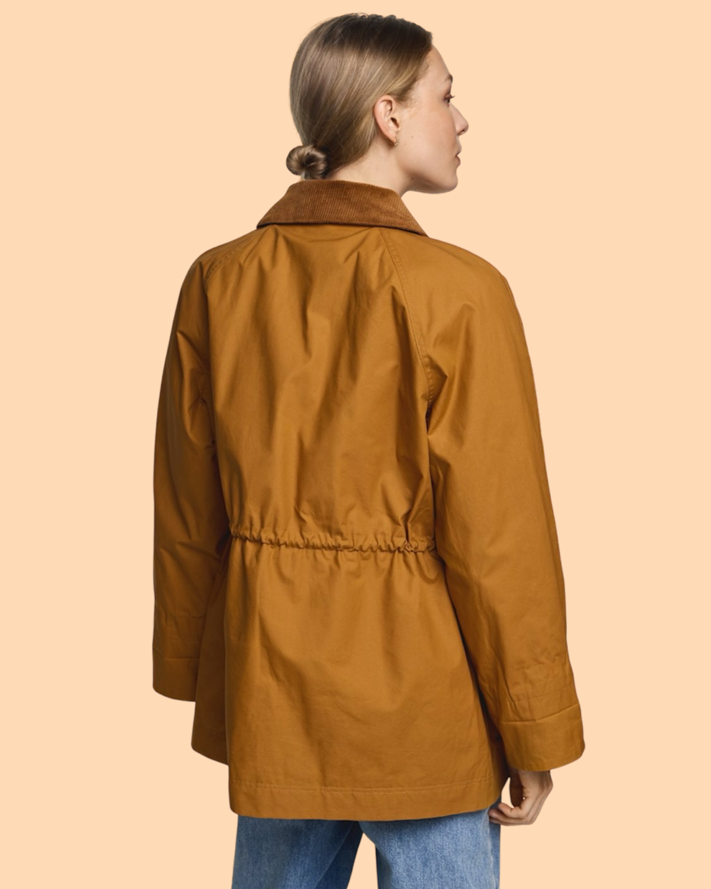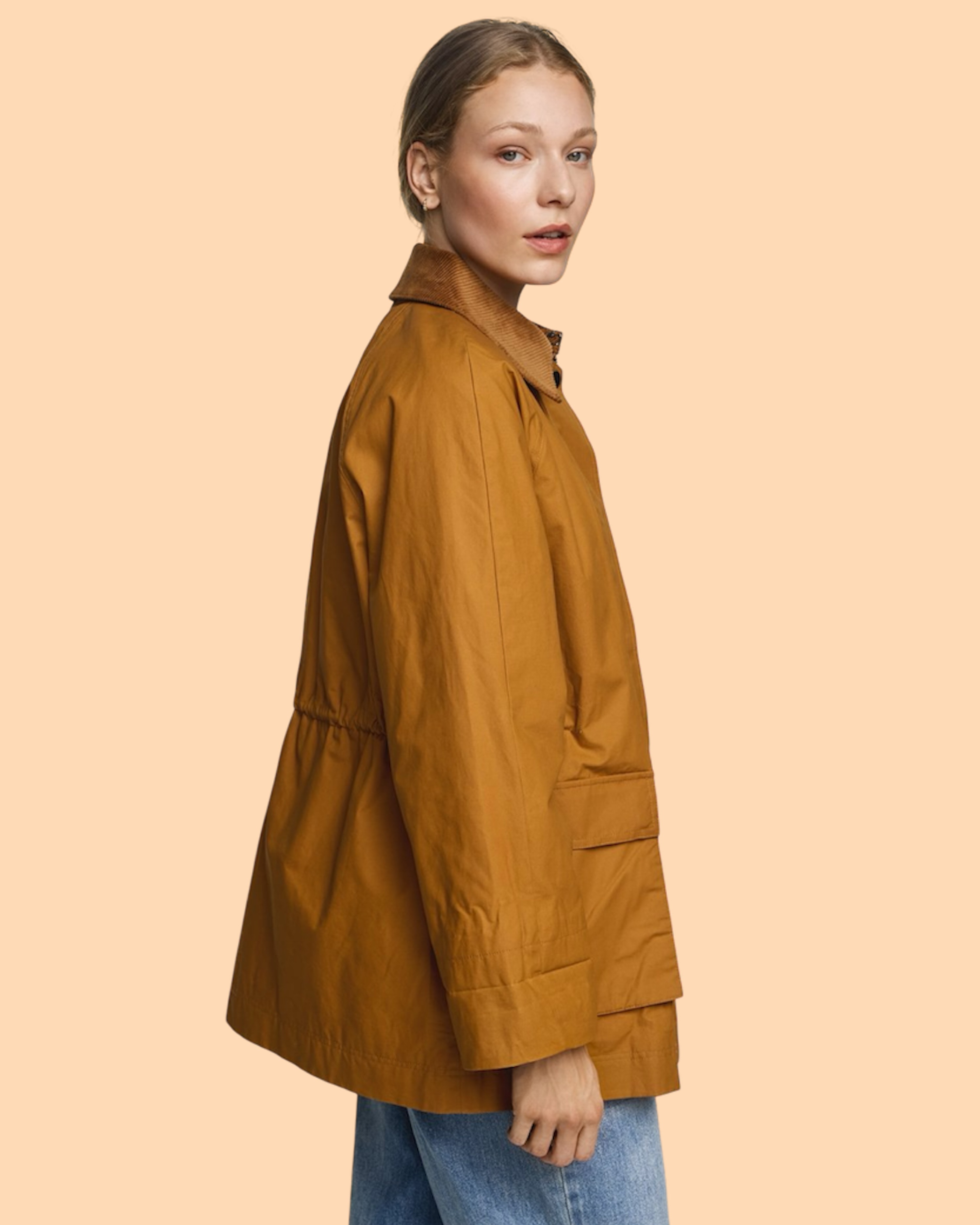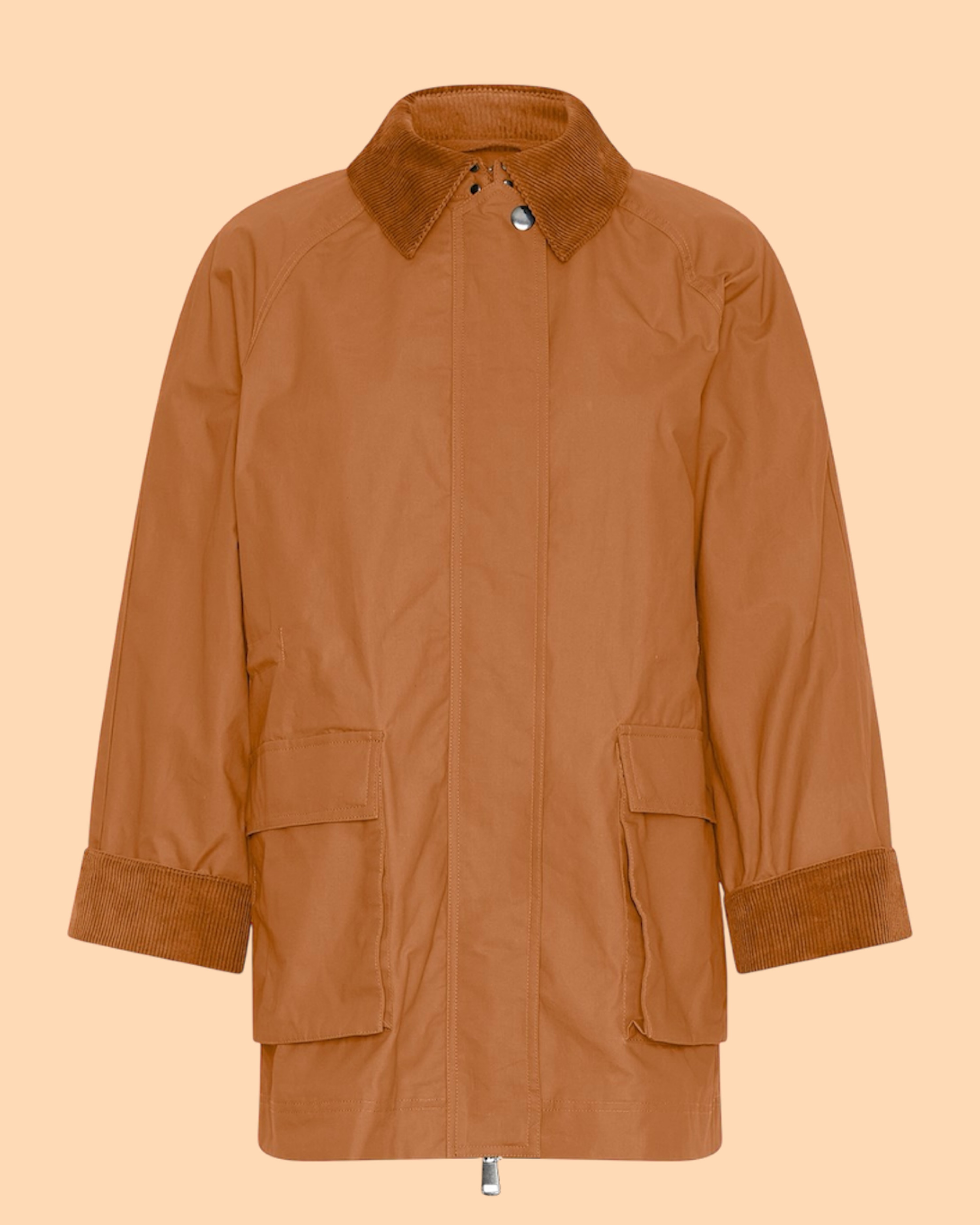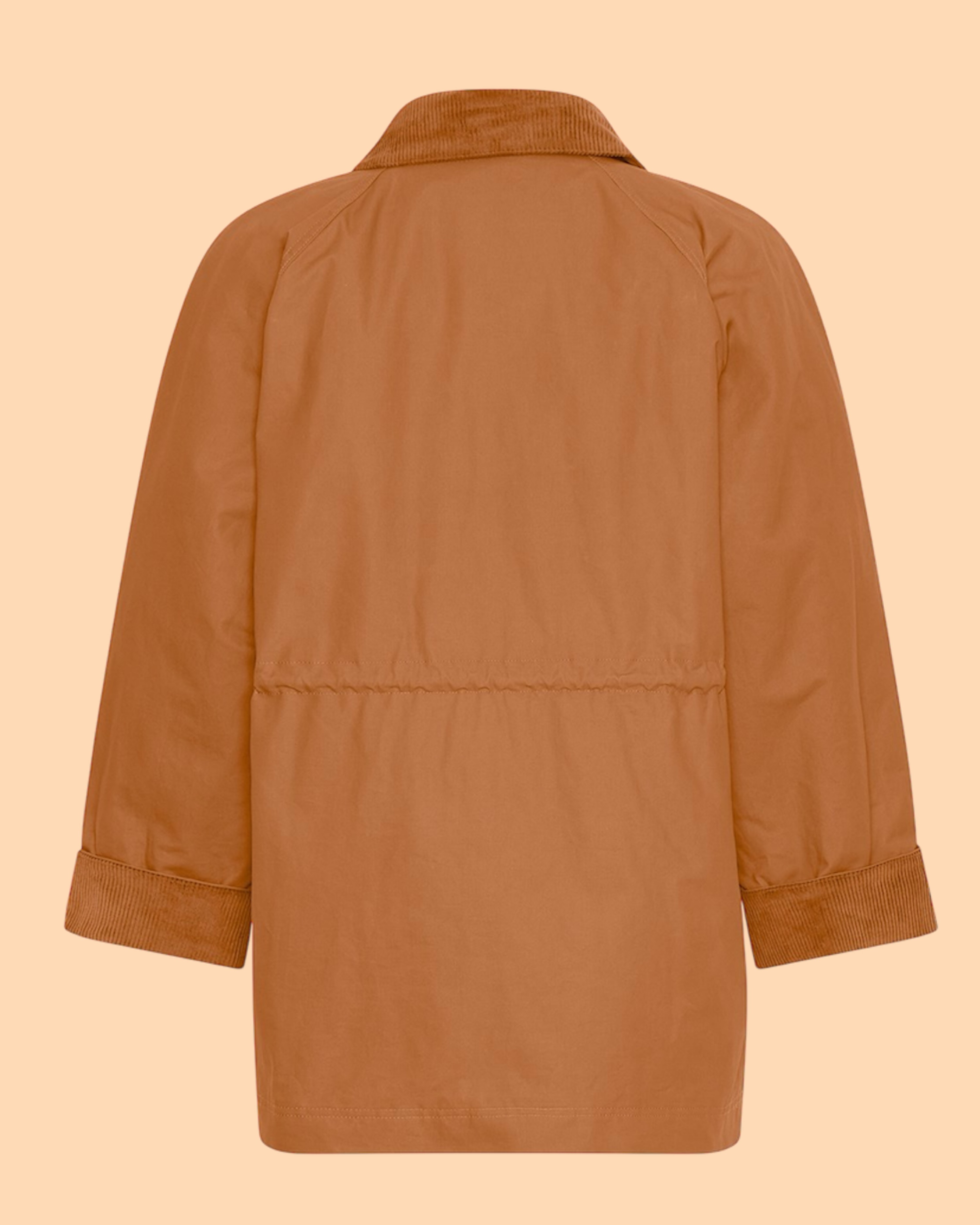 Die Oana Jacket Cathay Spice von MSCH COPENHAGEN ist eine leicht wattierte Jacke mit Corddetails. Sie hat lockere Passform, Raglanärmel, einen Hemdkragen, aufgesetzte Taschen mit Druckknöpfen, eine Kordel in der Taille, einen Zipper und Druckknöpfen.