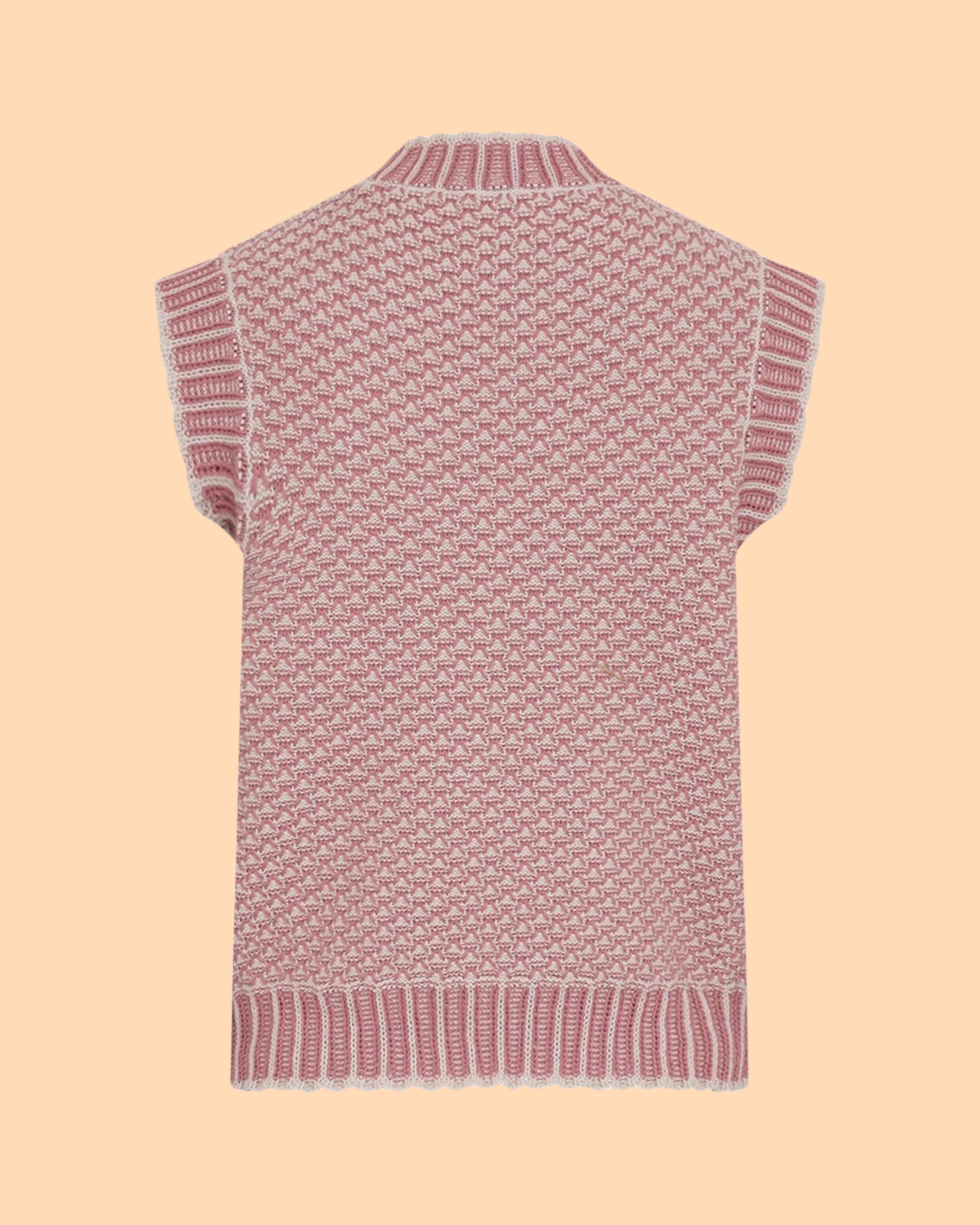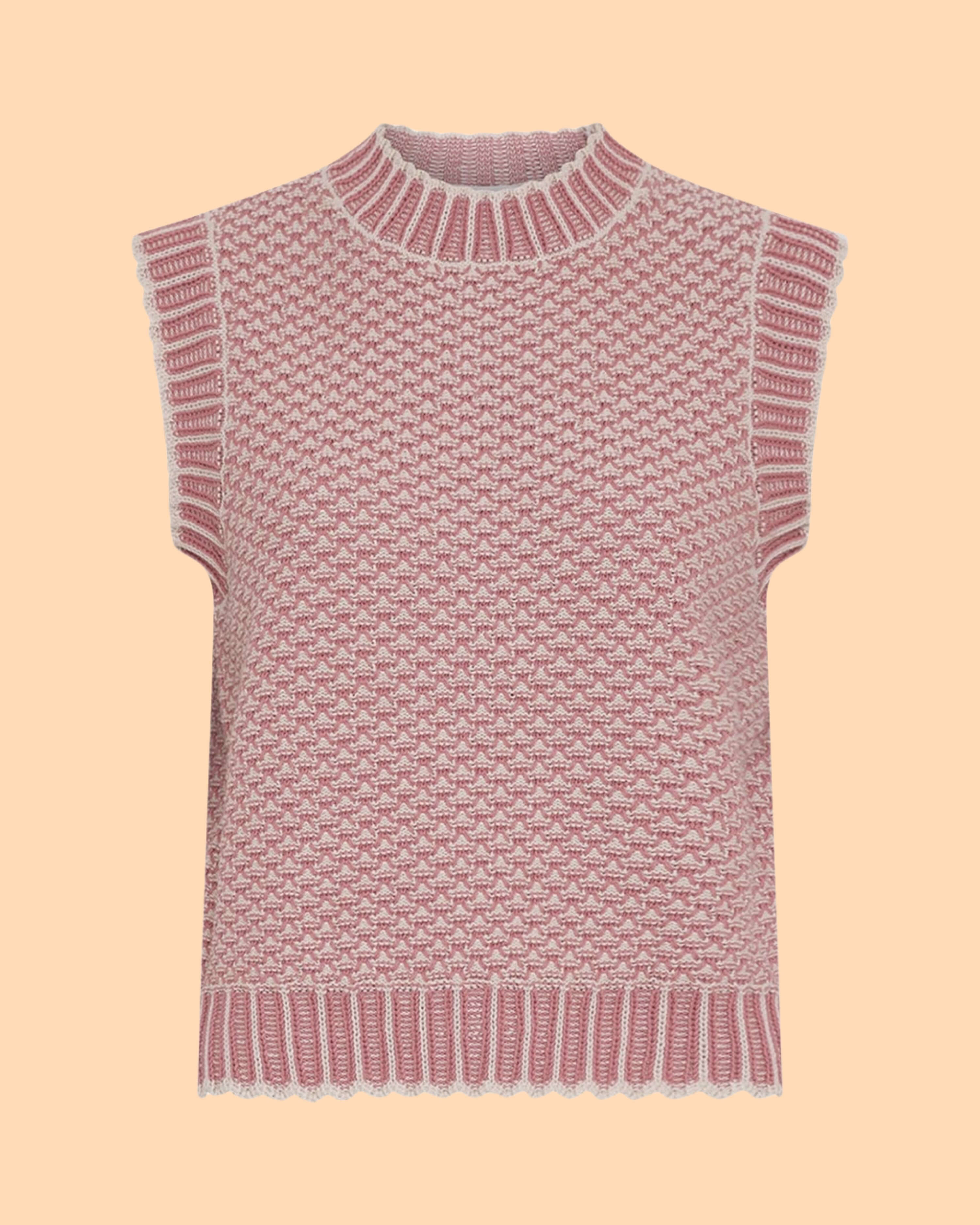 Die Pilla Vest Oatmeal Rose von MSCH COPENHAGEN iGestrickte Weste mit zweifarbigem Muster. Mit geripptem Rundhalsausschnitt, geripptem Saum und ärmelloser Silhouette.Das Model ist 1,77m groß und trägt Größe S/M.