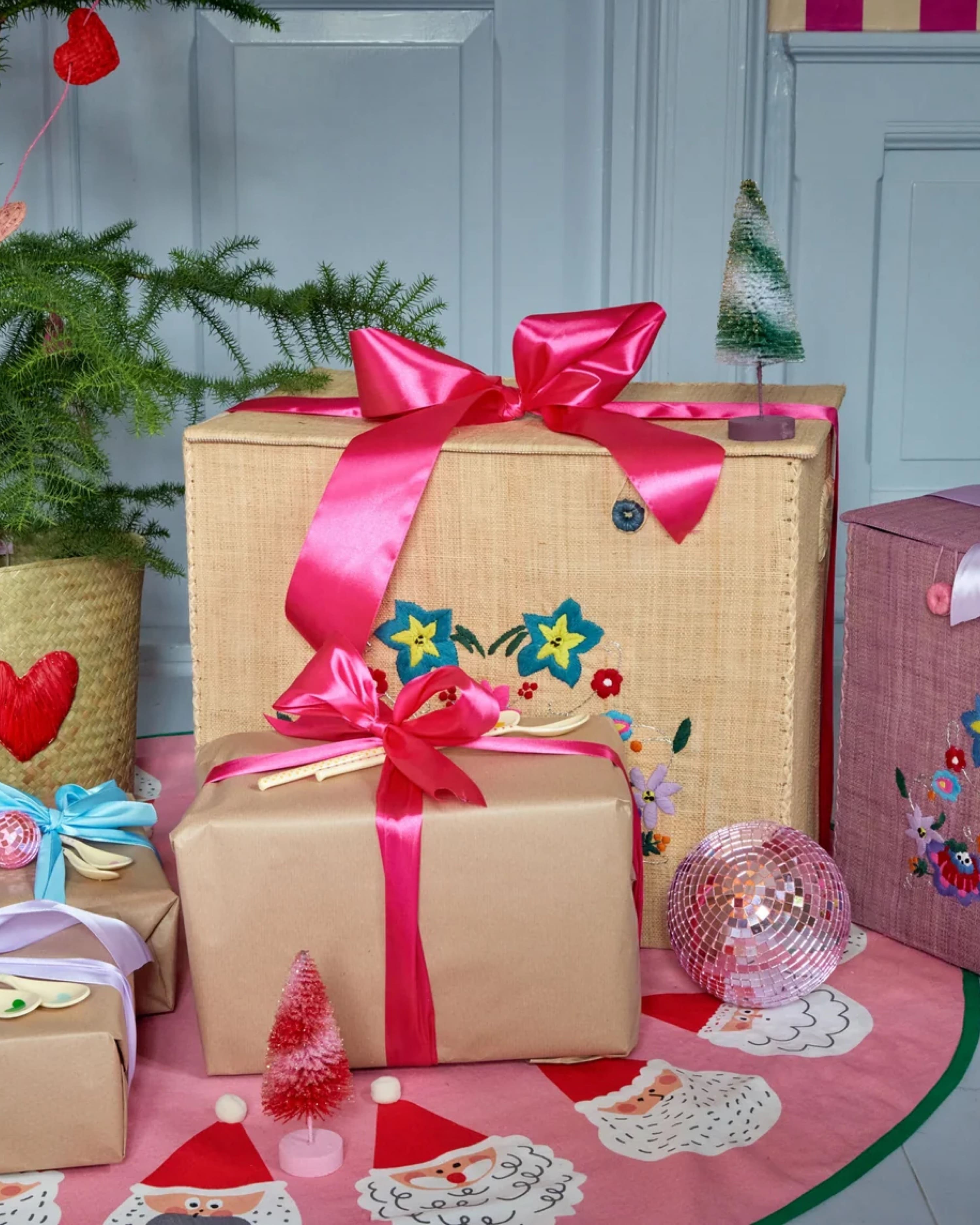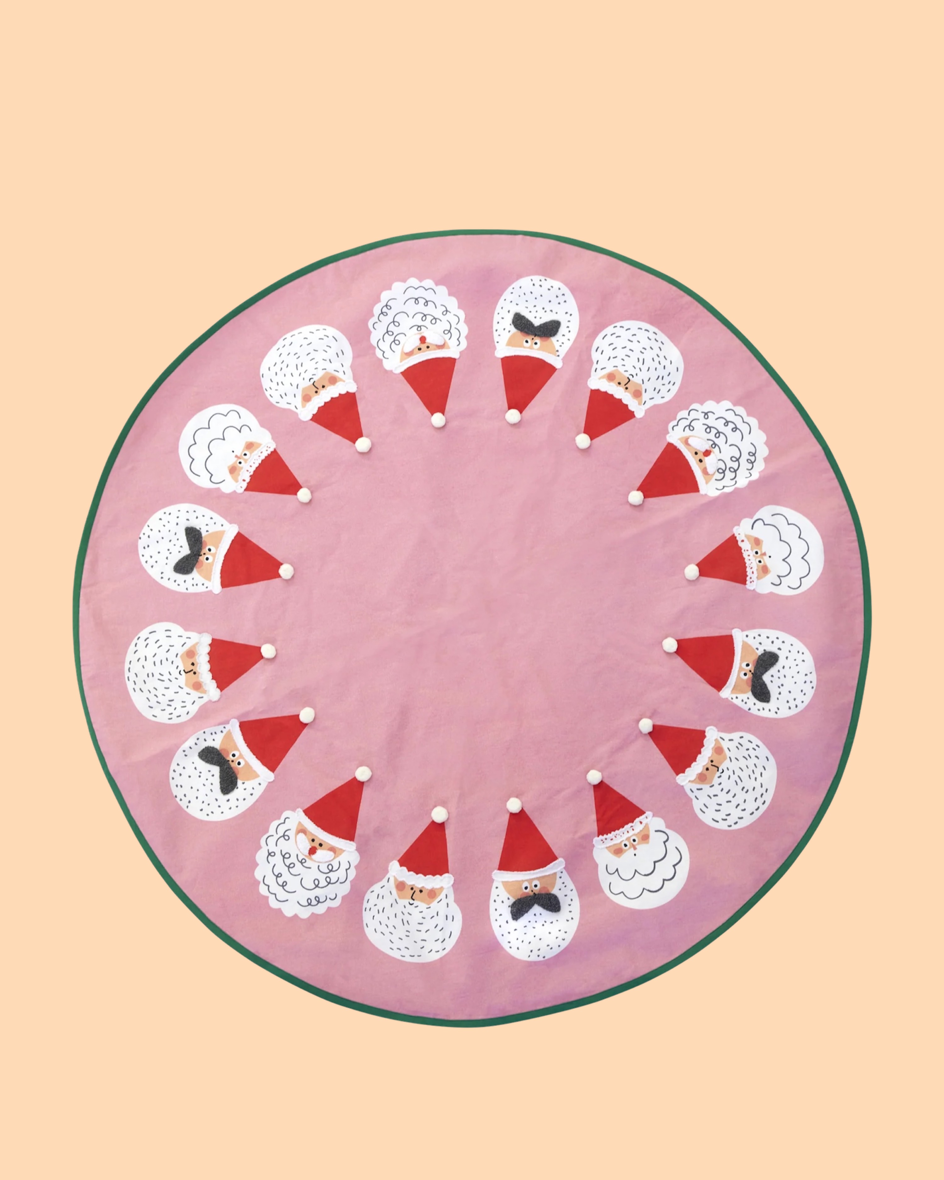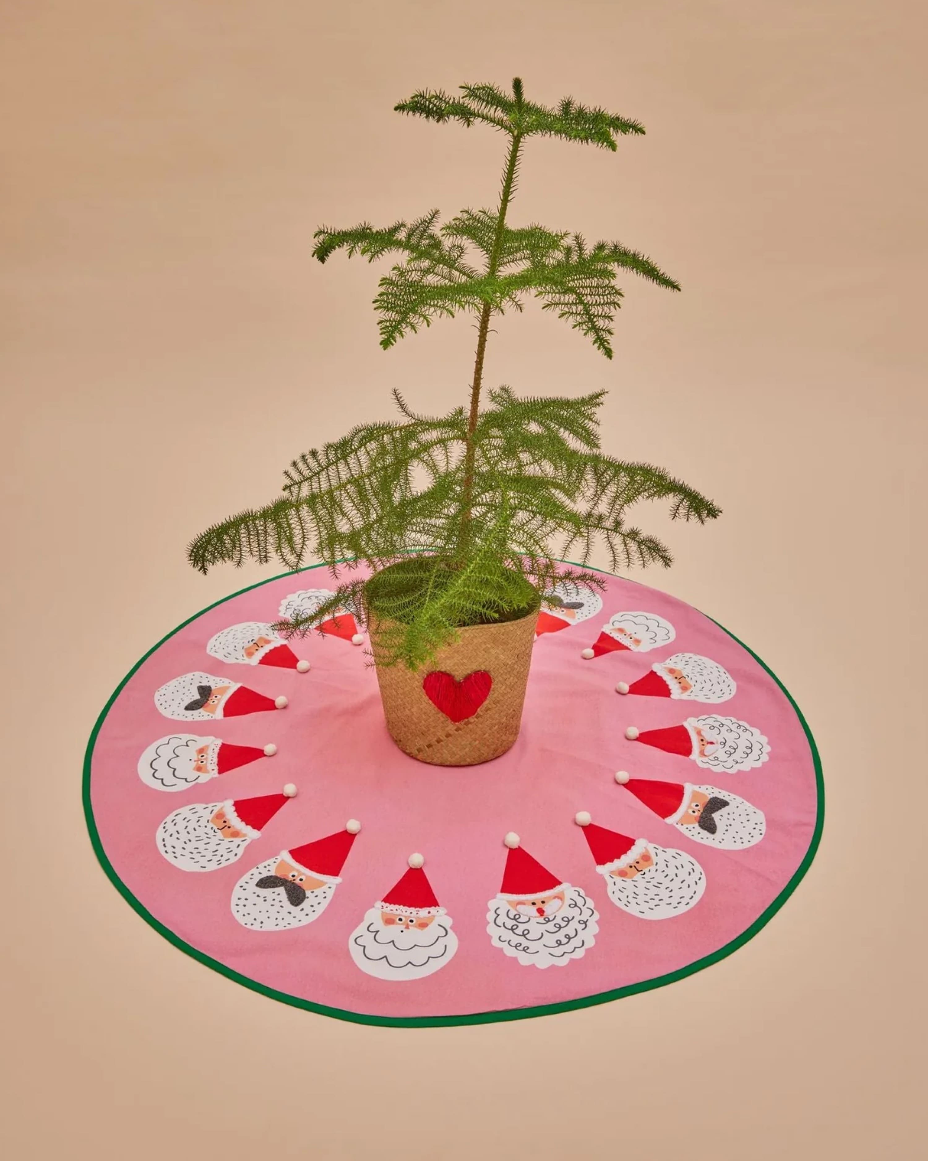 Verleihe deinem Weihnachtsbaum mit dem bezaubernden Round Cotton Christmas Tree Carpet Pink von Rice einen Hauch von Magie. Er hat niedliche Weihnachtsmänner und einen dunkelgrünen Besatz. Perfekt, für gemütliche Stimmung an den Feiertagen!
