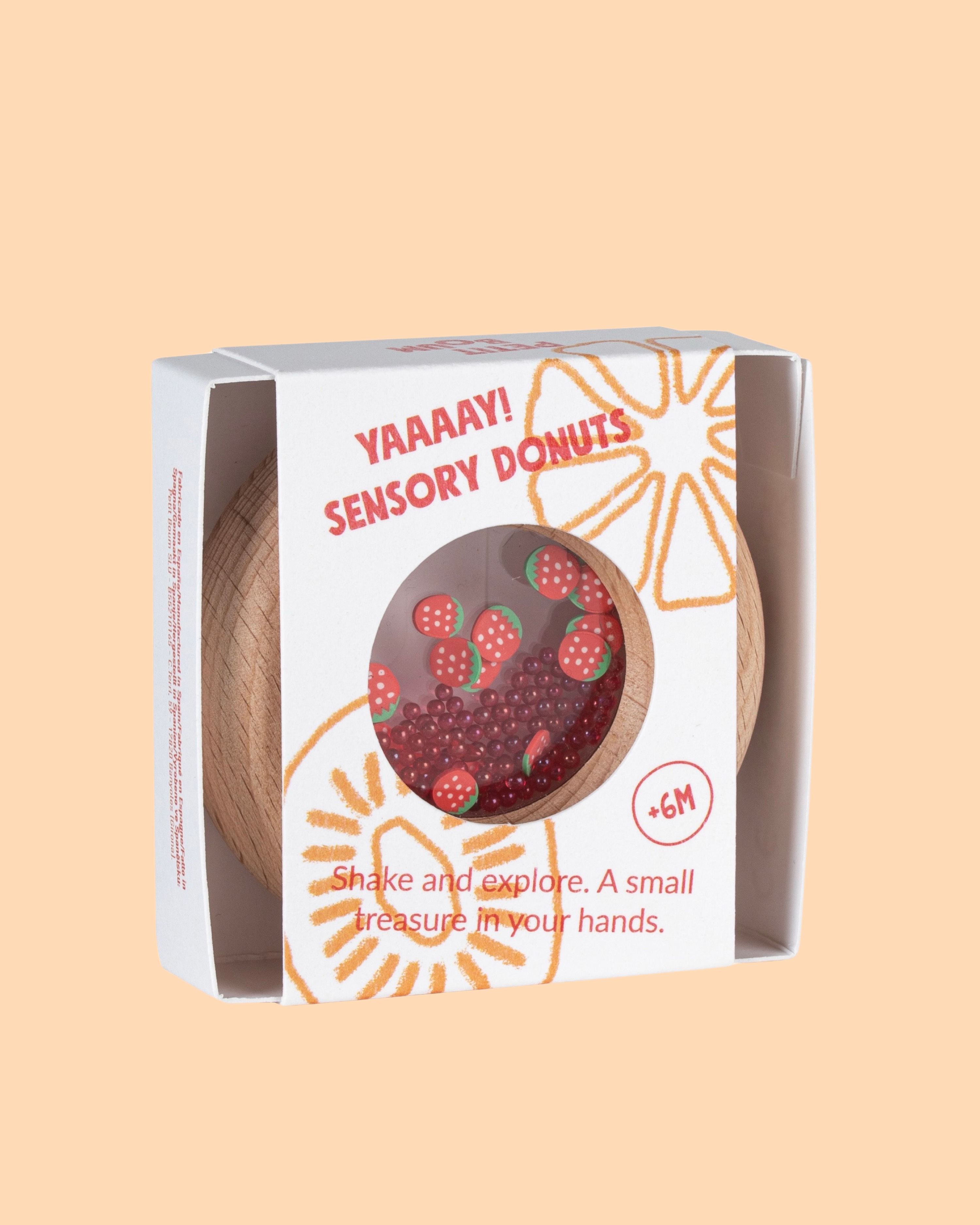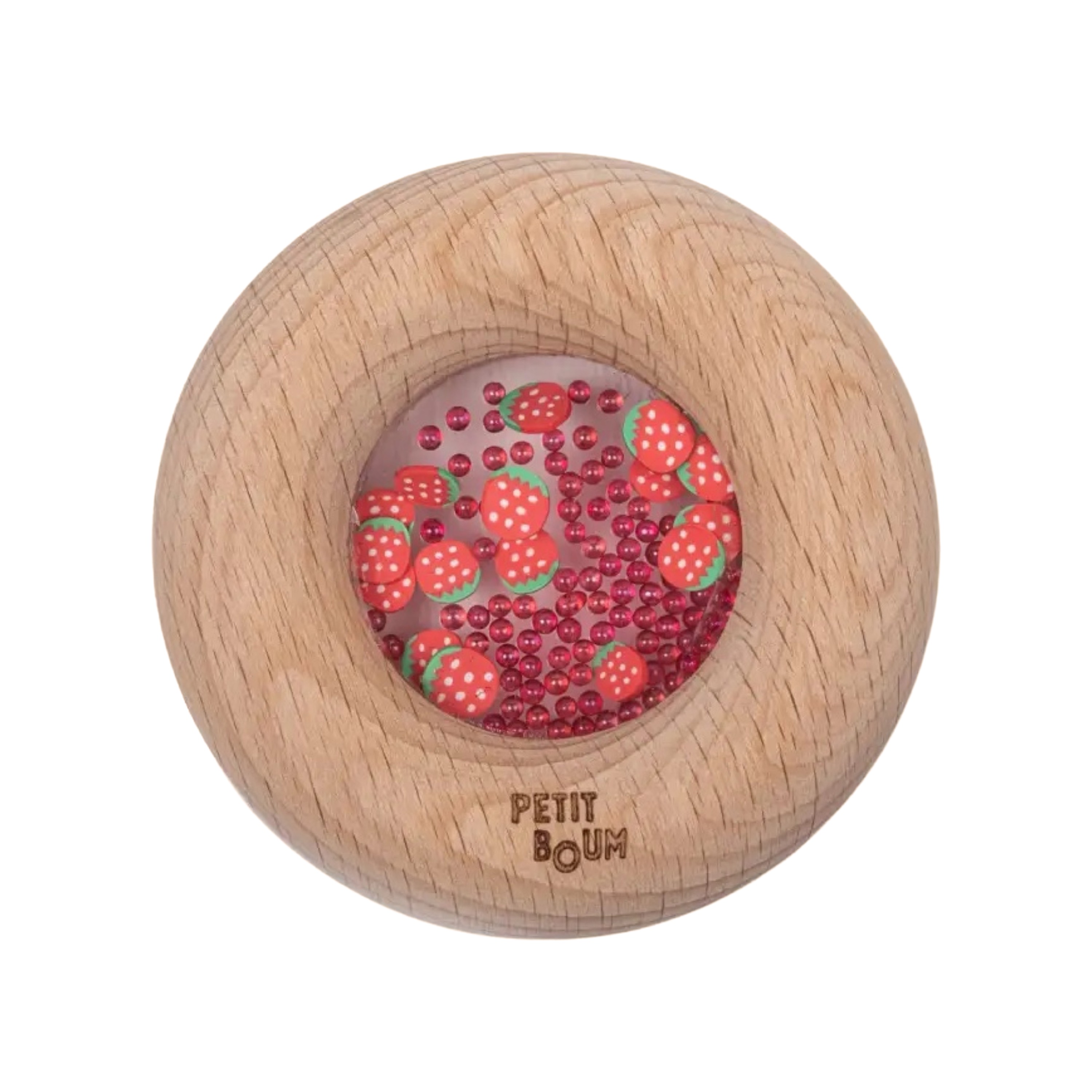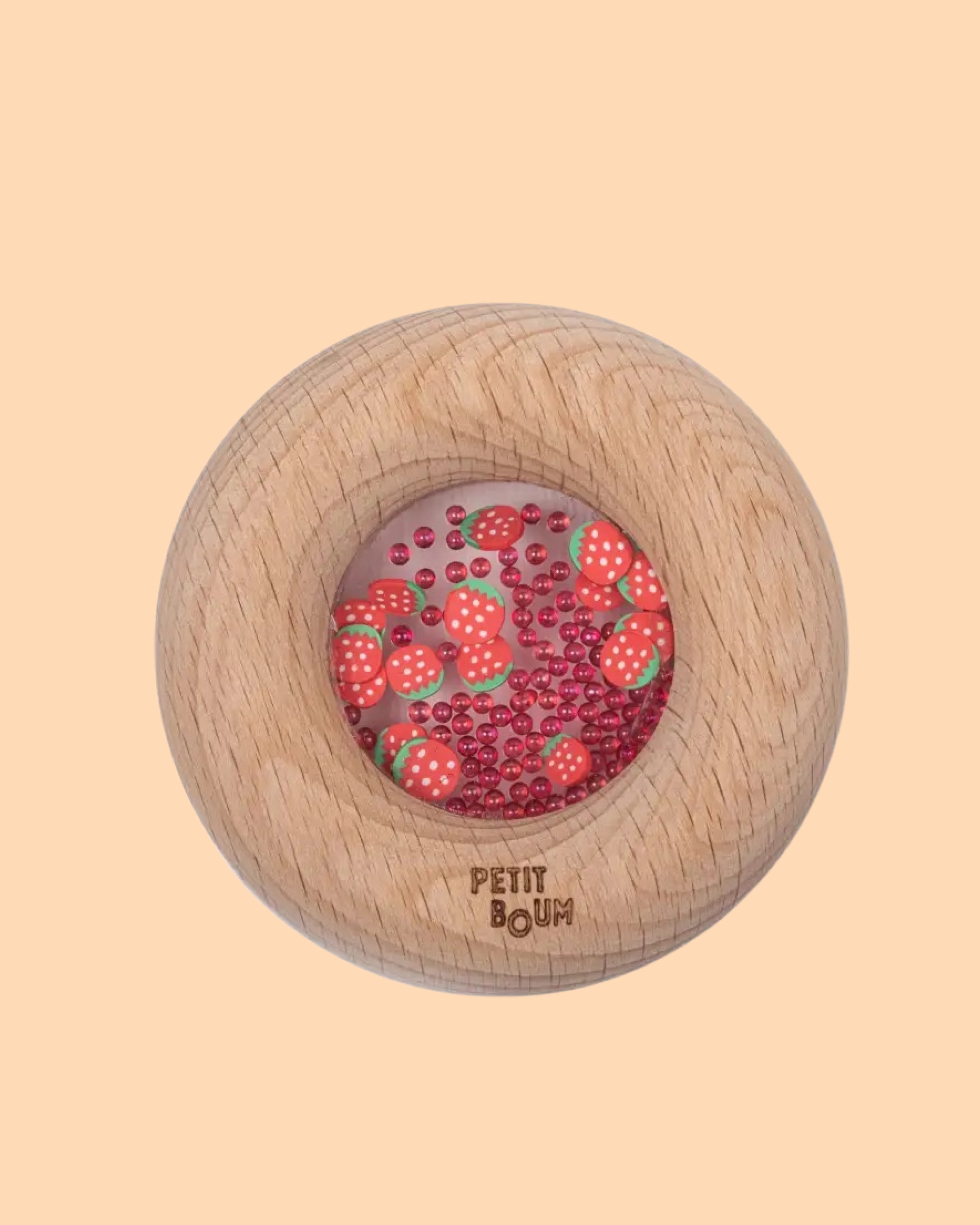 Die Sensory Donuts Strawberries von Petit Boum ist eine donutförmige Holzrassel, die sich perfekt für Babys Hände eignet. Im Inneren befinden sich Obst- und Gemüsefiguren, die beim Schütteln einen interessanten Klang erzeugen. Auch wenn es verlockend ist, sie zu essen, besteht sie aus natürlichem, giftfreiem und bissfestem Buchenholz.