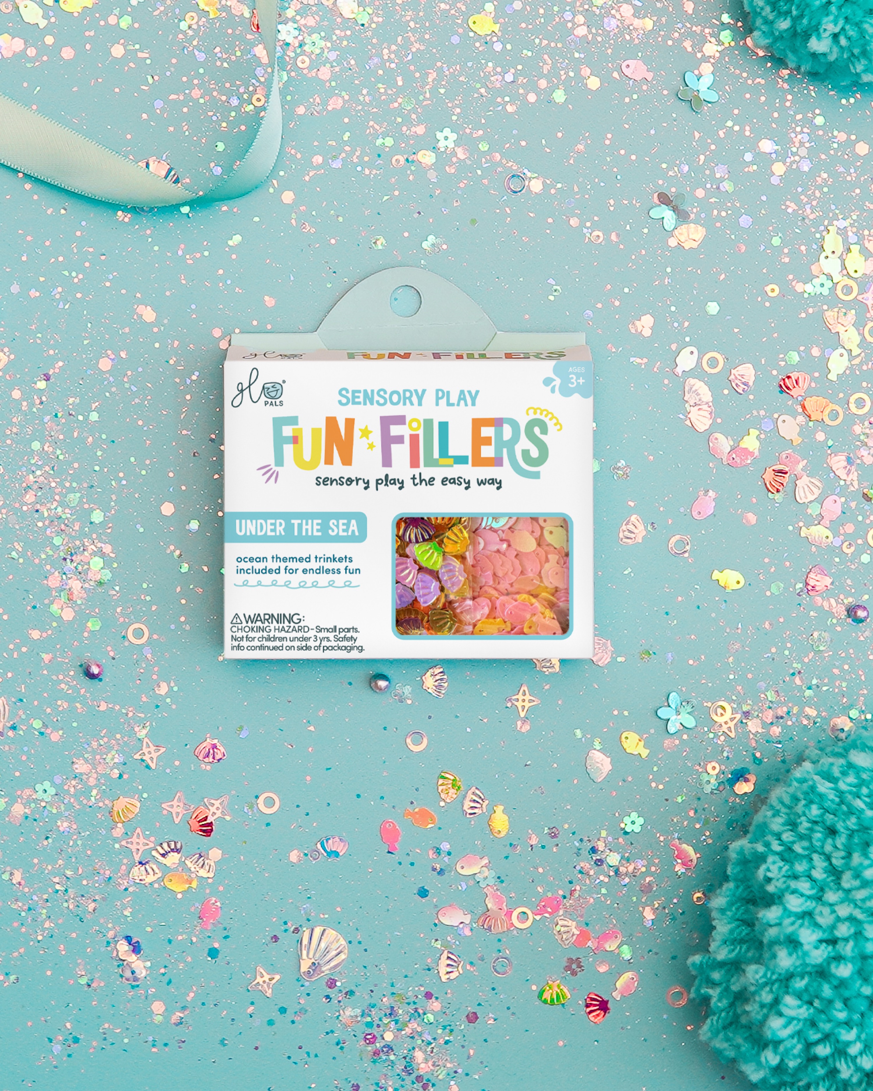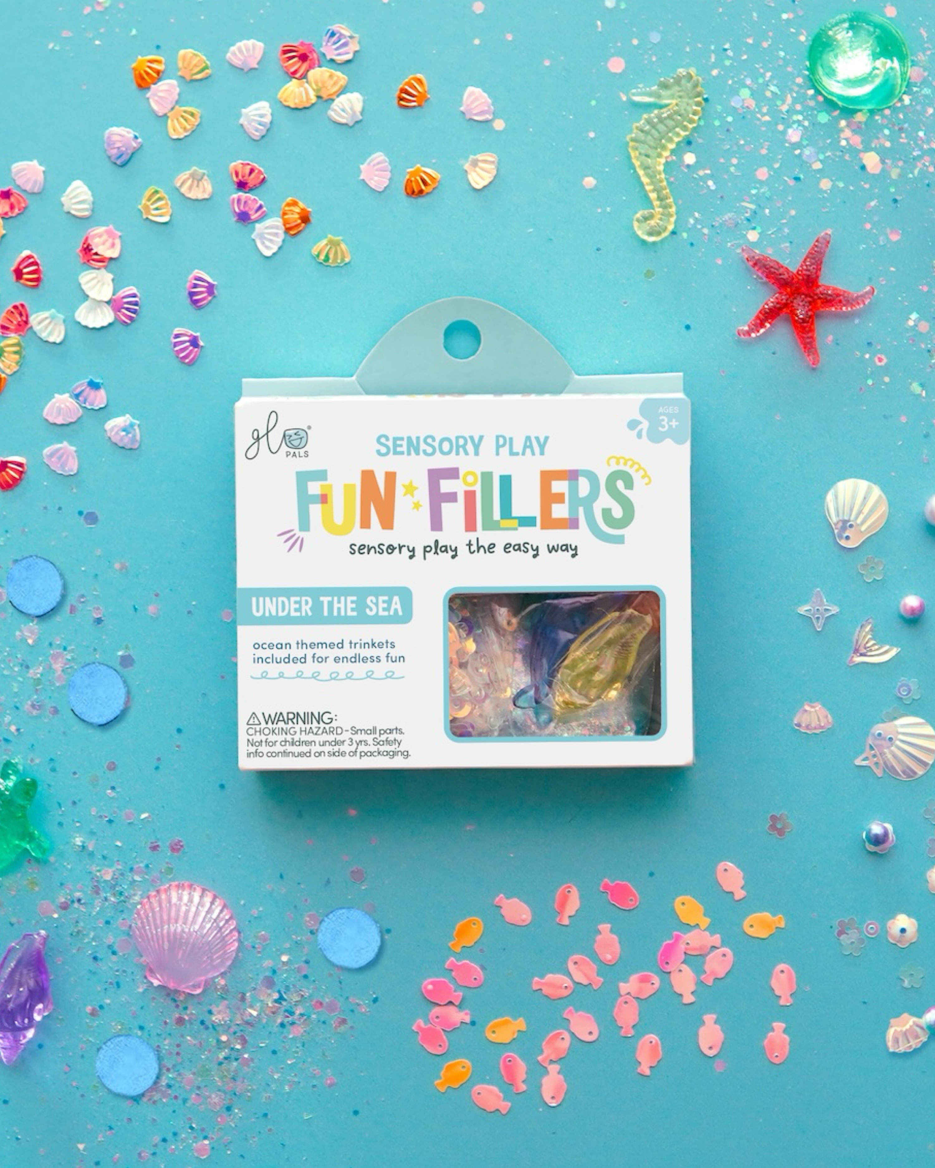 Die Sensory Fun Fillers Sea von Glo Pals fördern Kreativität, Feinmotorik und Sinnesentwicklung. Jedes Set enthält themenspezifische Accessoires, die mit sensorischen Spielbehältern oder auch mit Wasser, Reis, Schleim, Knete.. kombiniert werden können.