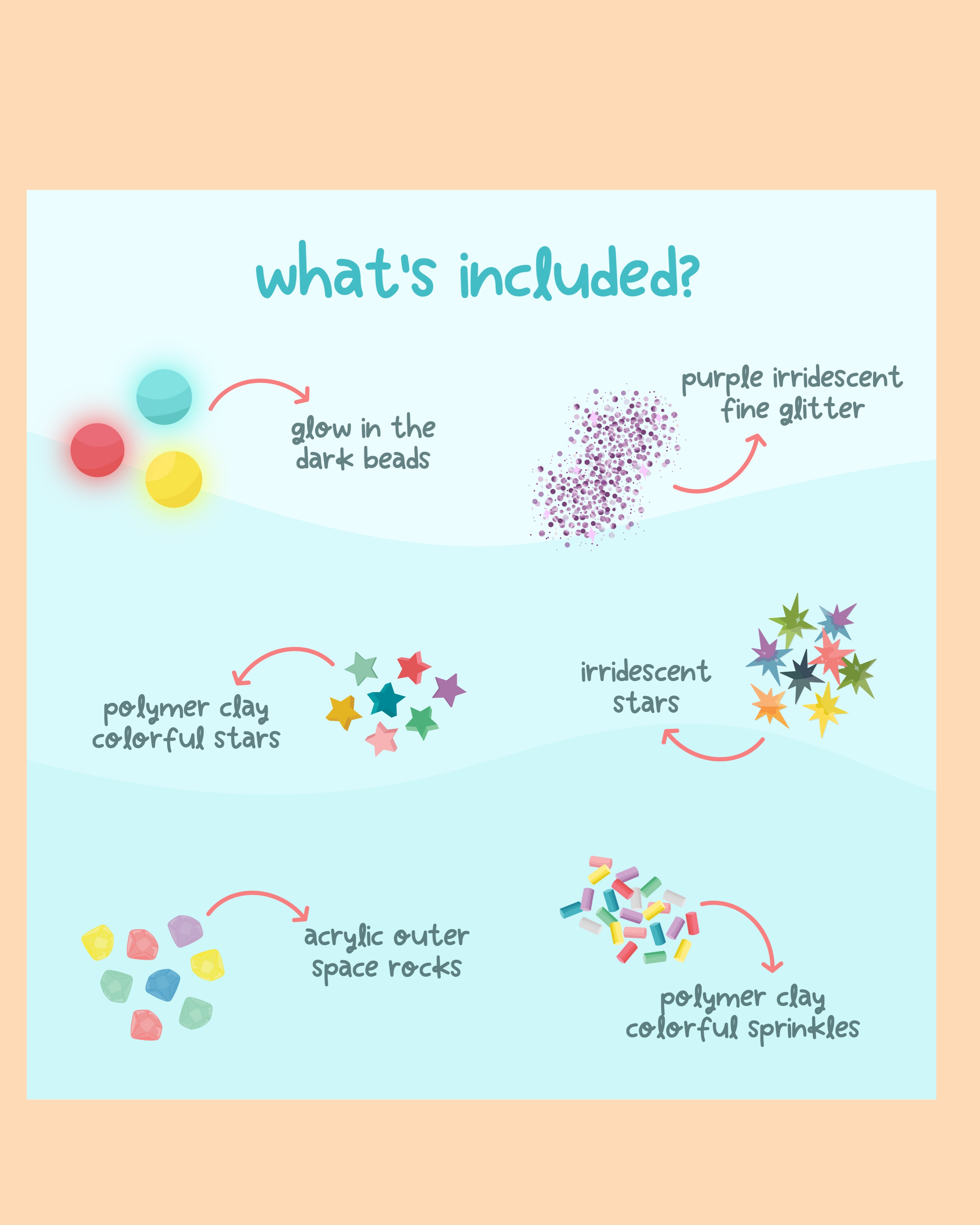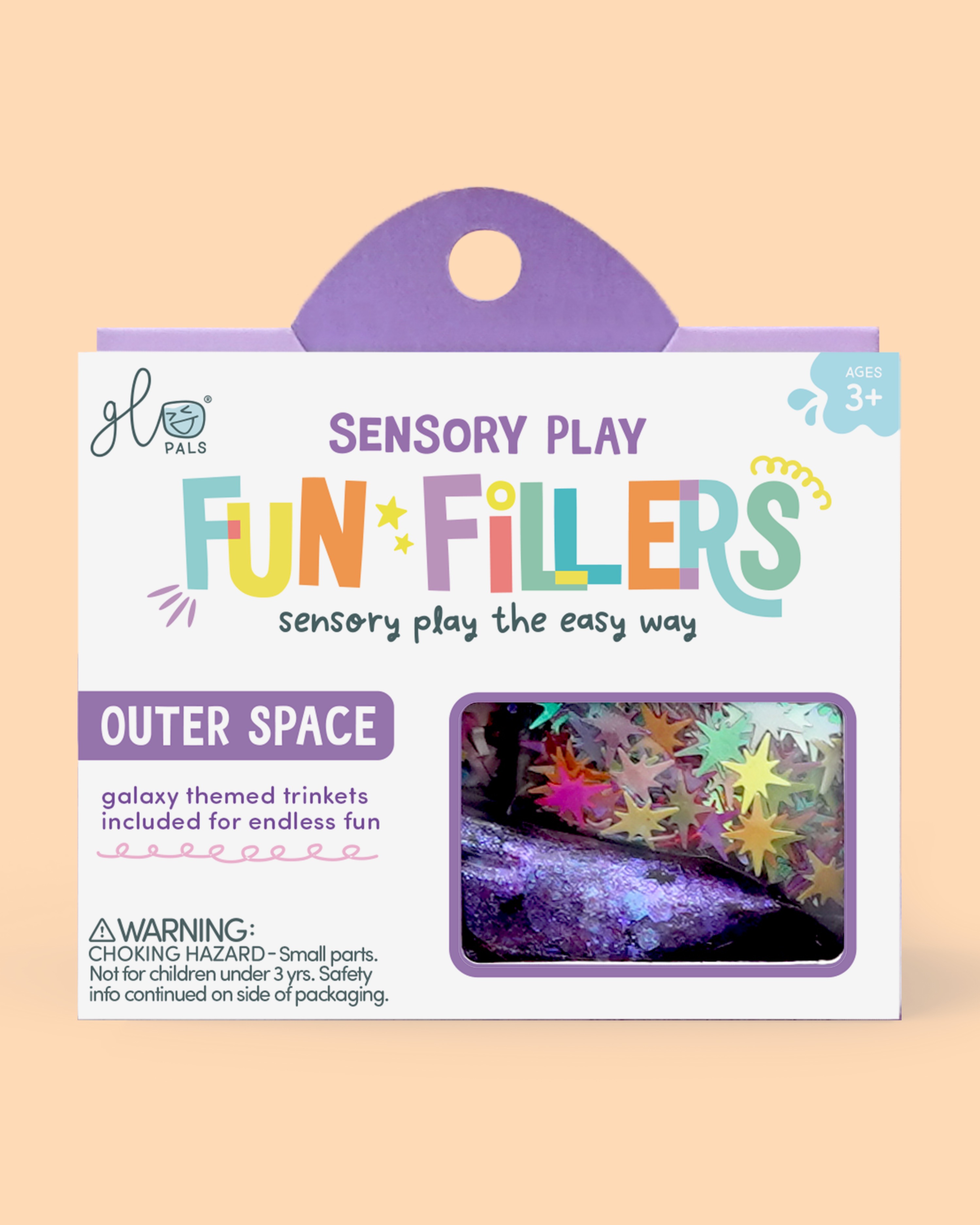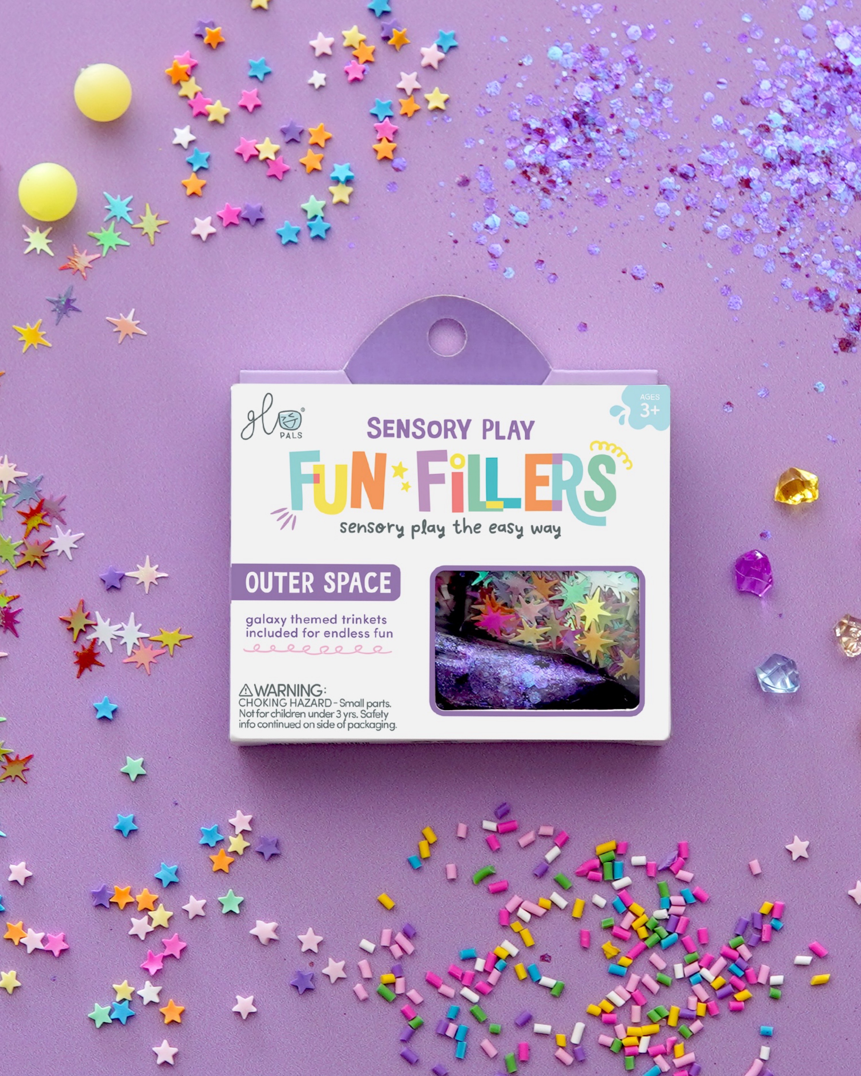 Die Sensory Fun Fillers Space von Glo Pals fördern Kreativität, Feinmotorik und Sinnesentwicklung. Jedes Set enthält themenspezifische Accessoires, die mit sensorischen Spielbehältern oder auch mit Wasser, Reis, Schleim, Knete.. kombiniert werden können.