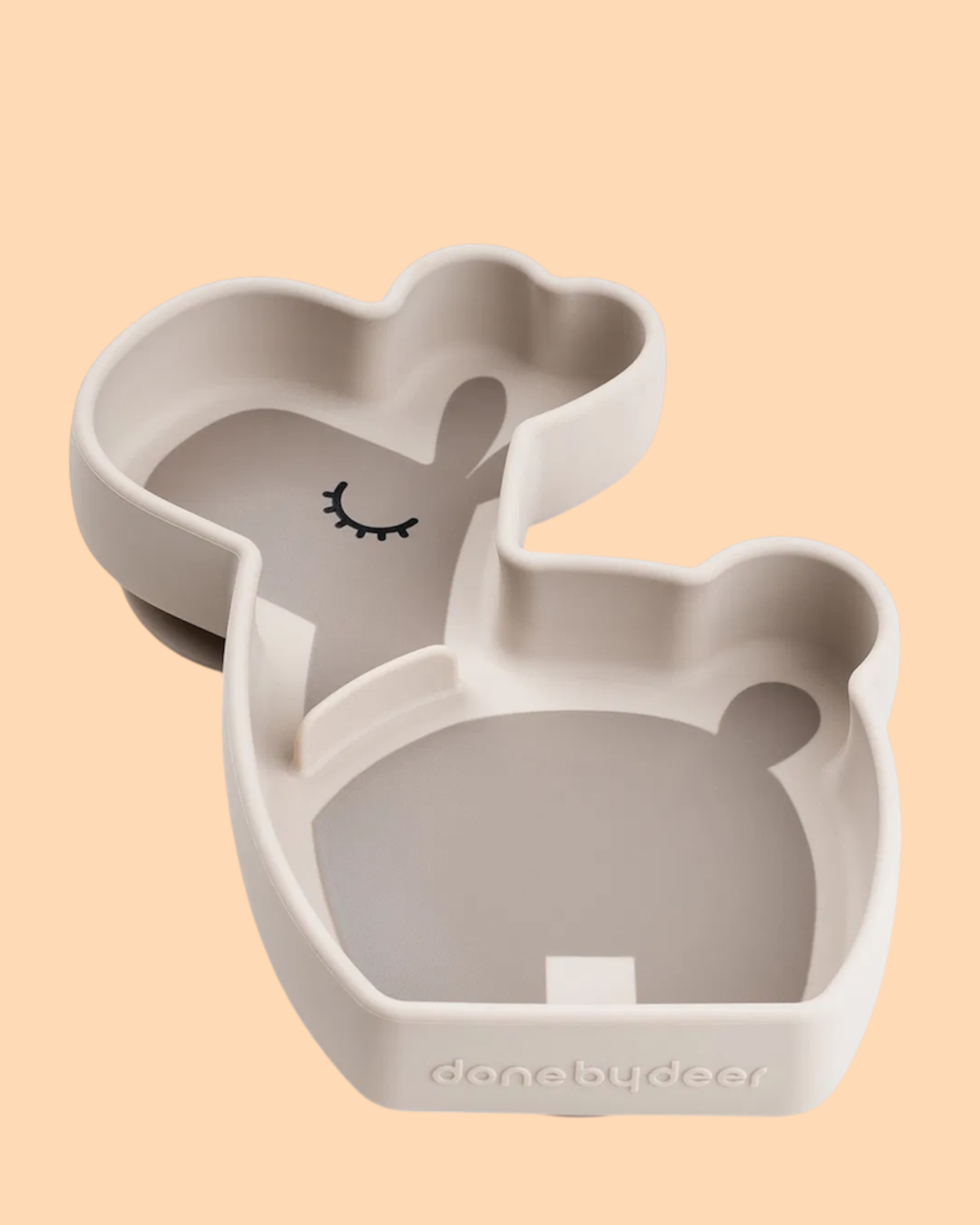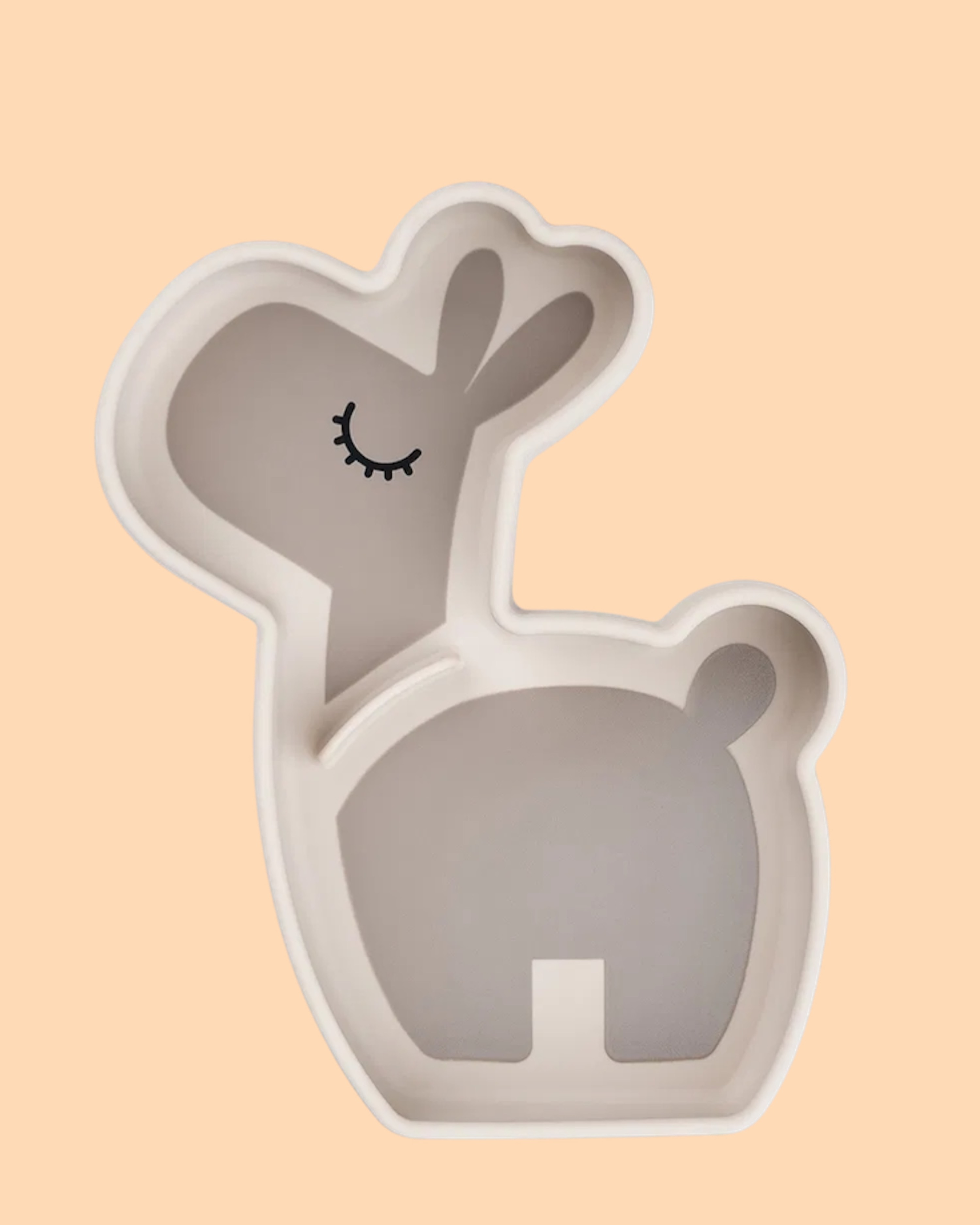 Der Silicone Stick&Stay Snack-Teller Lalee Sand von Done by Deer ist ein unterteilter Teller in einer süßer Lama-Form. Dank dem praktischen Saugnapf bleibt der Menüteller an Ort und Stelle.