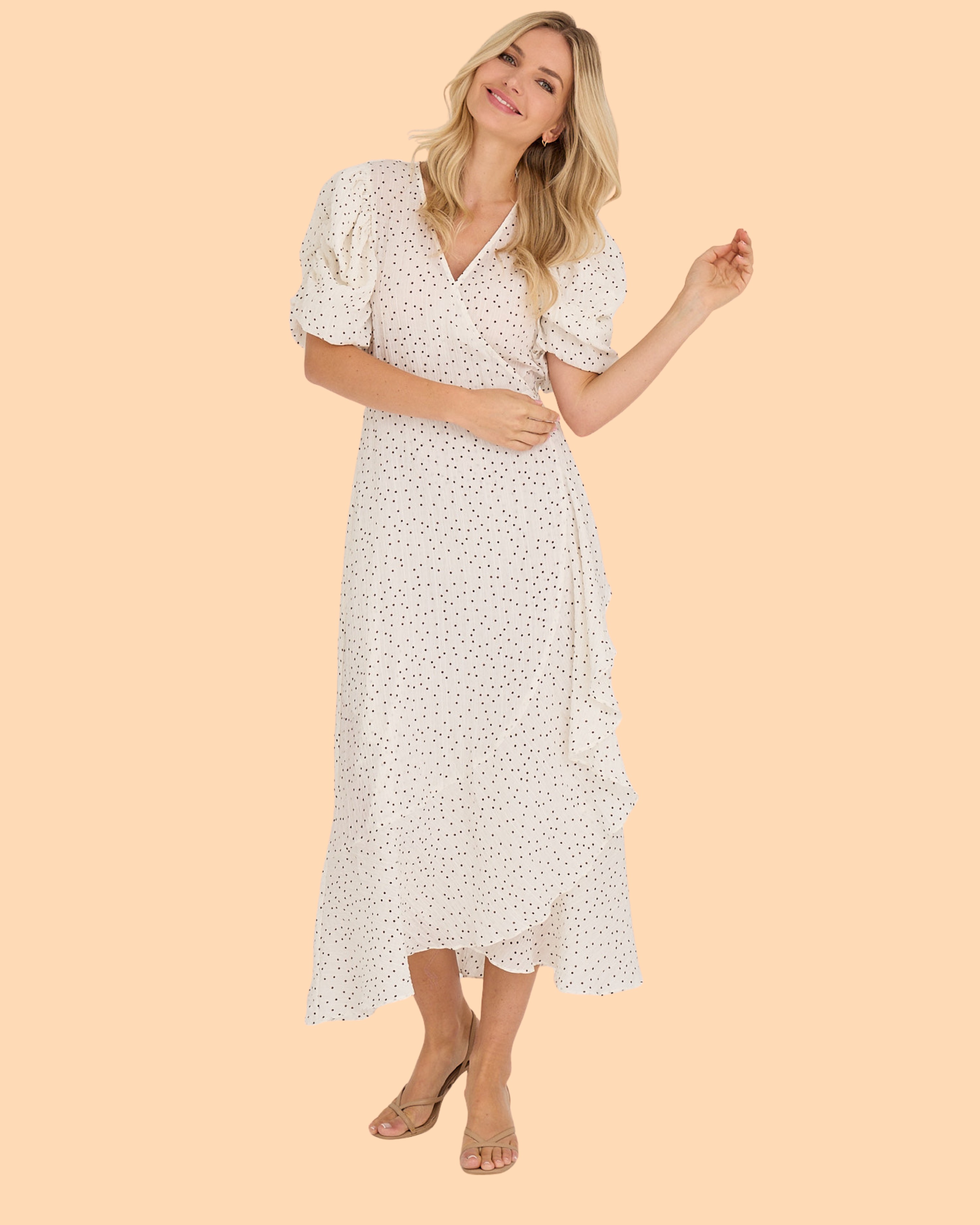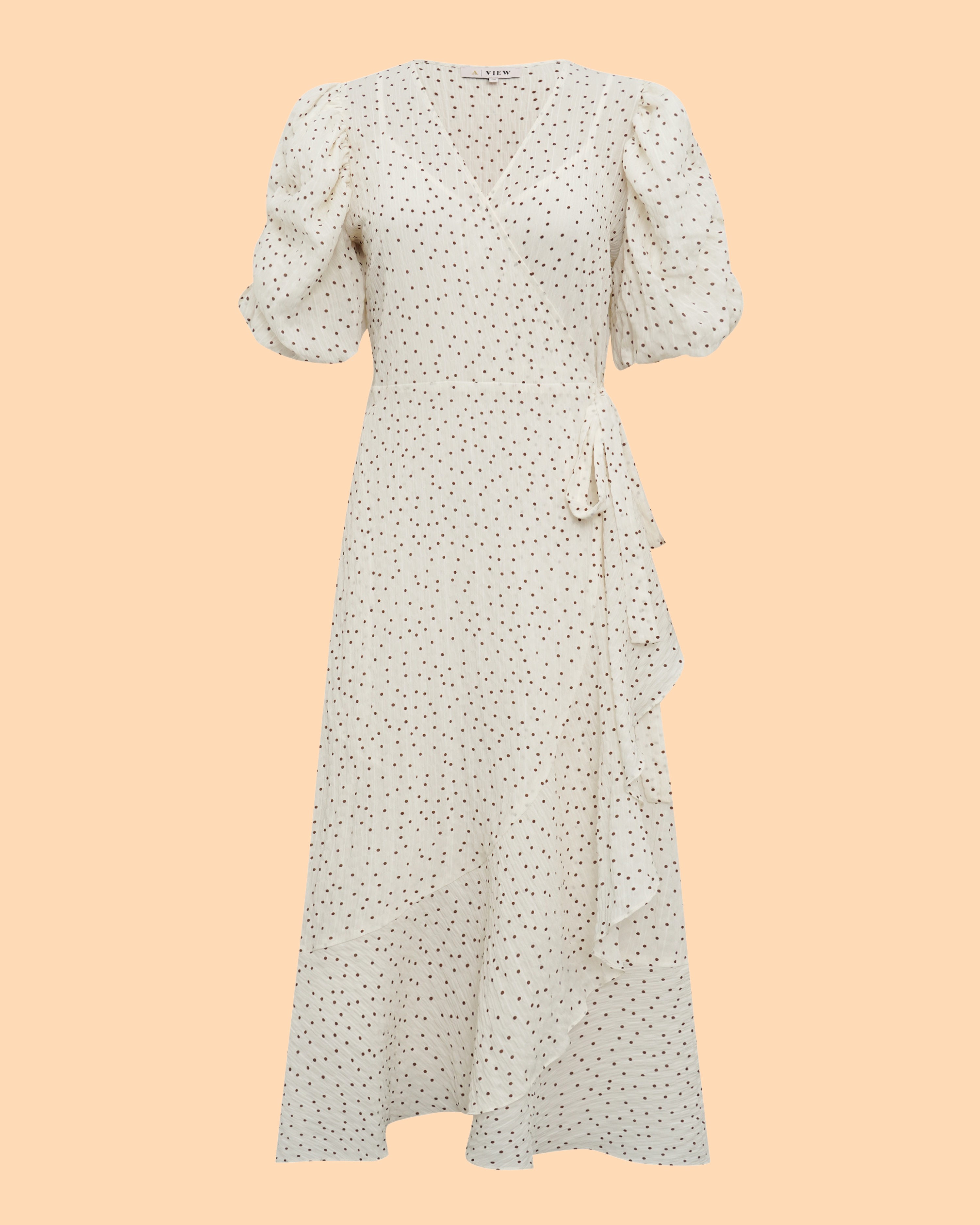 Das Sinda Dot Dress von A-View ist ein wadenlanges Wickelkleid mit feinem Punktmuster, das einen klassischen und femininen Look verleiht. Es hat kurze Puffärmel und eine locker fallende Silhouette. Der V-Ausschnitt und der schlichte Schnitt machen es vielseitig kombinierbar – sowohl im Alltag als auch bei sommerlichen Anlässen. Das Kleid kommt mit einem Unterkleid. Das Kleid fällt normal aus.