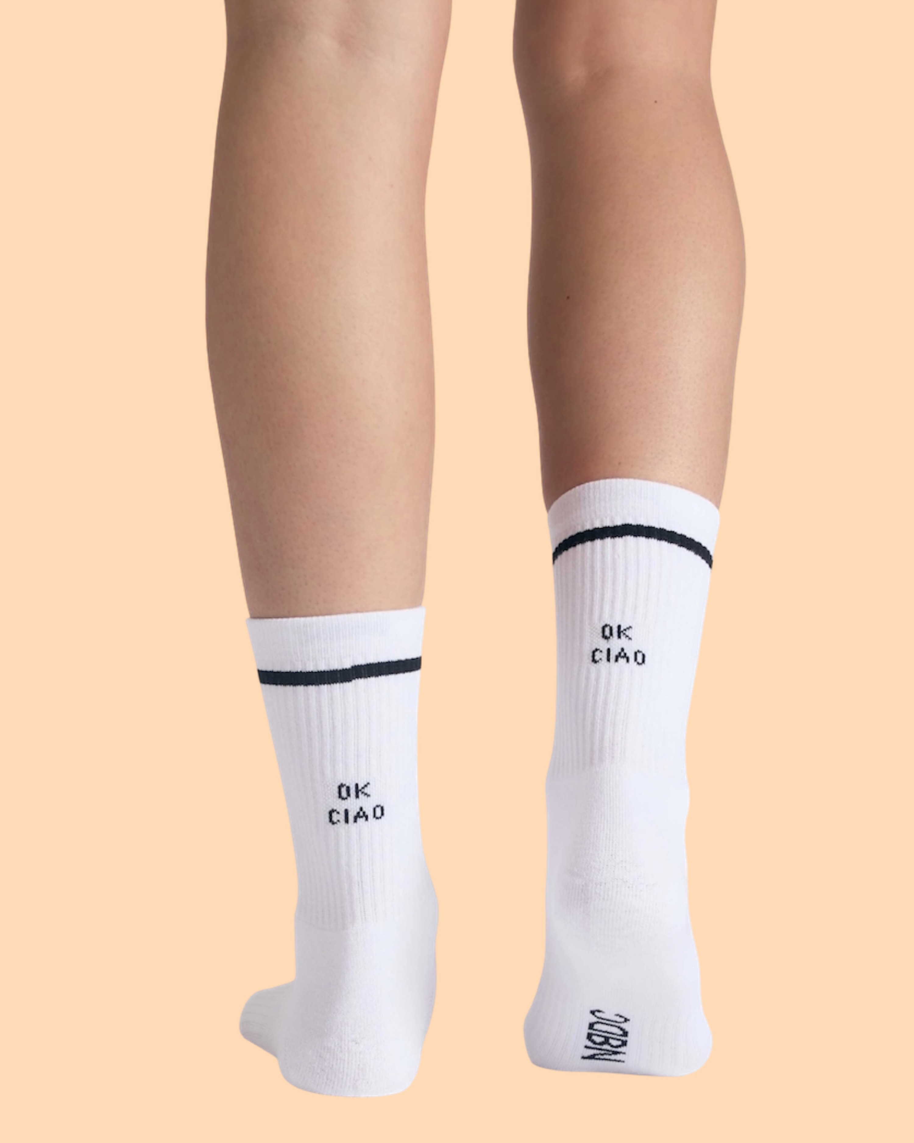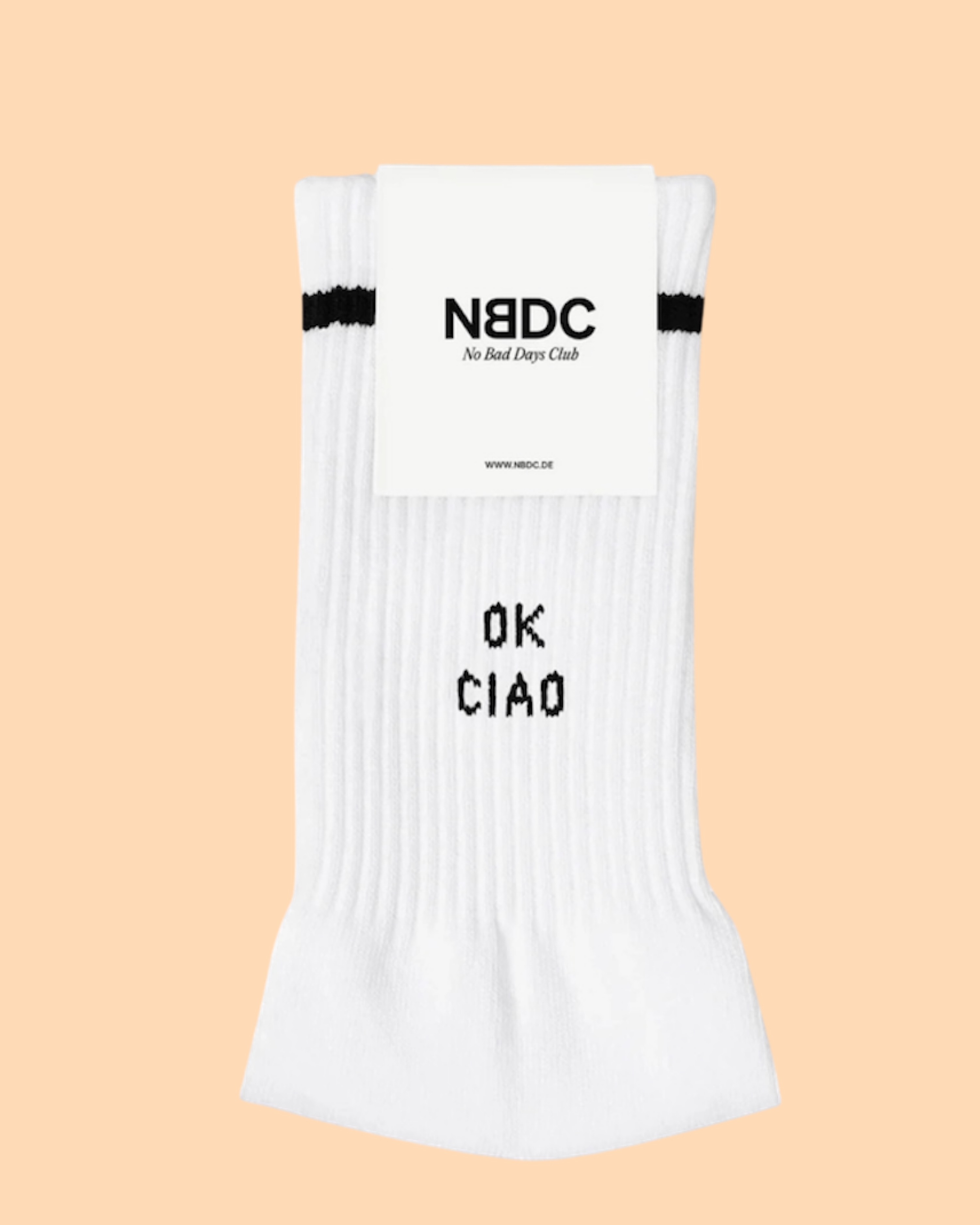 Die Socken Ok Ciao von No Bad Days Club sind ein cooles Statement! Schwarze Message auf weißen Socken, mit Retro-Streifen. Sie werden faire in Portugal hergestellt, sind aus weicher Baumwolle, haben eine verstärkte Sohle und keine störenden Nähte.
