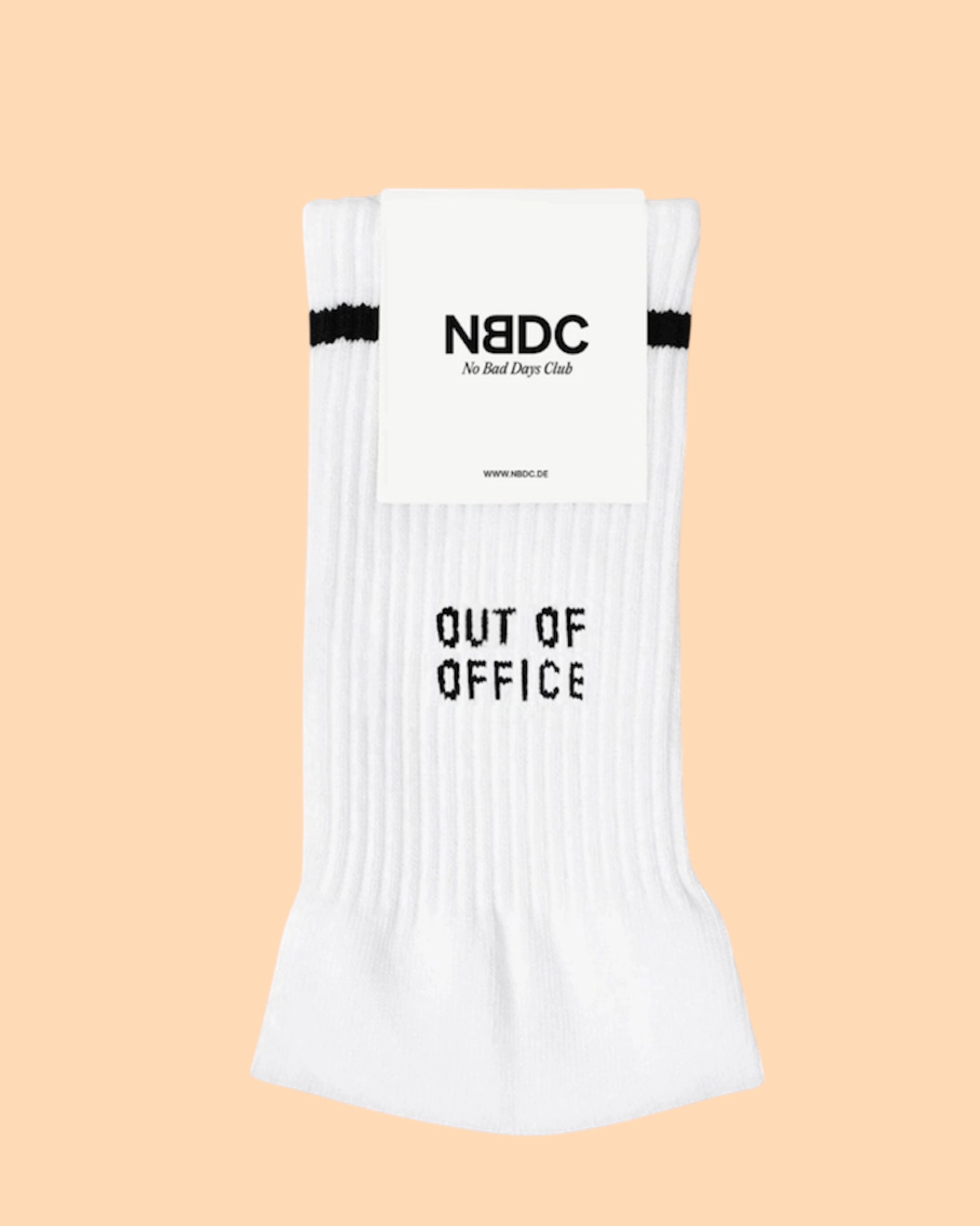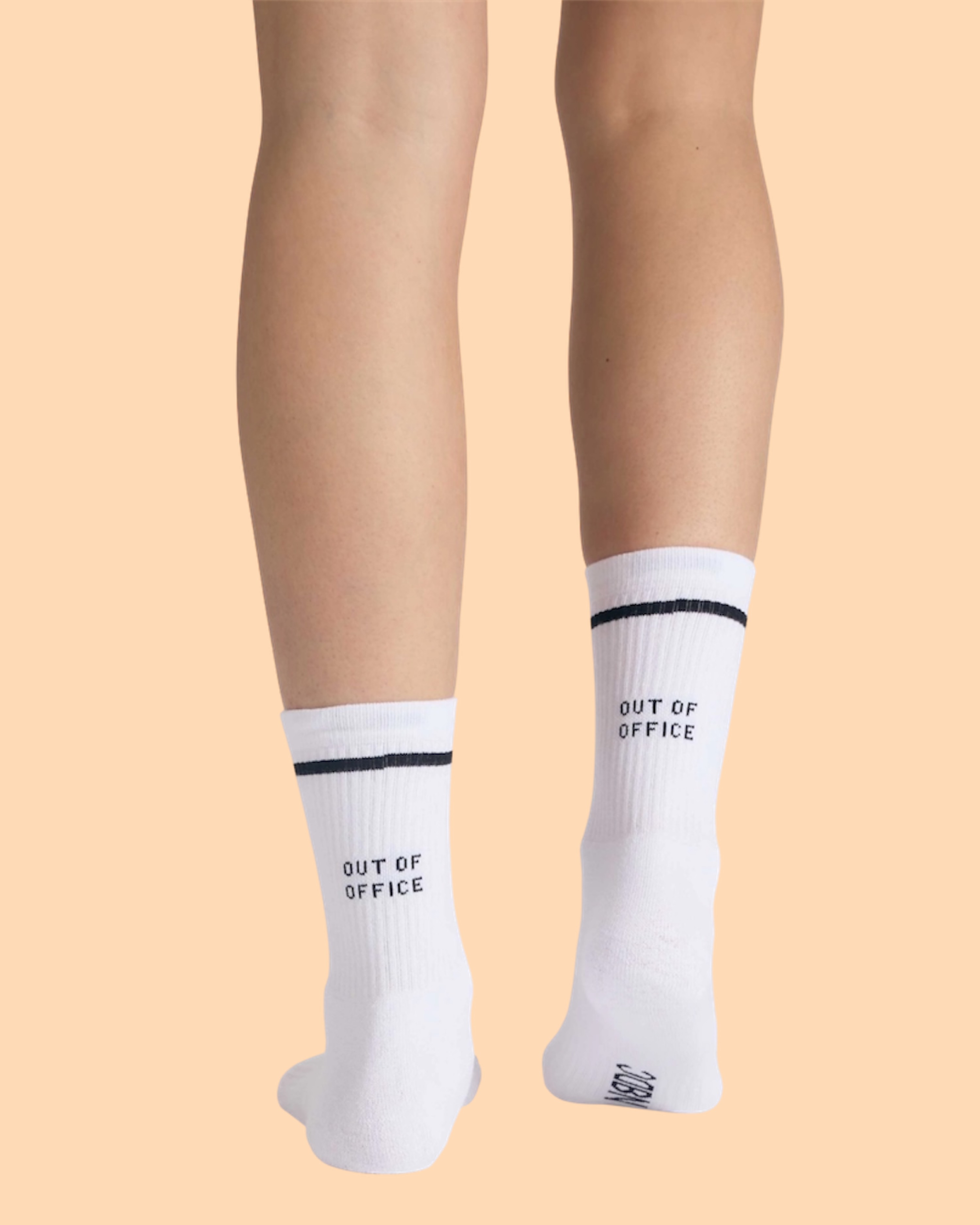 Die Socken Out Of Office von No Bad Days Club sind ein cooles Statement! Schwarze Message auf weißen Socken, mit Retro-Streifen. Sie werden faire in Portugal hergestellt, sind aus weicher Baumwolle, haben eine verstärkte Sohle und keine störenden Nähte.