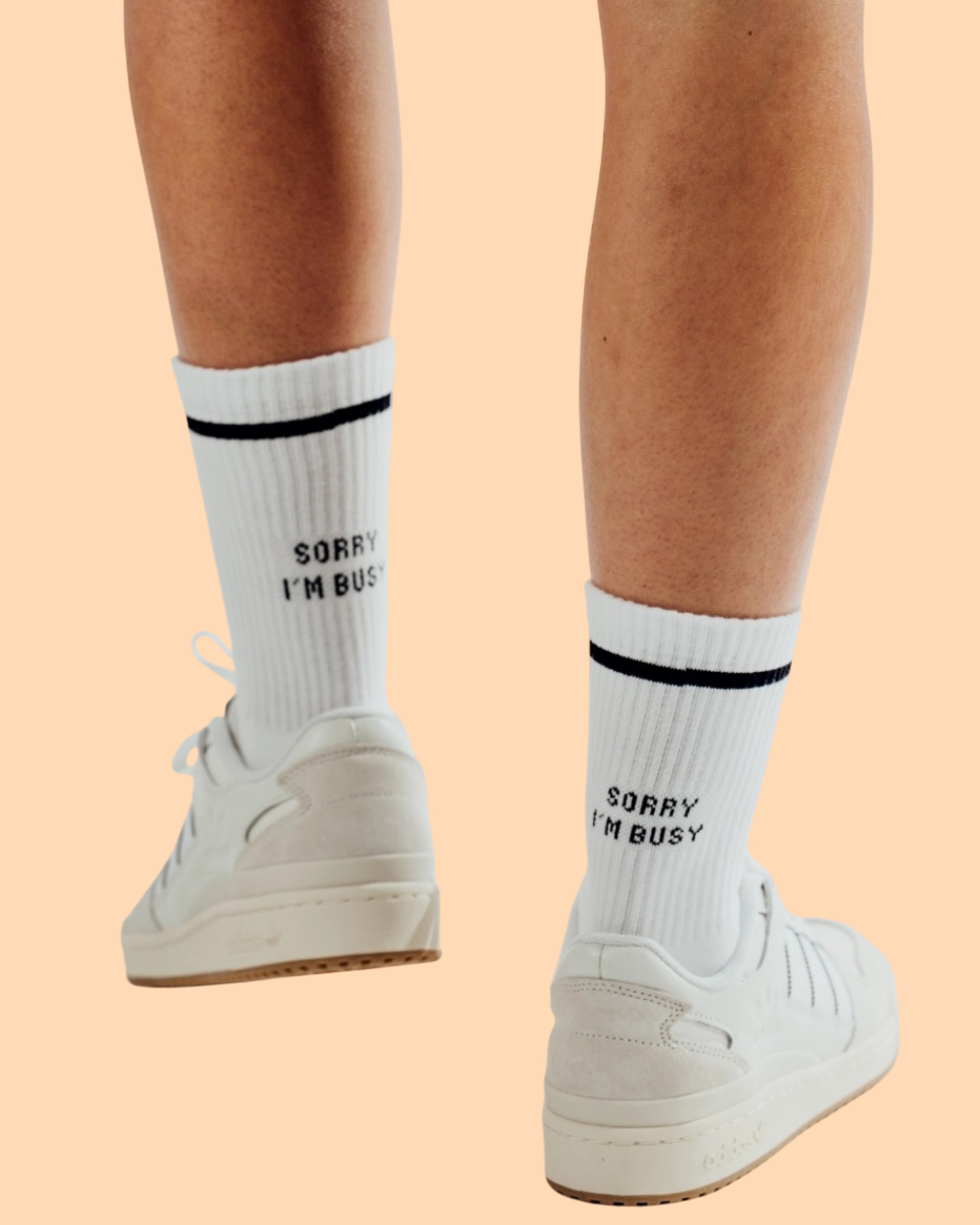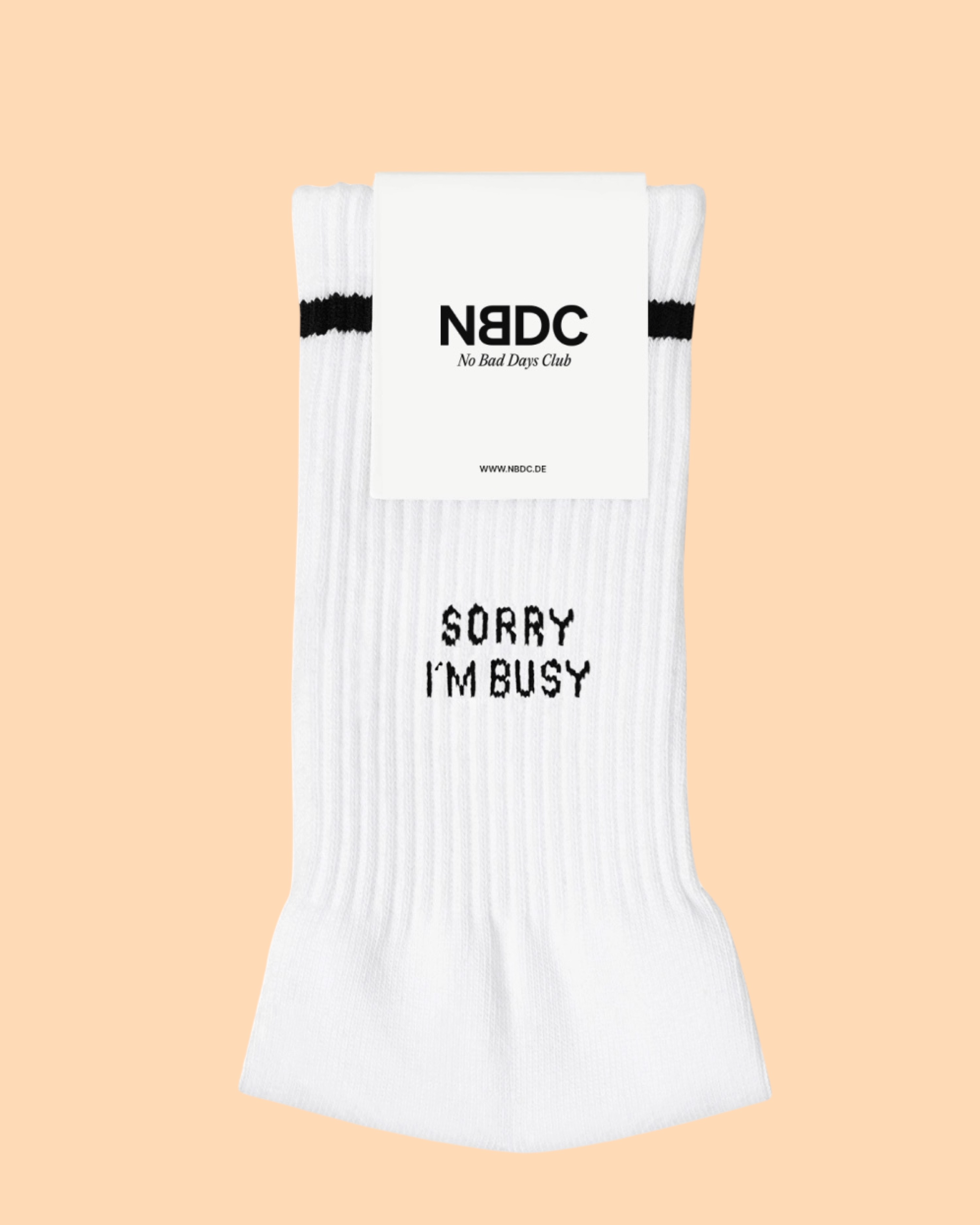 Die Socken Sorry I´m Busy von No Bad Days Club sind ein cooles Statement! Schwarze Message auf weißen Socken, mit Retro-Streifen. Sie werden faire in Portugal hergestellt, sind aus weicher Baumwolle, haben eine verstärkte Sohle und keine störenden Nähte.