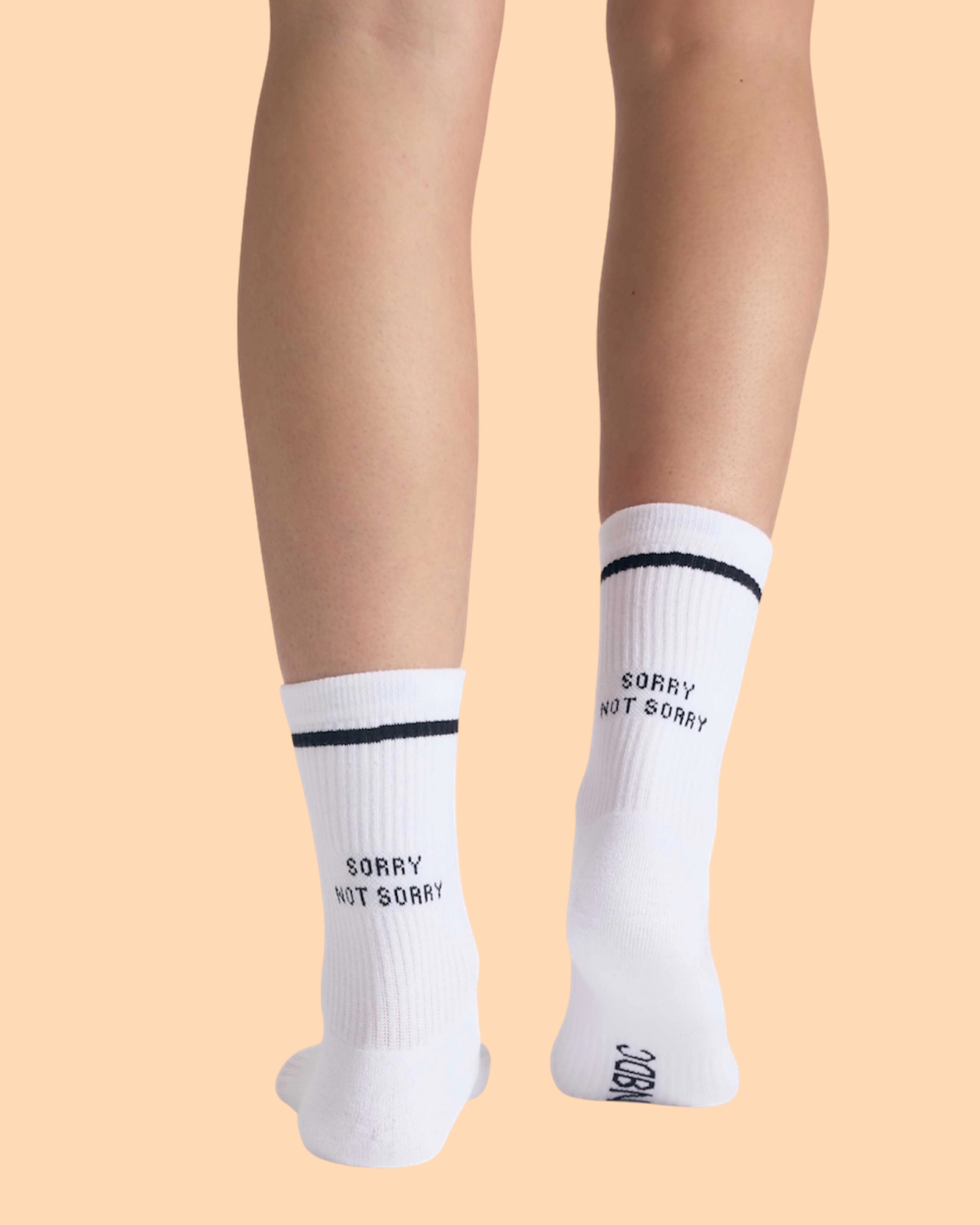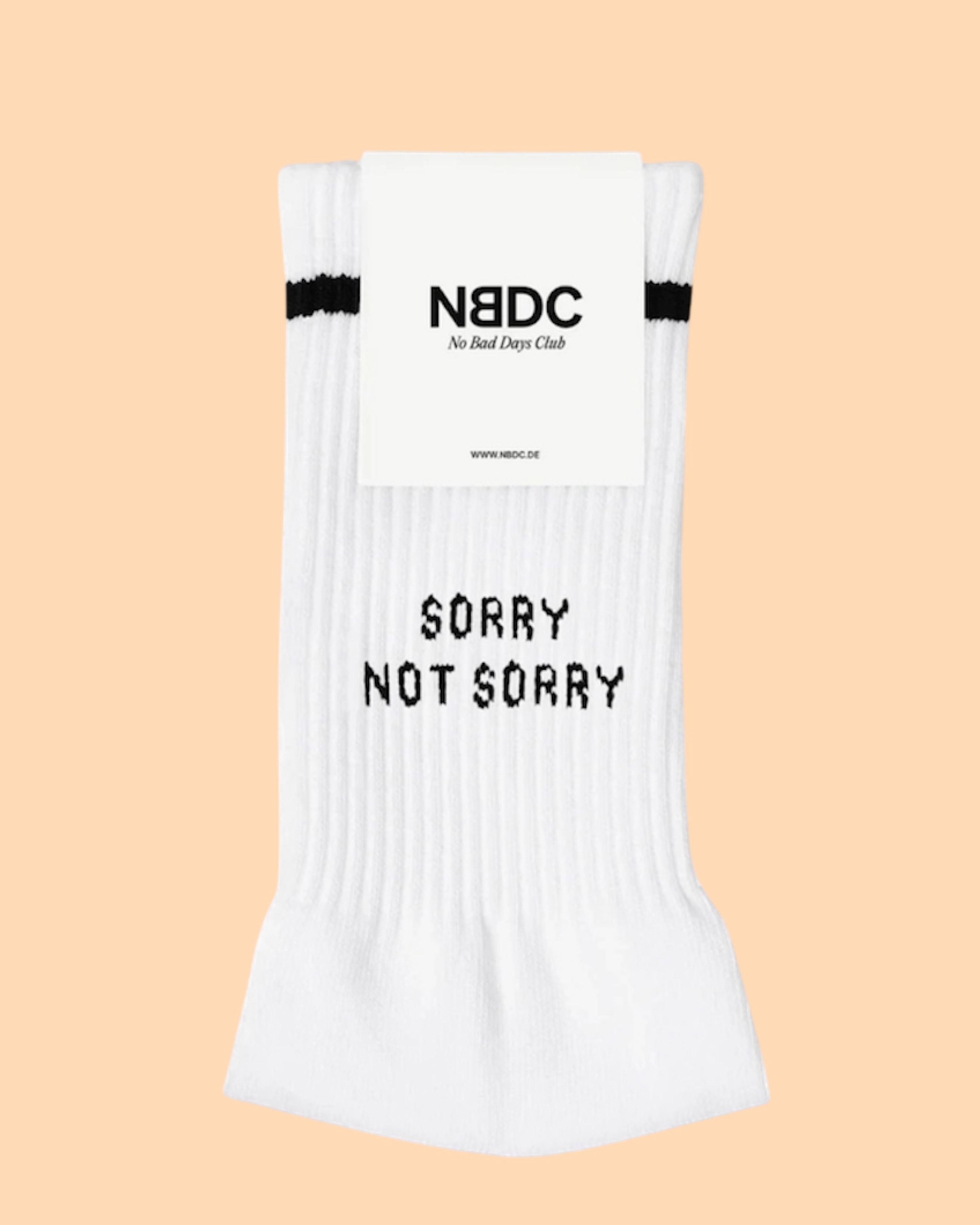 Die Socken Sorry Not Sorry von No Bad Days Club sind ein cooles Statement! Schwarze Message auf weißen Socken, mit Retro-Streifen. Sie werden faire in Portugal hergestellt, sind aus weicher Baumwolle, haben eine verstärkte Sohle und keine störenden Nähte.