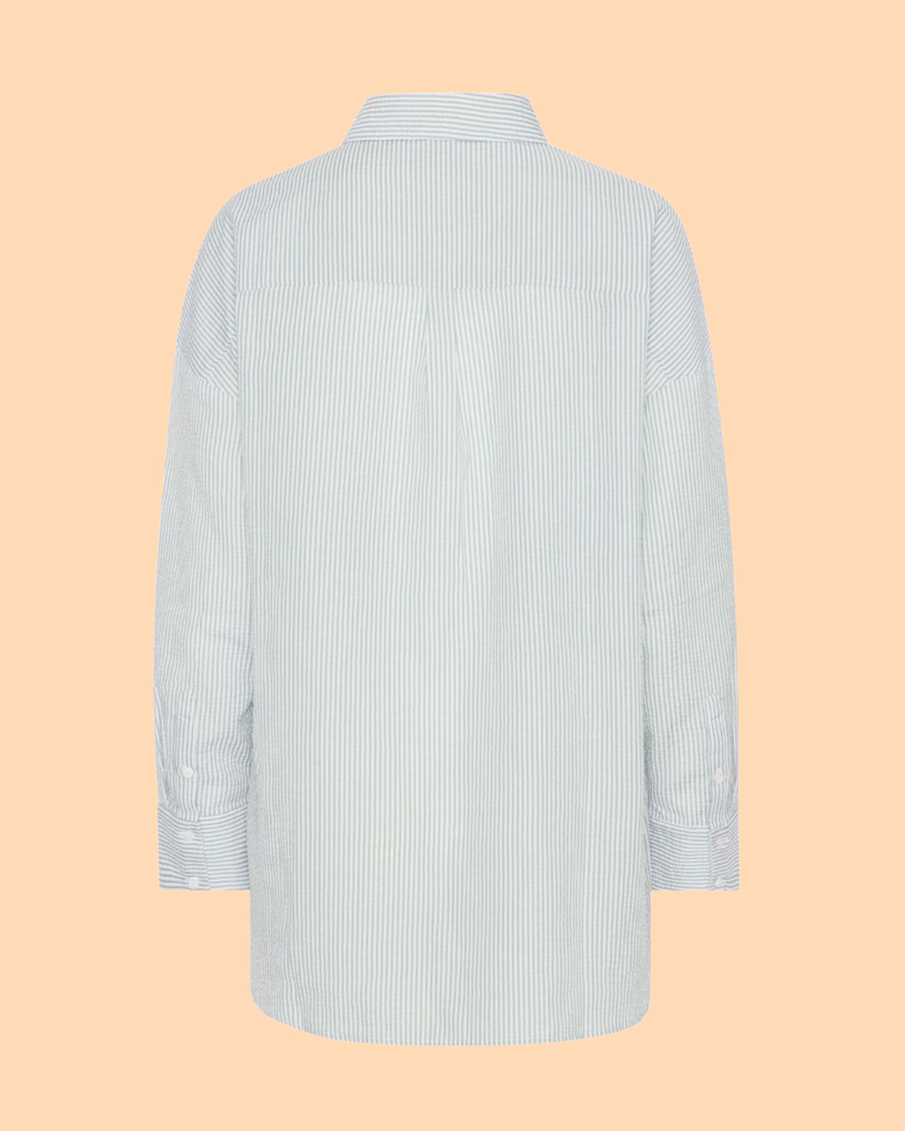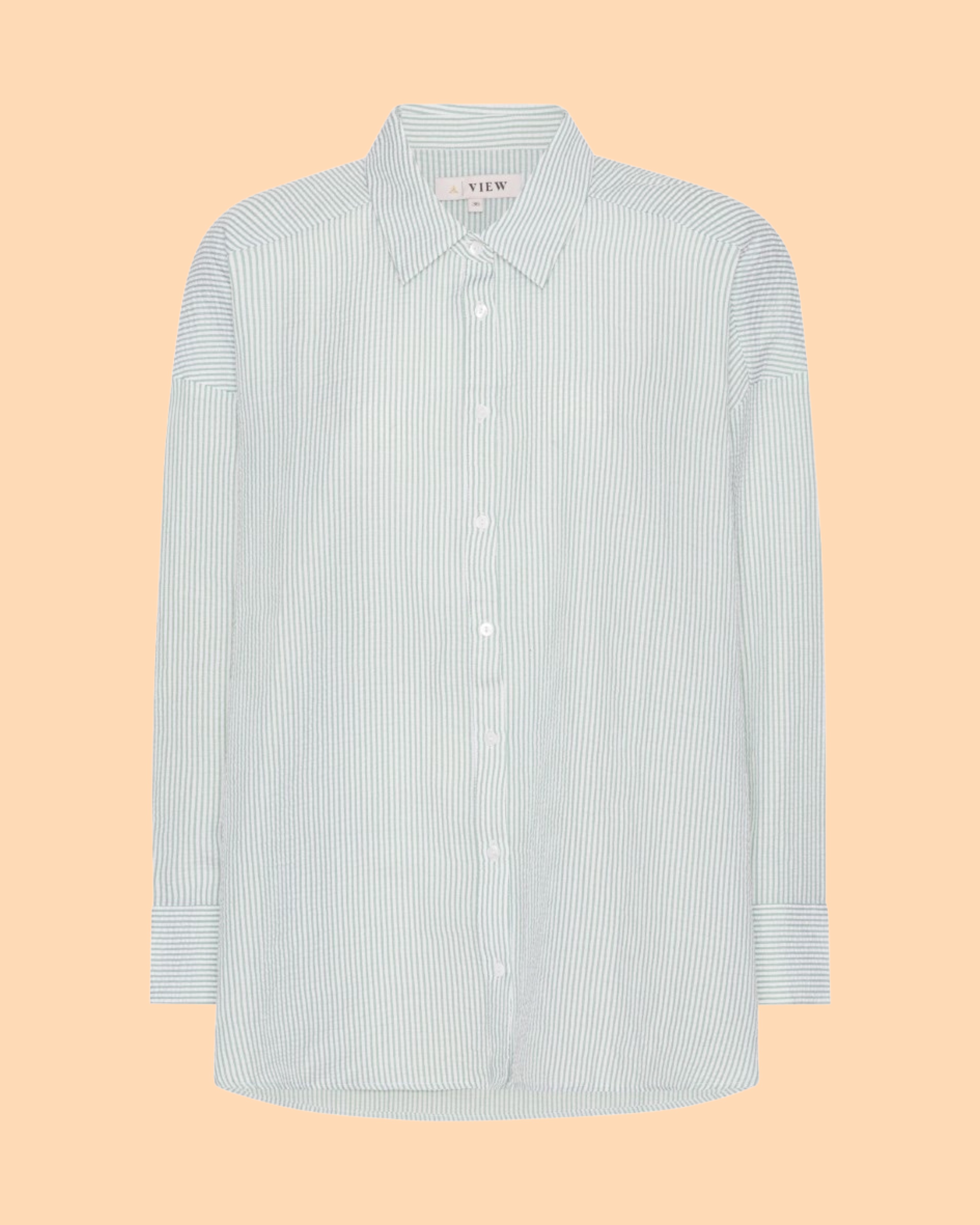Das Sonja Shirt White/Green von A-View ist ein langes, übergroßes Hemd aus hochwertigem Seersucker. Es hat tiefe Schulternähte und doppelte Manschetten mit zwei kleinen Knöpfen. Das Hemd wird vorne mit kleinen Knöpfen geschlossen. Es ist oversized geschnitten.