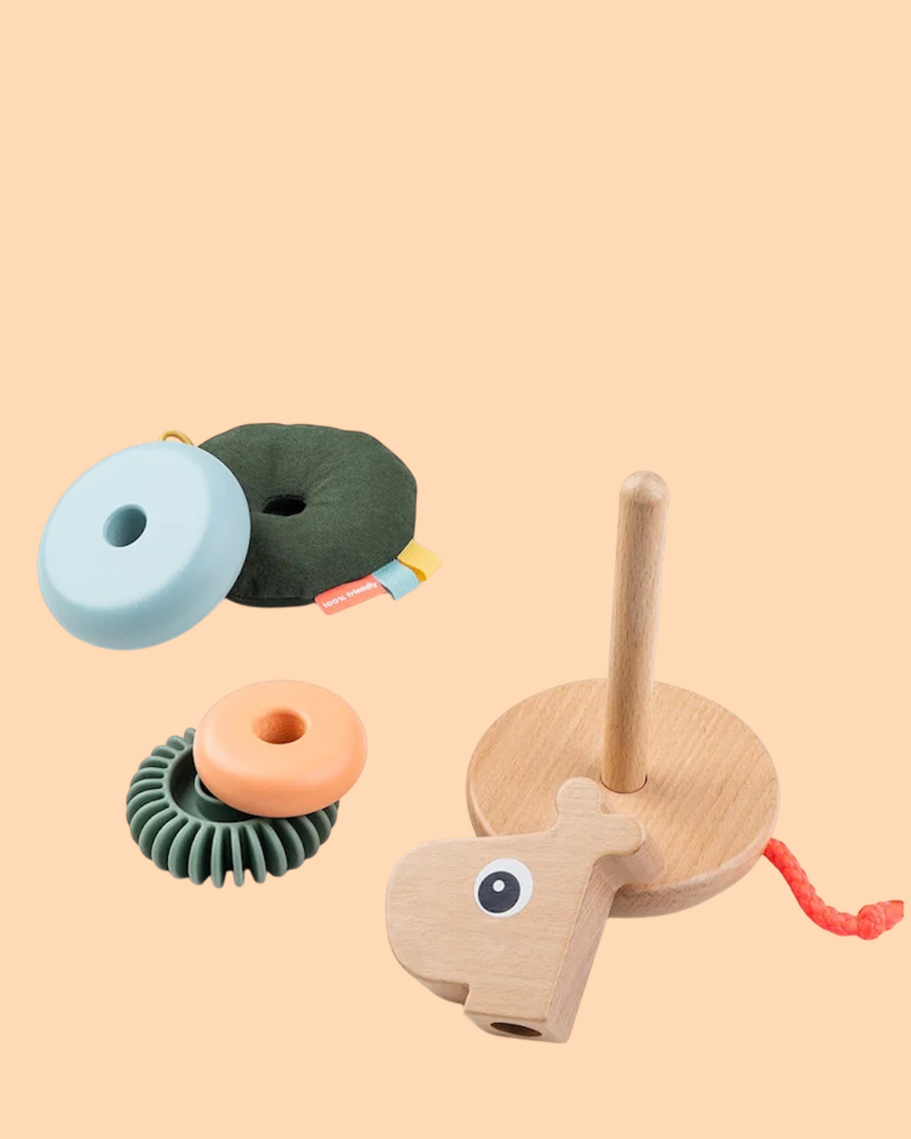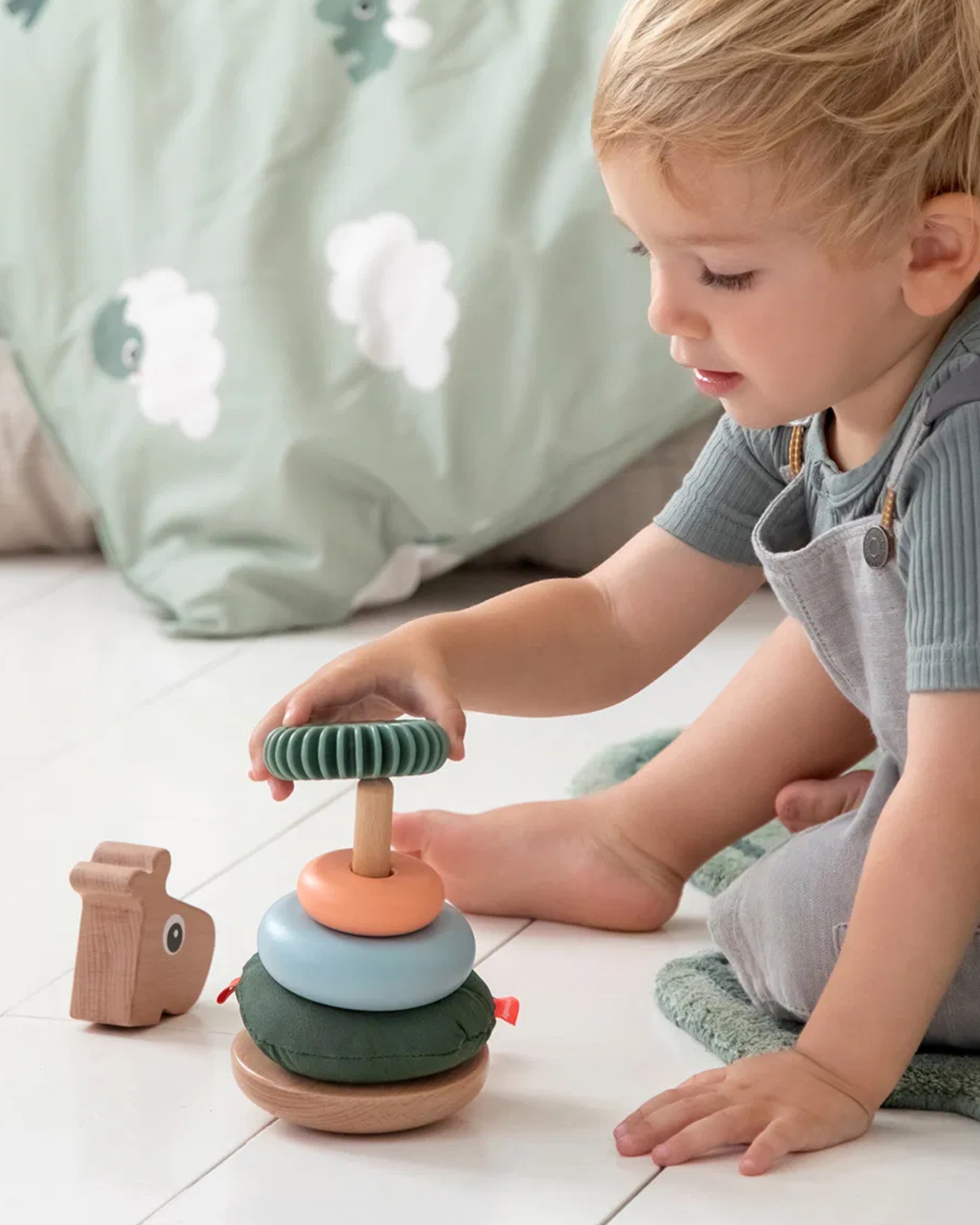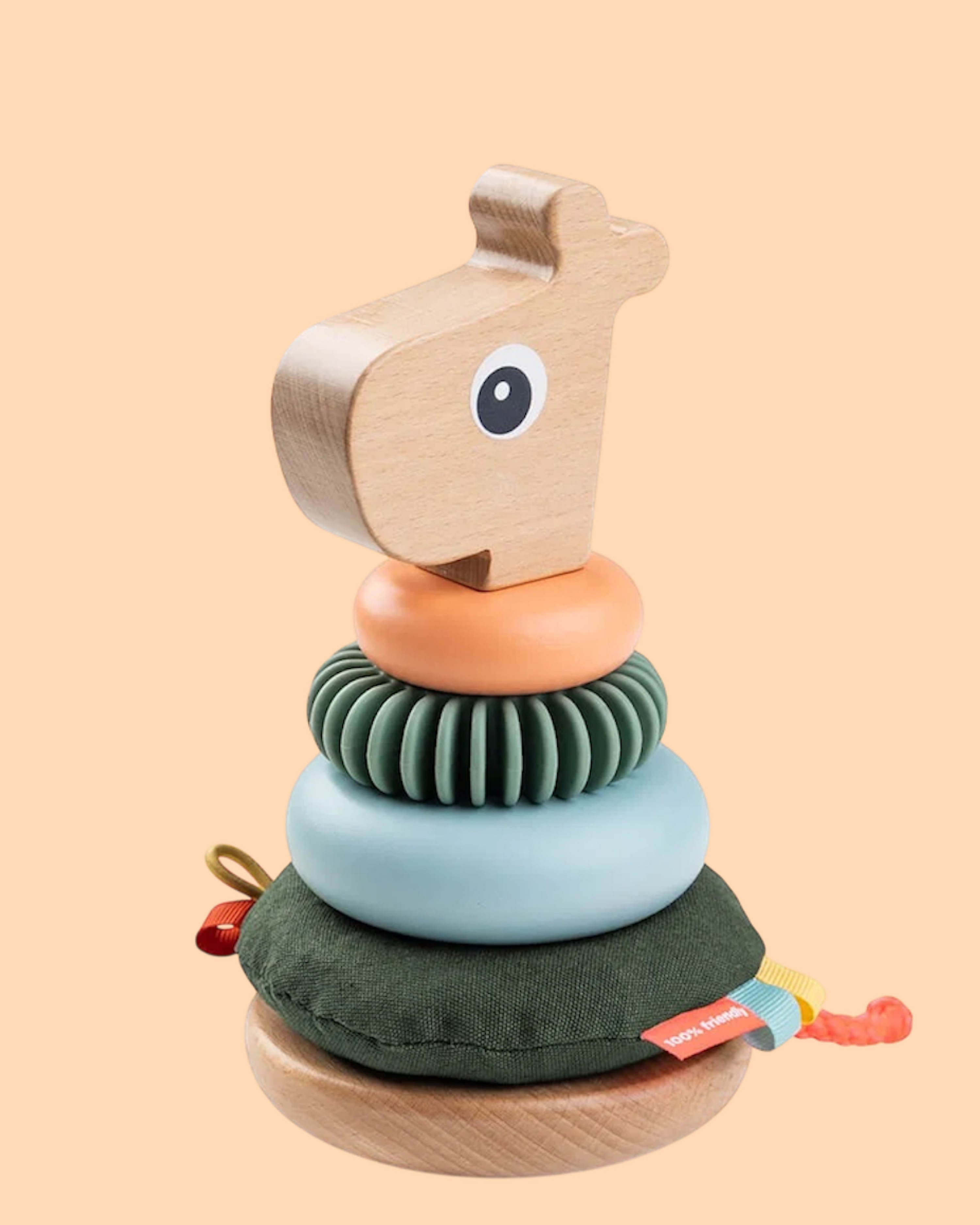 Der Stacking Tower Raffi von Done by Deer hat vier Ringe, mit vielen sensorischen Oberflächen, die dein Lütten stapeln kann. Er wird aus verantwortungsvoll gewonnenem Holz und wasserbasierter Farbe hergestellt.