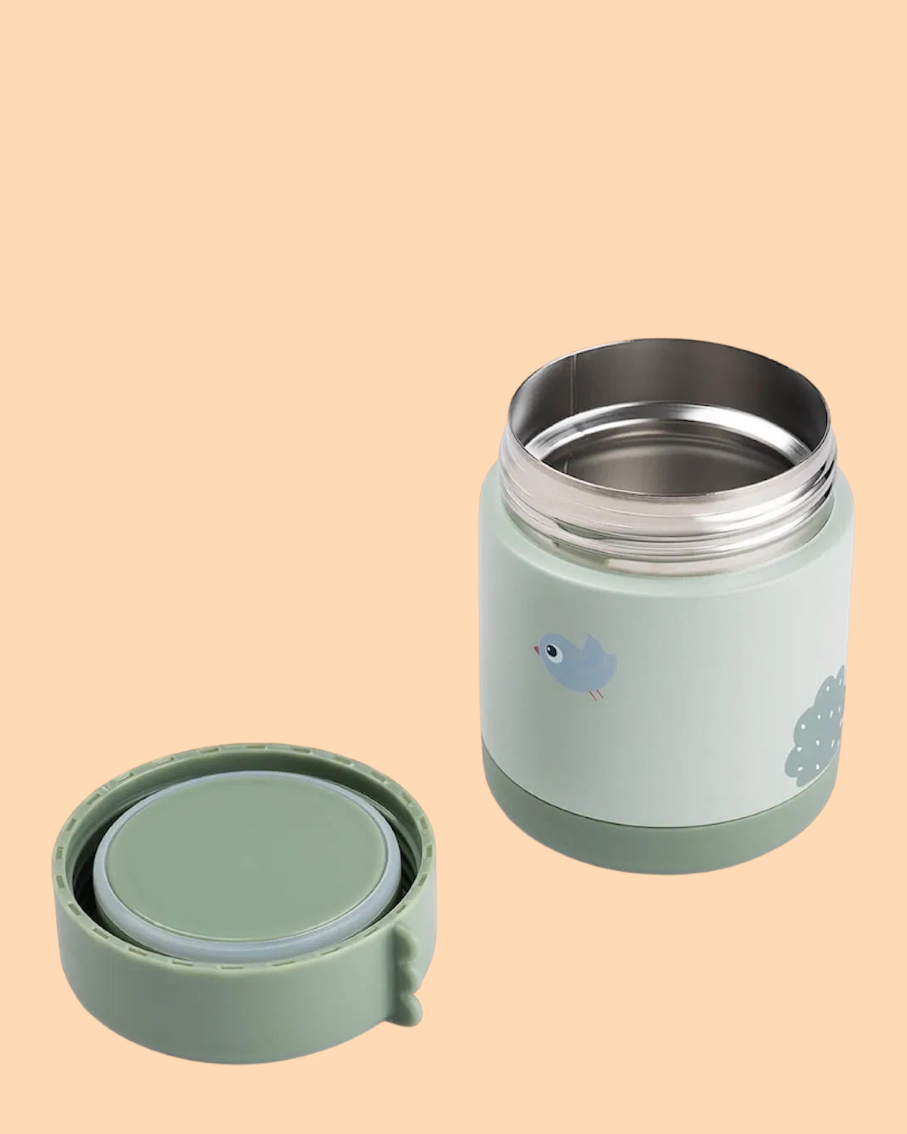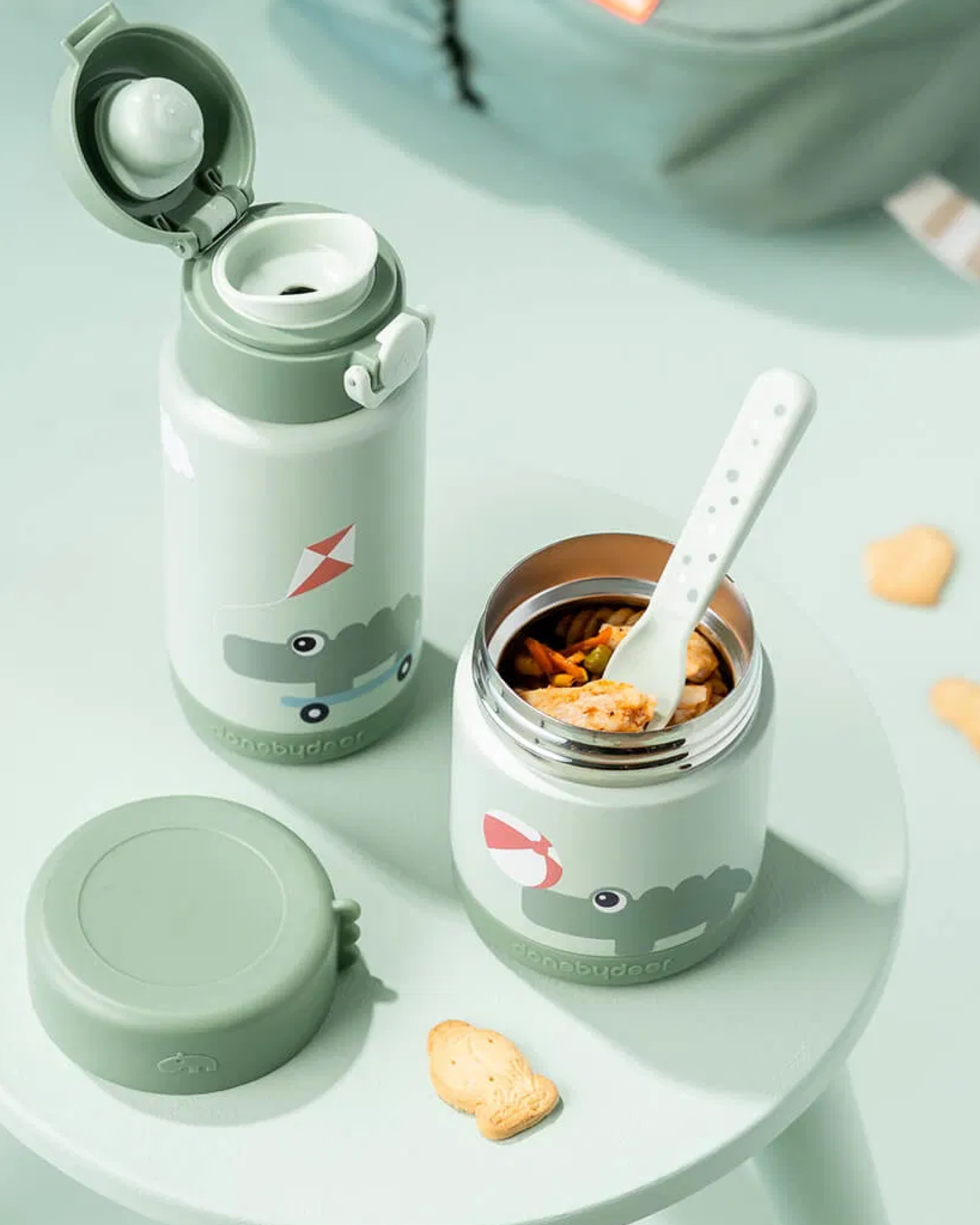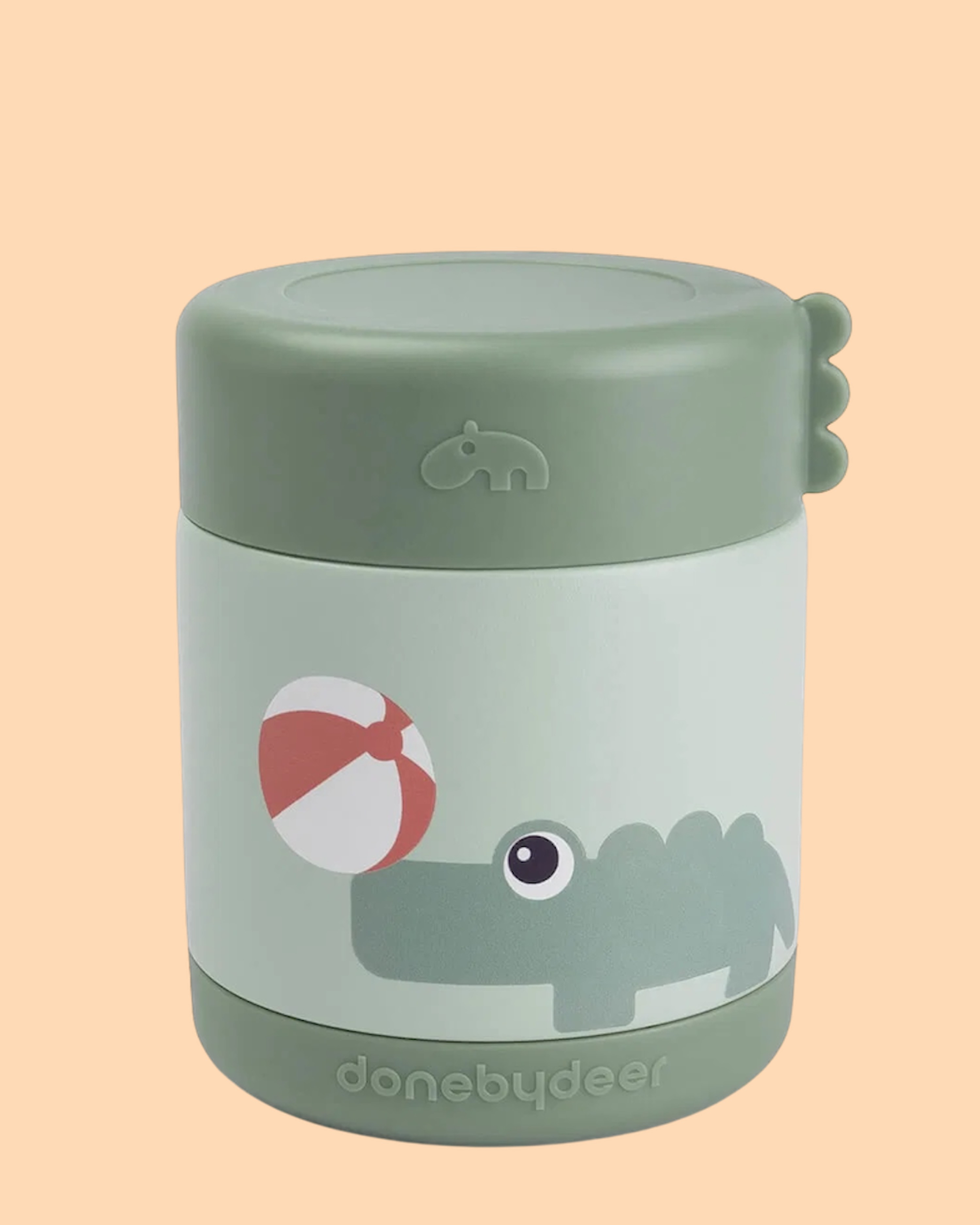 Der Thermo-Essensbehälter Playground Green von Done by Deer, mit den süßen Motiven von Croco und Birdee, hält Speisen bis zu 6 Stunden warm oder kalt und ein Fassungsvermögen von 300ml. Perfekt für den Kindergarten, die Schule und Ausflüge.