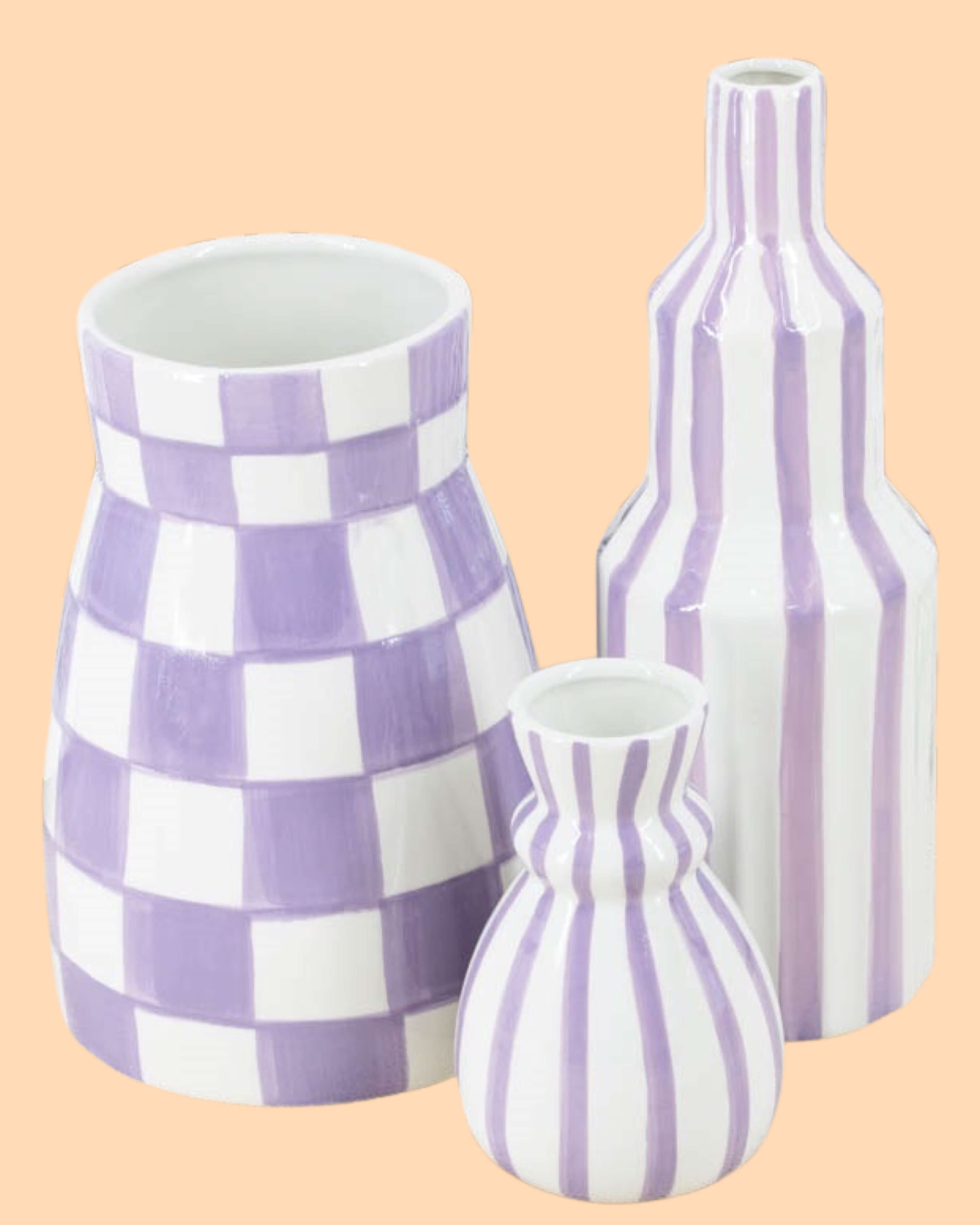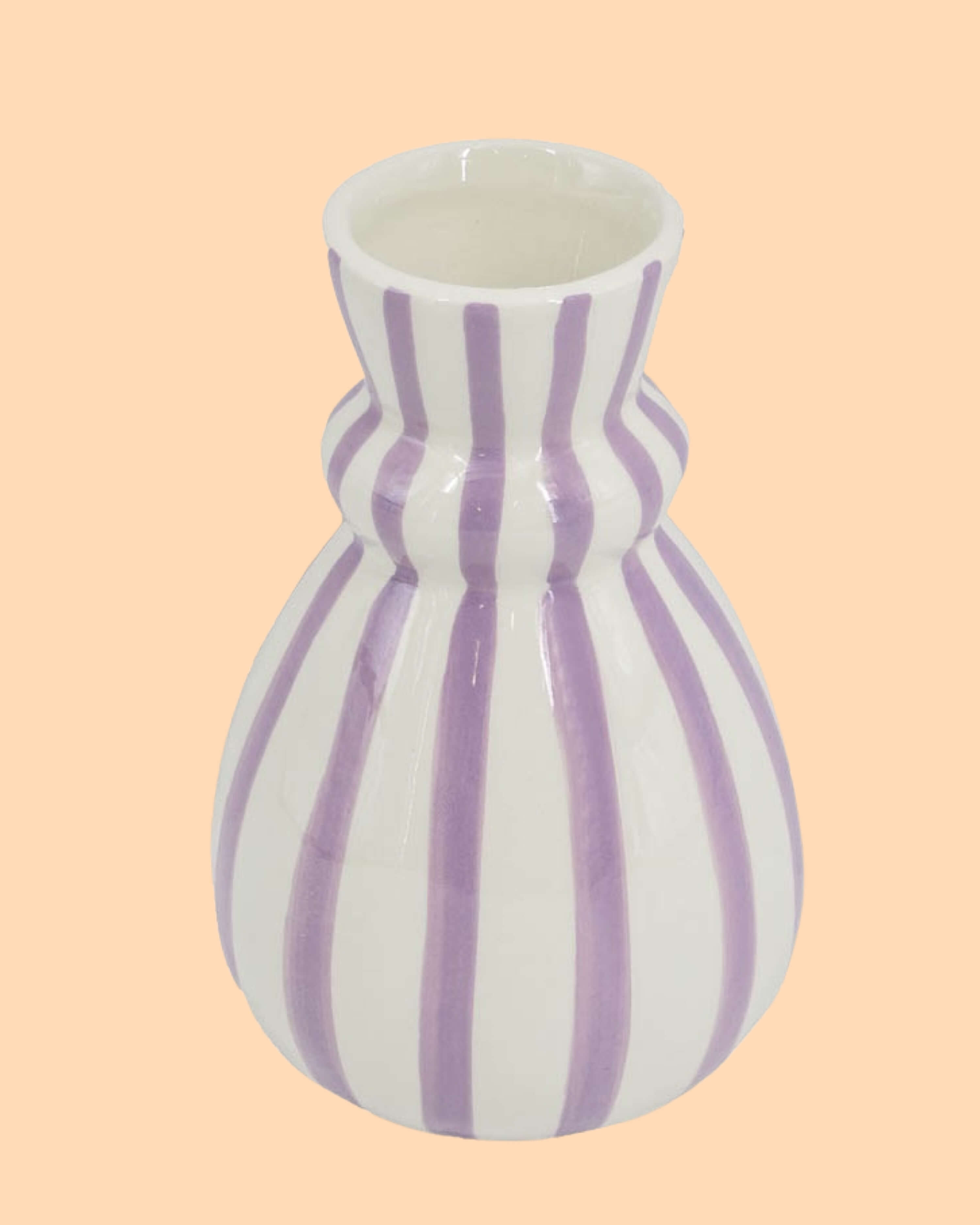 Diese Vase im zeitlosen Streifen Design ist ein absoluter Hingucker in deinem Zuhause. Besonders schön in Kombi mit anderen Vasen in verschiedenen Höhen und anderen Mustern.