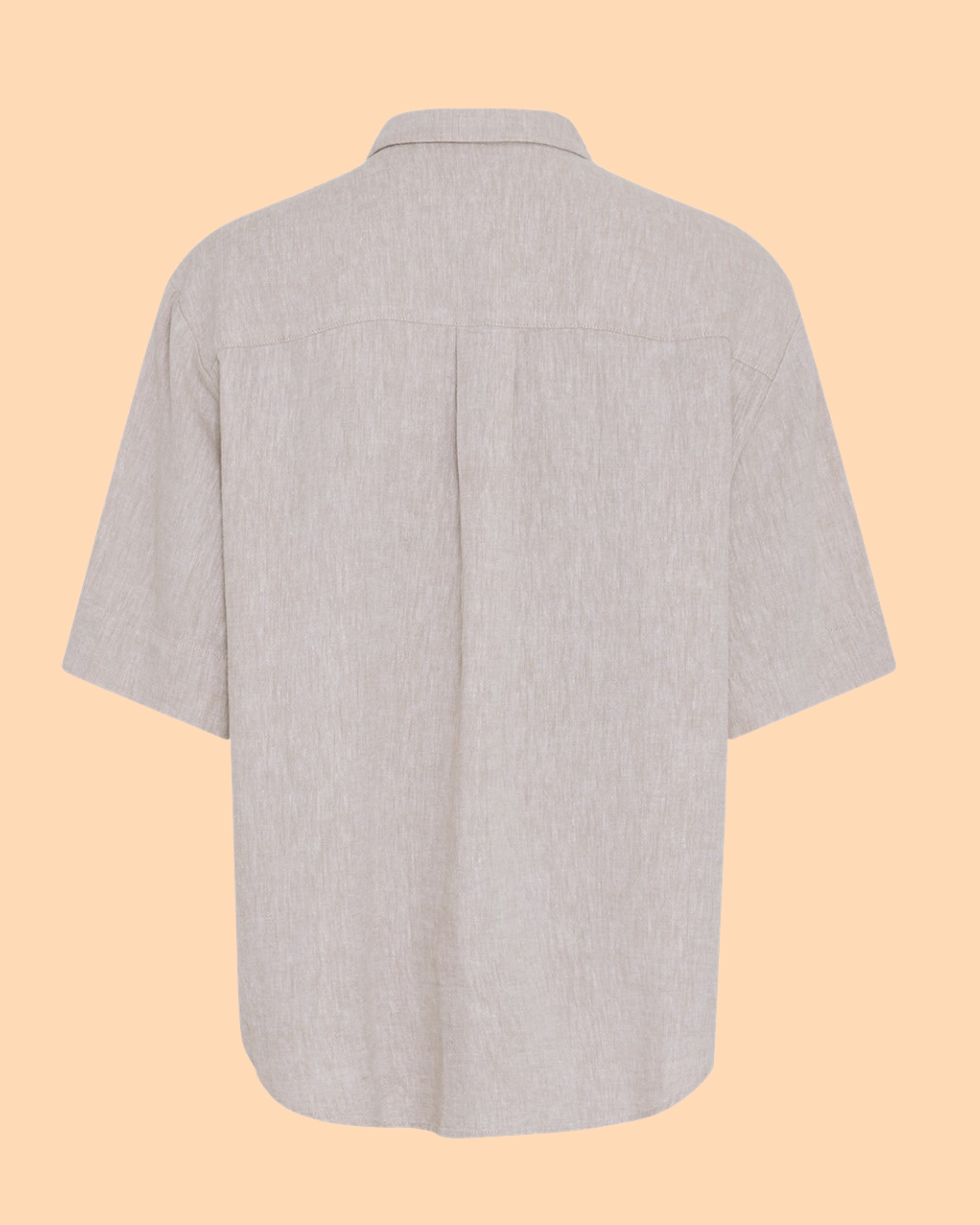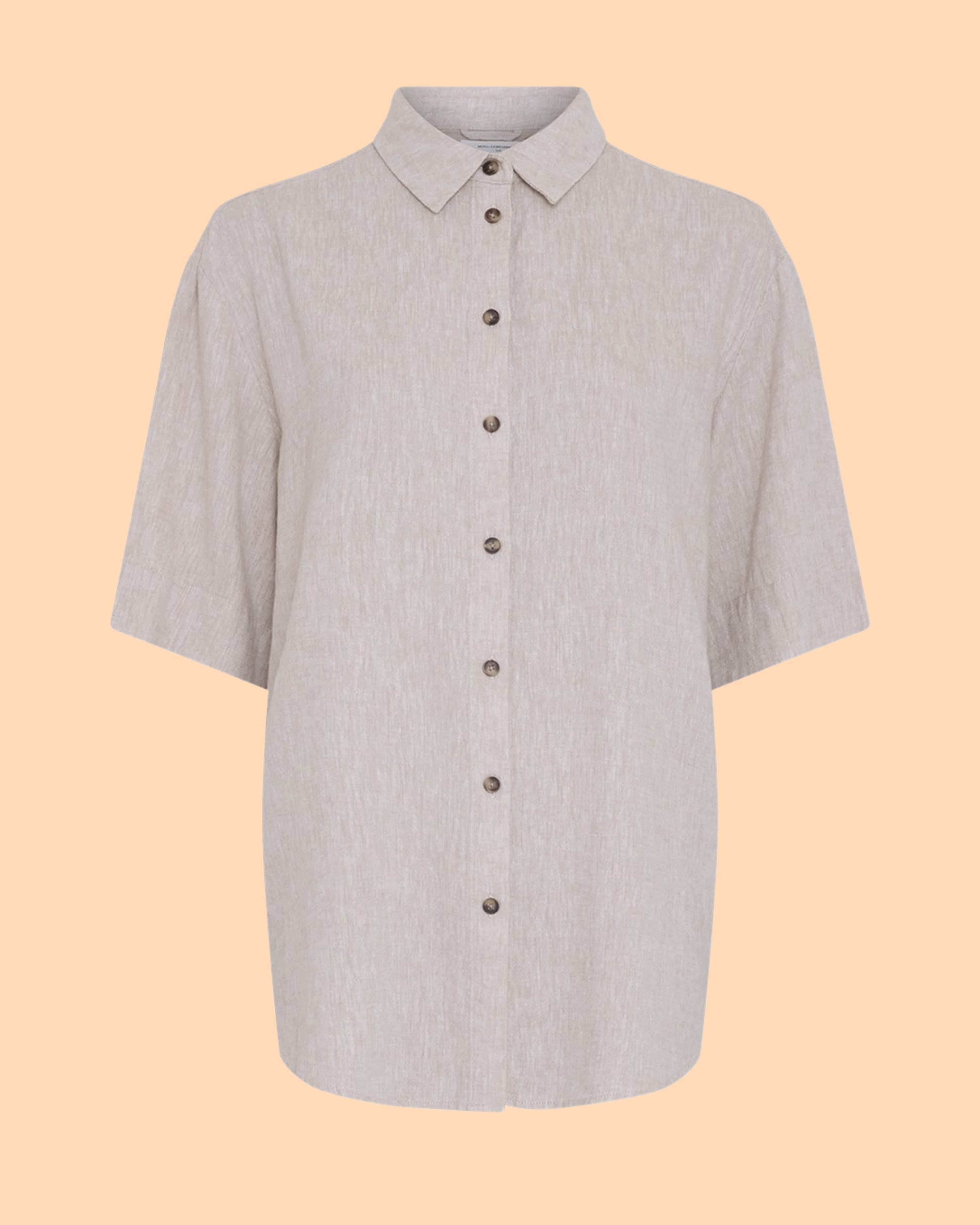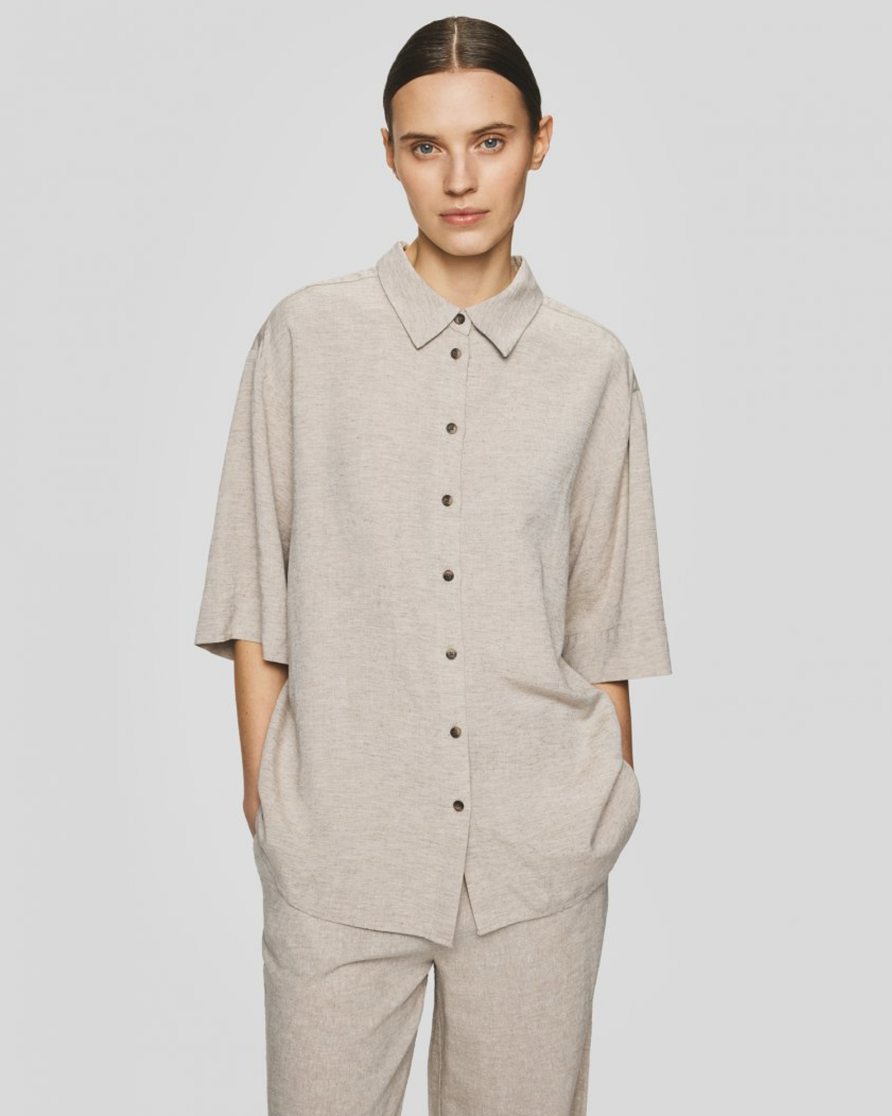 Das Viana Ginia 3/4 Shirt Sand Melange von MSCH COPENHAGEN ist ein lang geschnittenes Hemd aus Leinenmischung mit durchgehender Knopfleiste, klassischem Kragen, 3/4-Ärmeln und einer geraden Silhouette.