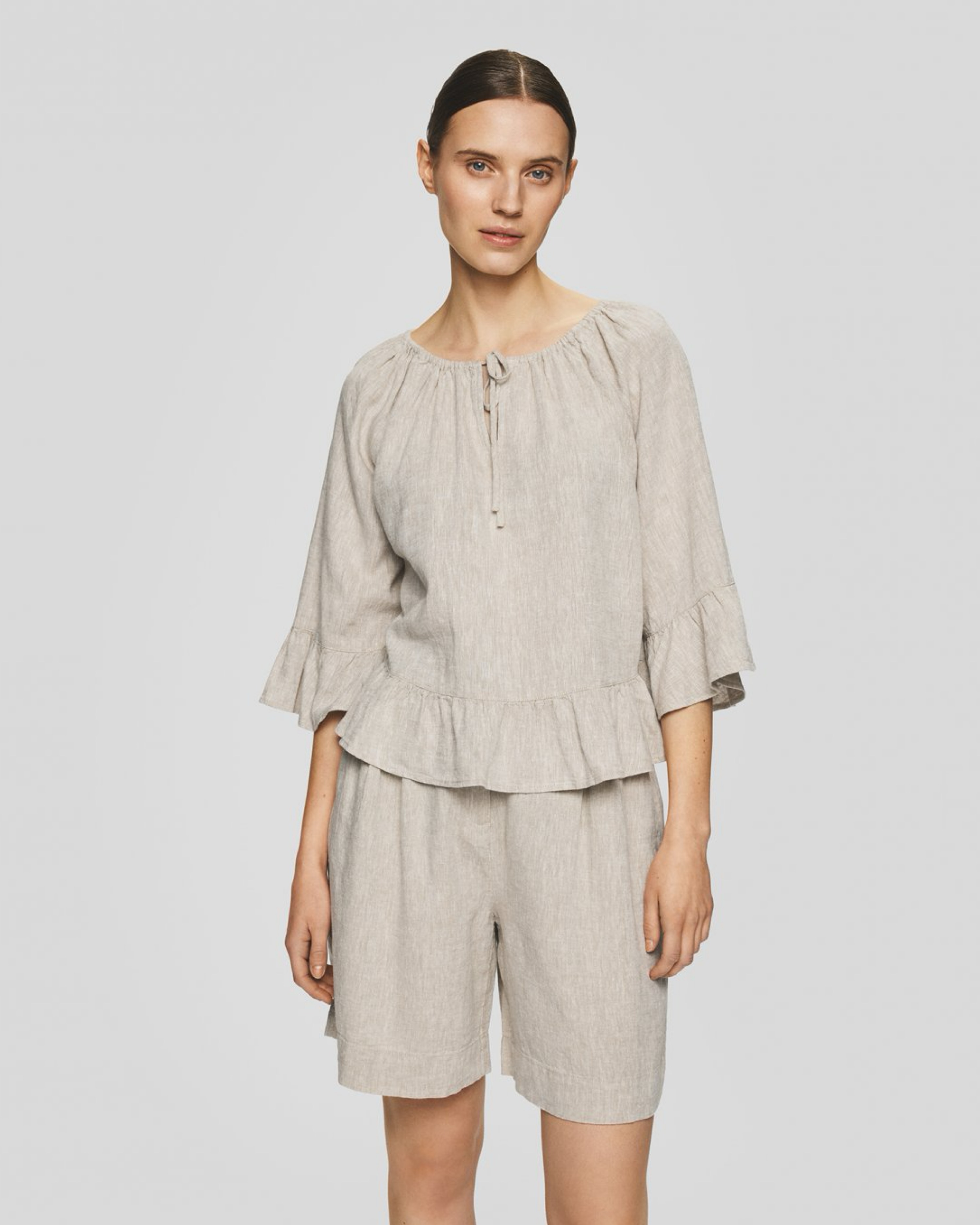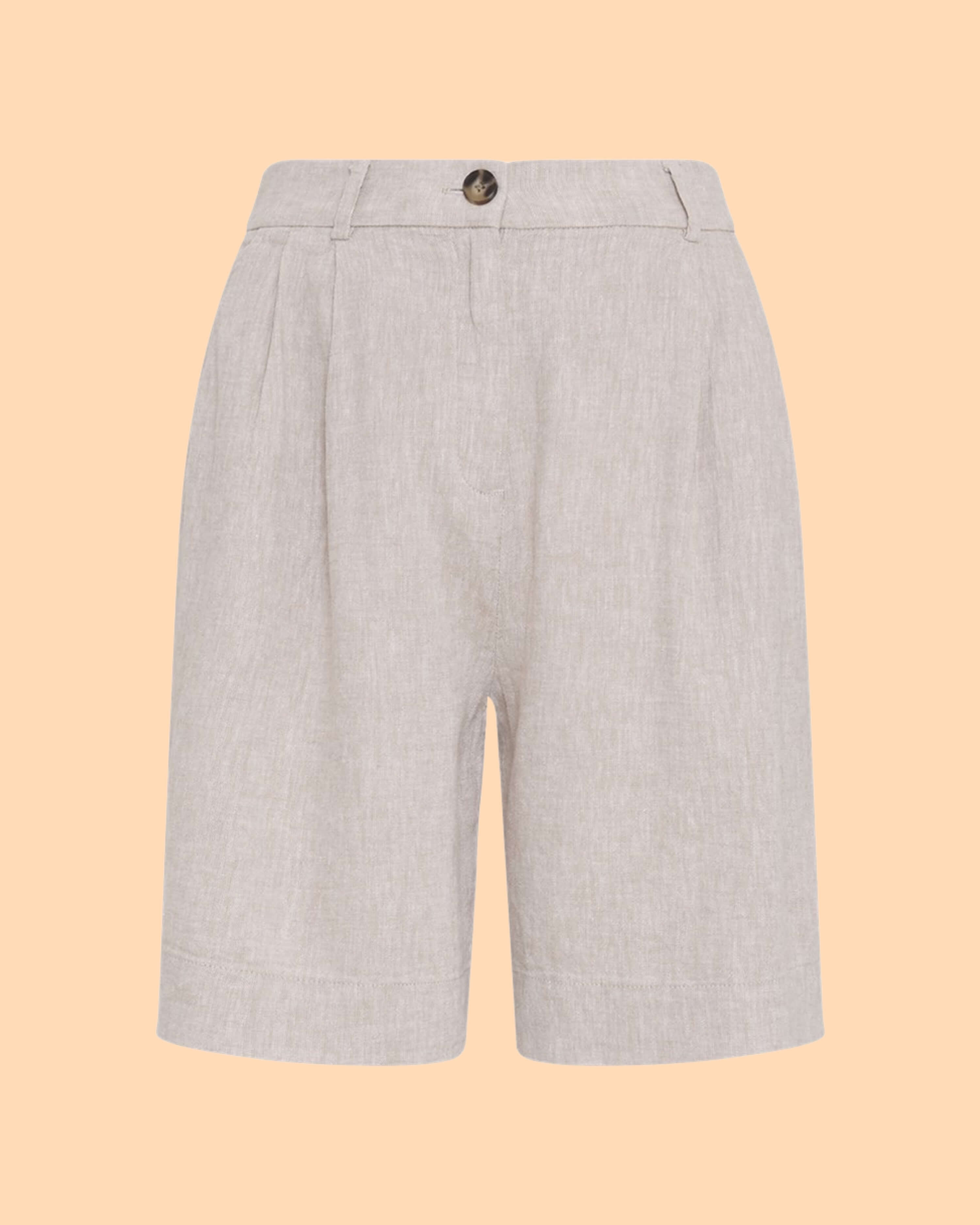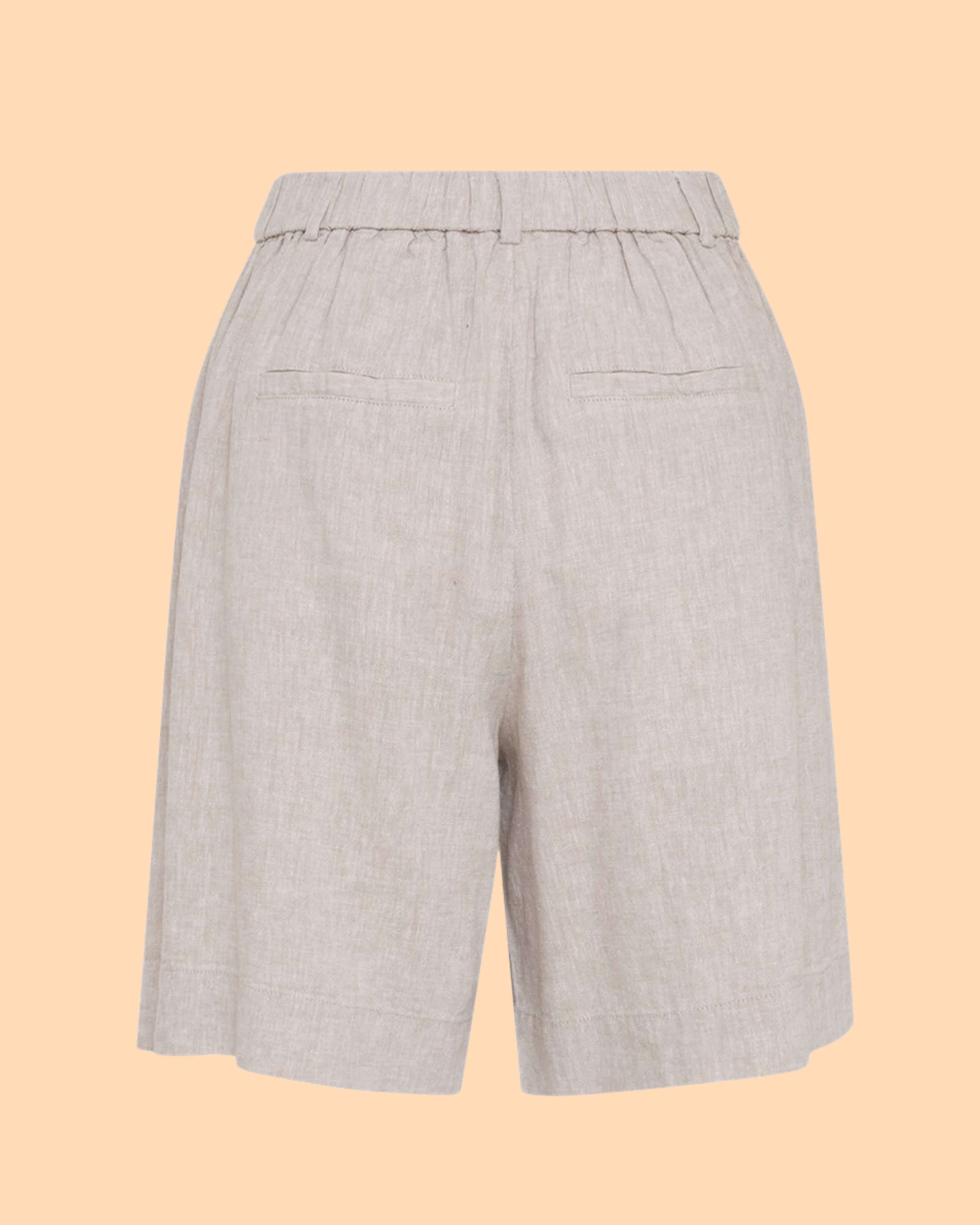 Die Viana Ginia Shorts Sand Melange von MSCH COPENHAGEN ist eine lockere Shorts aus Leinenmischung mit Knopf- und Reißverschluss, elastischem Bund im Rücken und Ziertaschen auf der Rückseite.