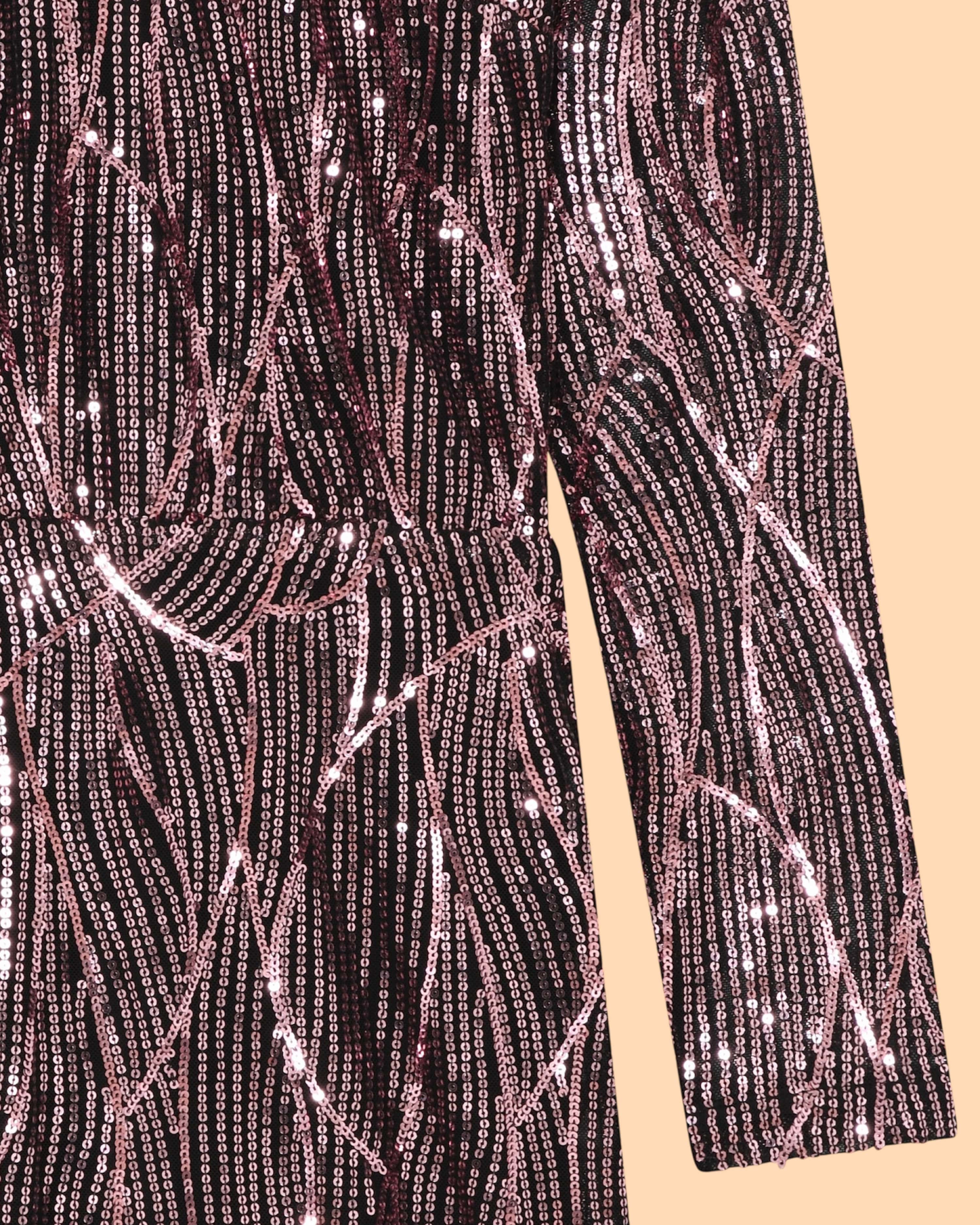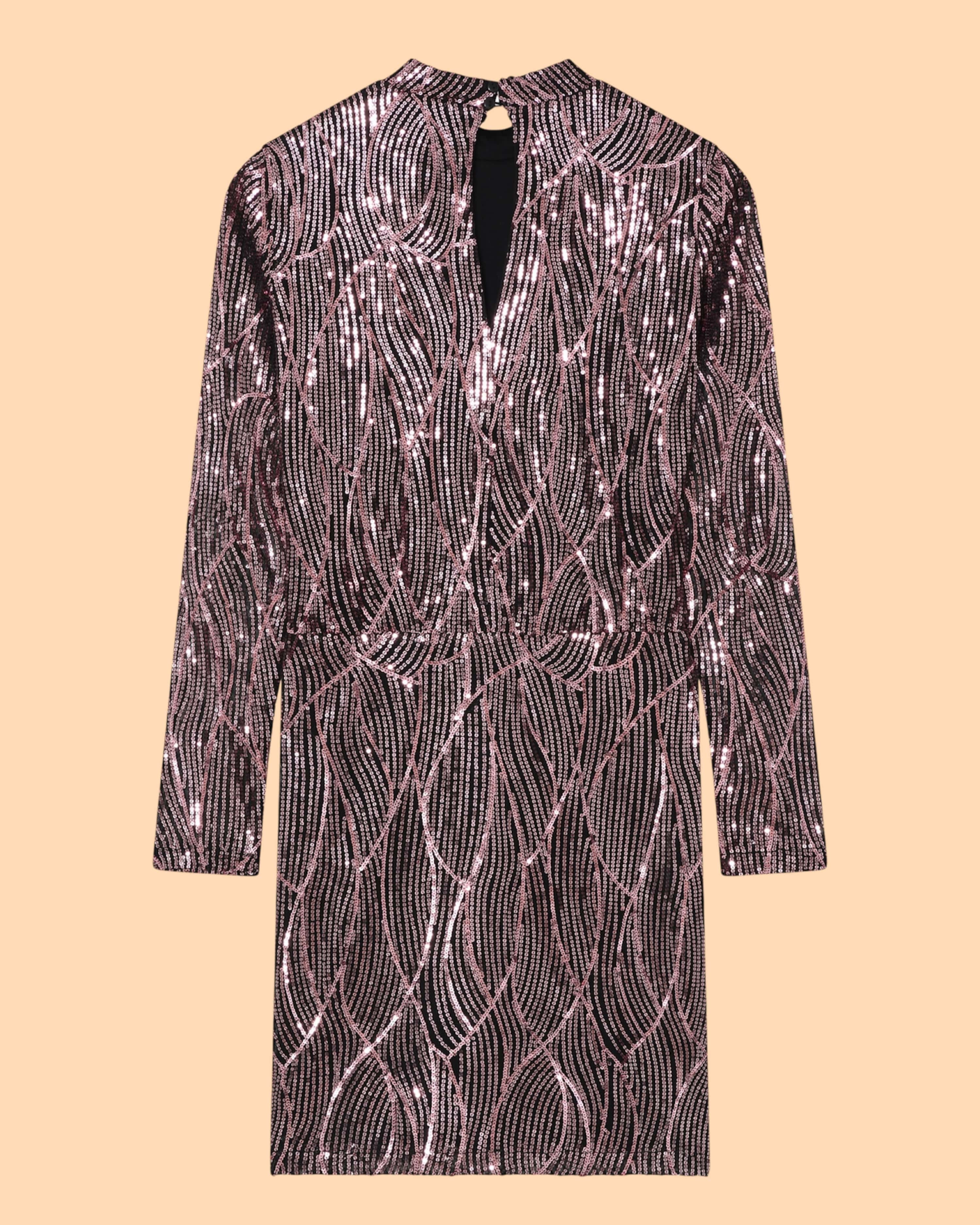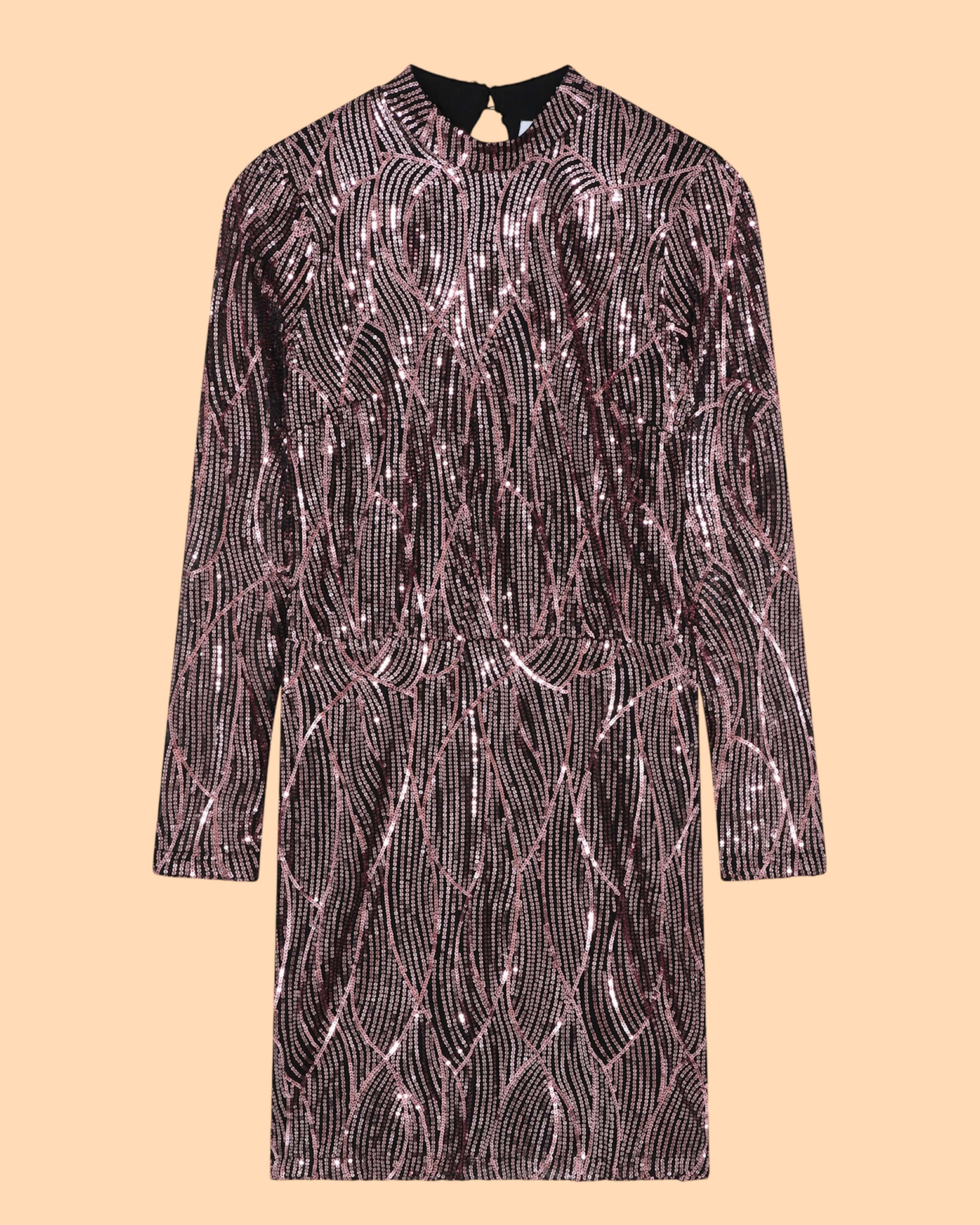 Das Whitley Dress Fig von moves ist ein Minikleid mit roséfarbenen Pailletten, einem kleinen Kragen, langen Ärmeln und einem schönen Cut Out am Rücken mit zwei Knöpfen.